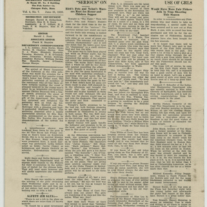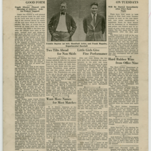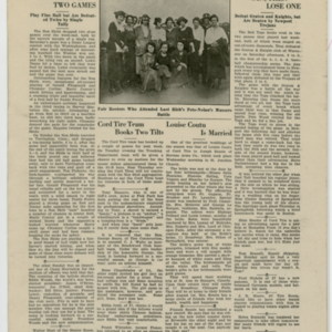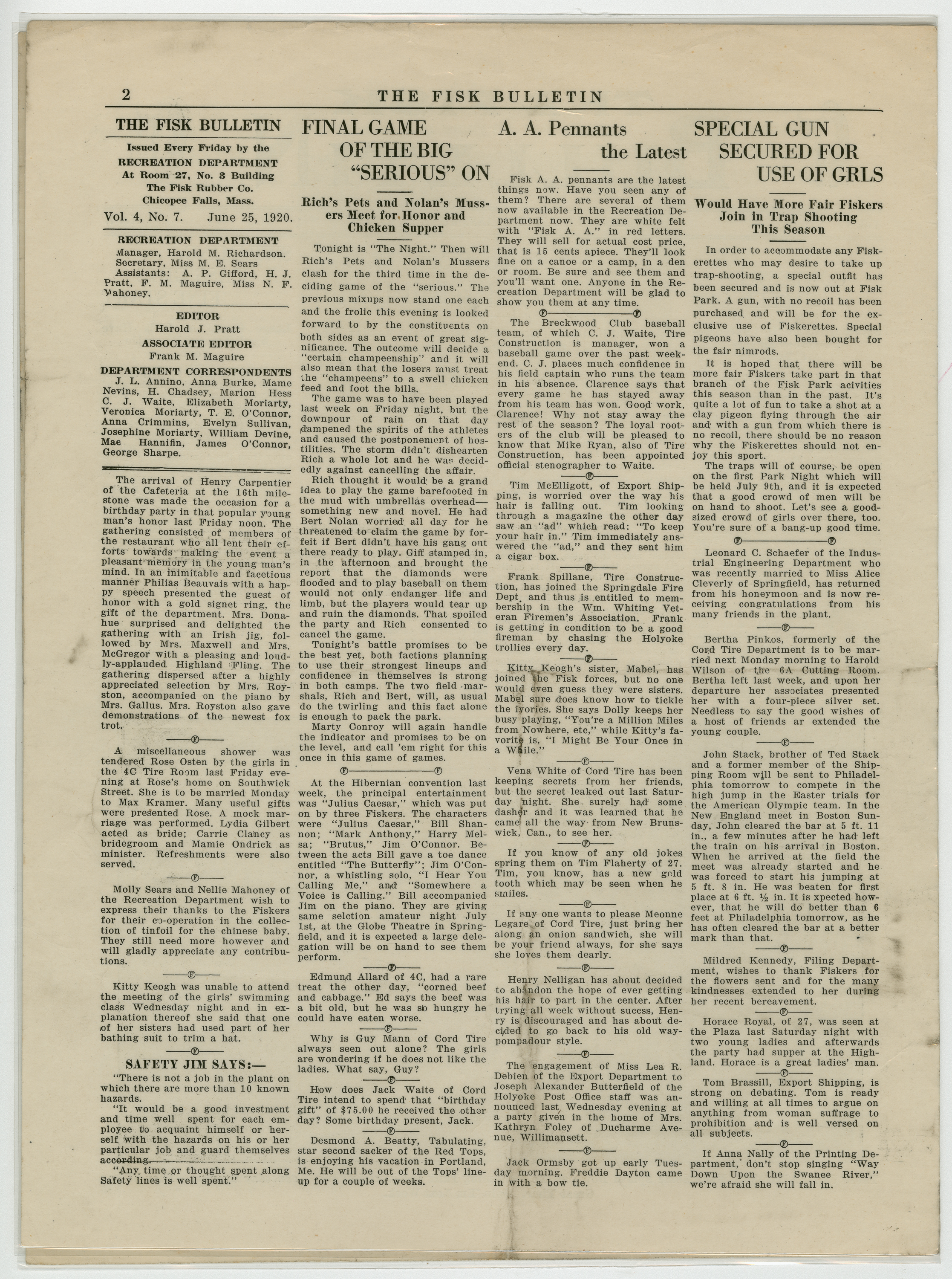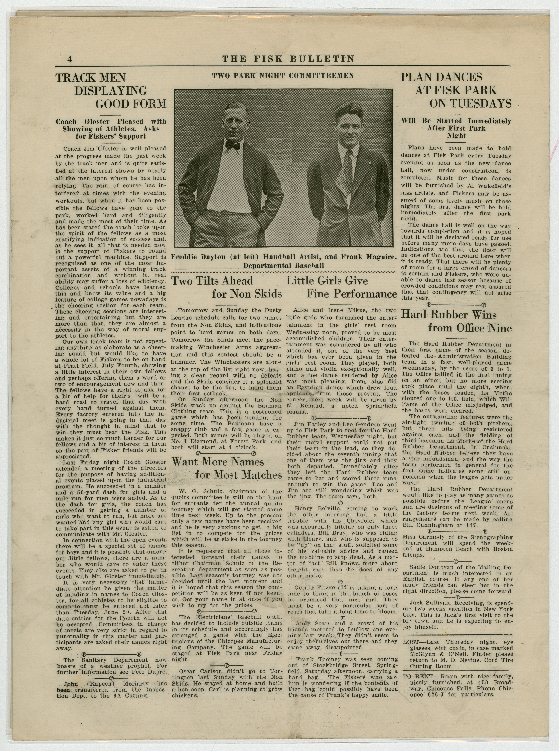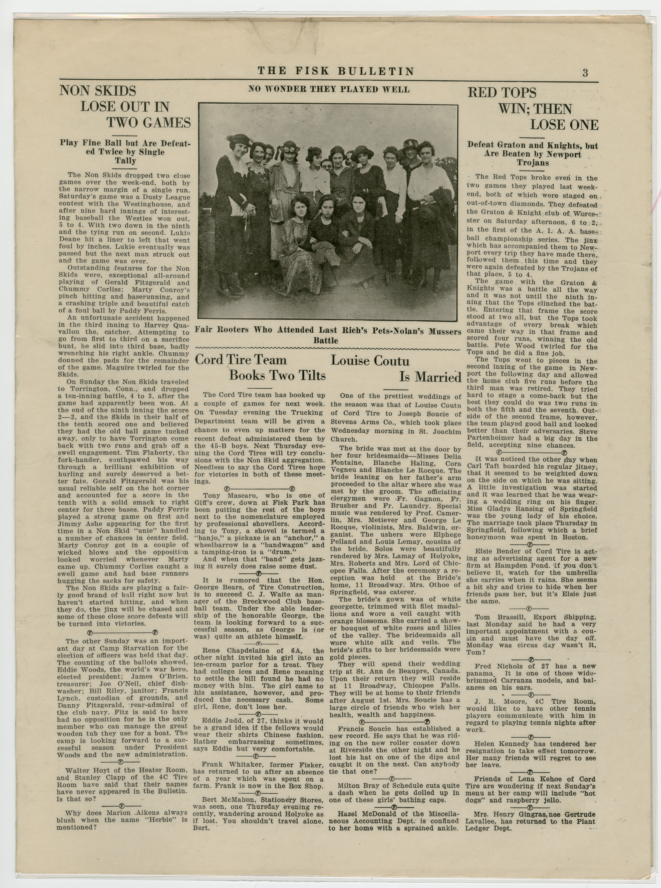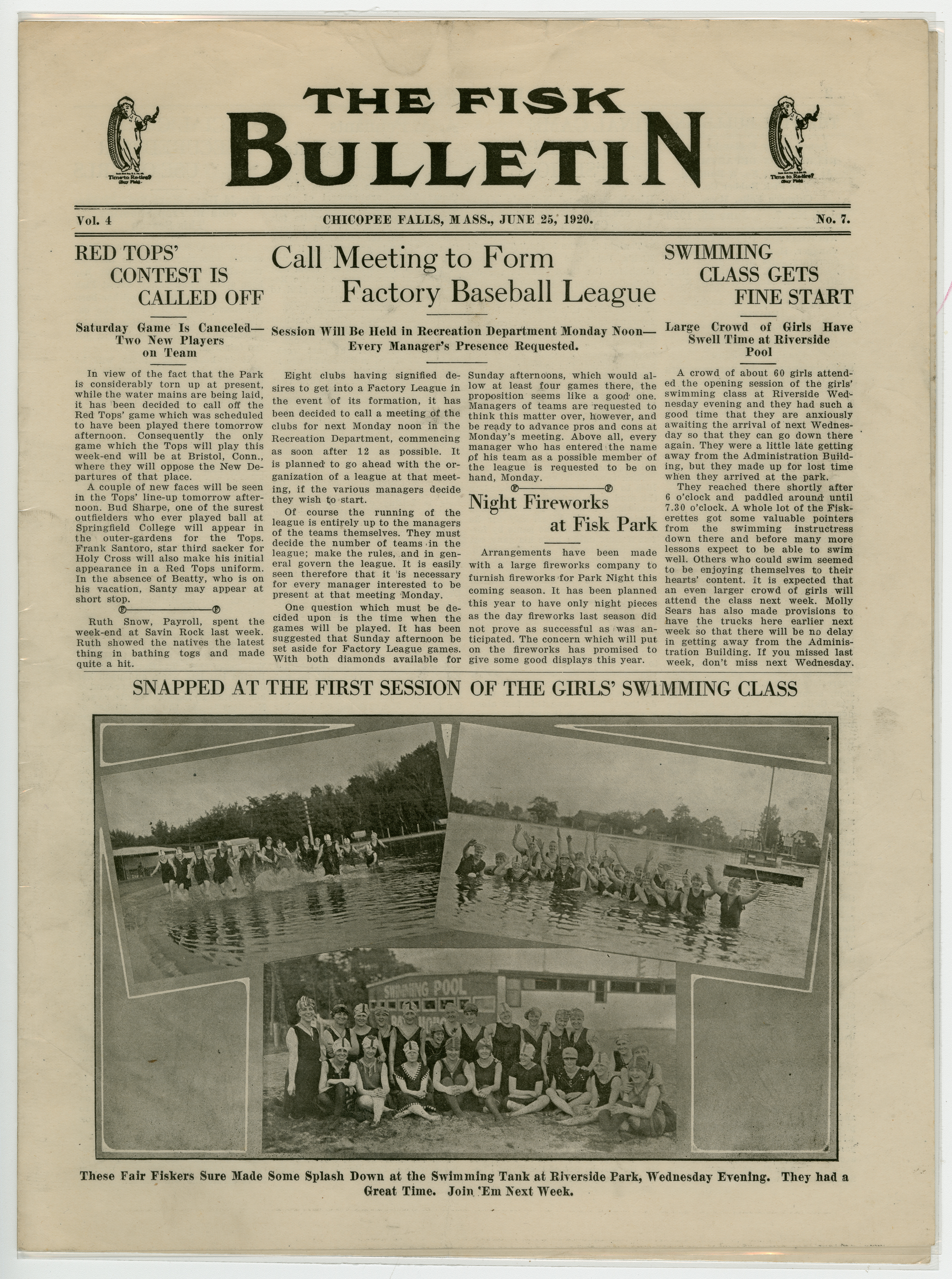 A four page newspaper describing the events related to the social groups and athletic clubs of the Fisk Tire Company for the week of June 25, 1920. Page one leads off with the success of the women's swim class and includes a photo-spread below the story. Also, stories about the Red Tops weekend game being cancelled due to the Fisk Park construction and the start of the factory baseball league are featured. On page two there are several employee notes, stories on the final game of the battle for the chicken supper and a piece on the special guns for the women's trap shooting tournament. On page three is a photograph of some of the fans who showed up at a weekend game at Fisk Park.The stories are about the Red Tops win and loss over the weekend, the Non Skids two losses and the Cord Tire team booking two games. Also, on page three, details of the marriage between Louise Coutu and Joseph Soucie, of the Stevens Arms company. Page four stories include a piece about the improvement of the track team, a piece on the planning of the Tuesday night dances at Fisk Park, a piece on the live performance of Alice and Irene Mikus and a piece on the Hard Rubber win over the Office Nine.