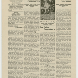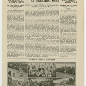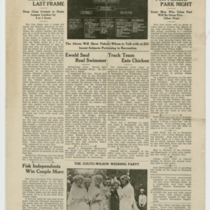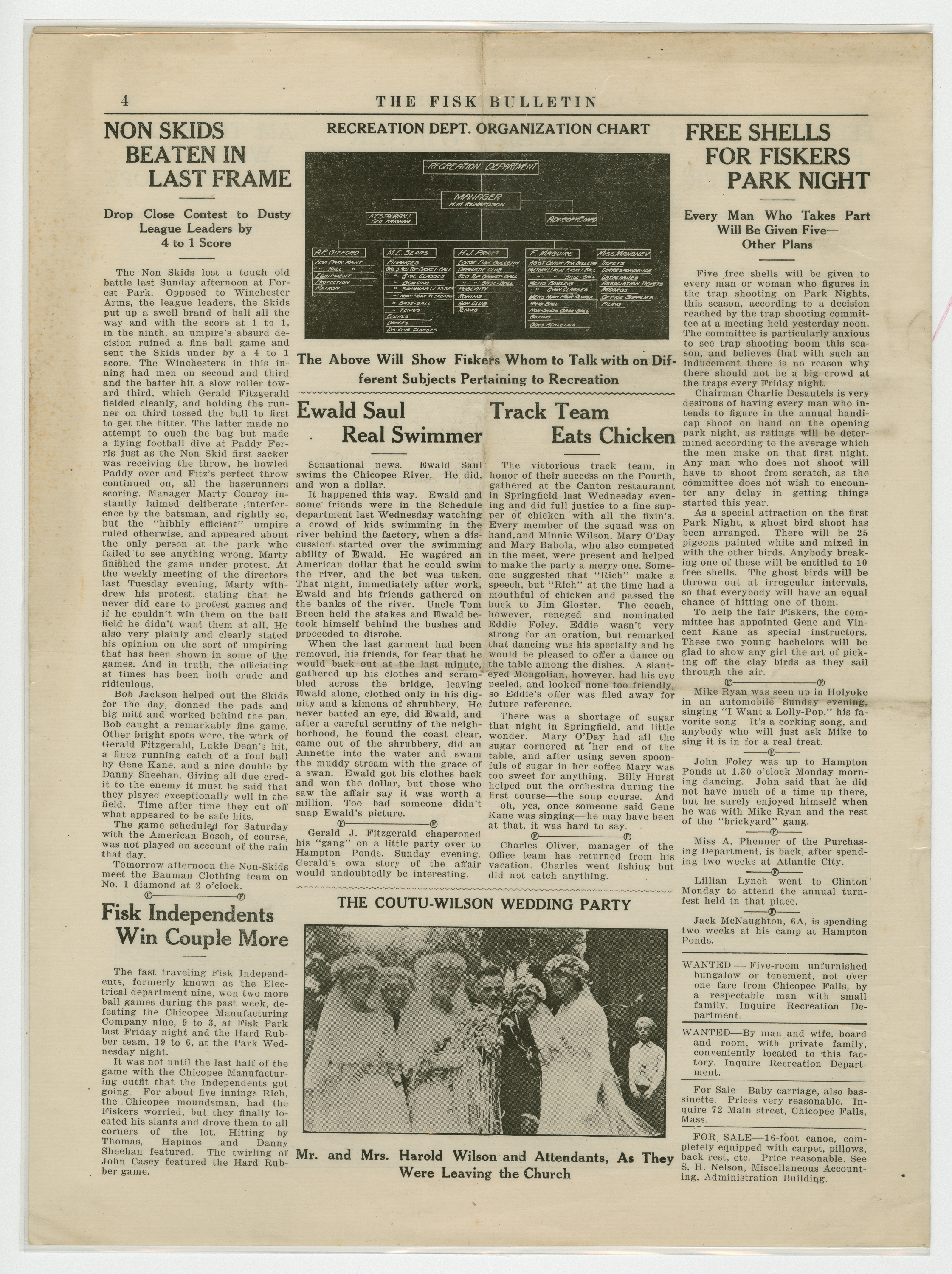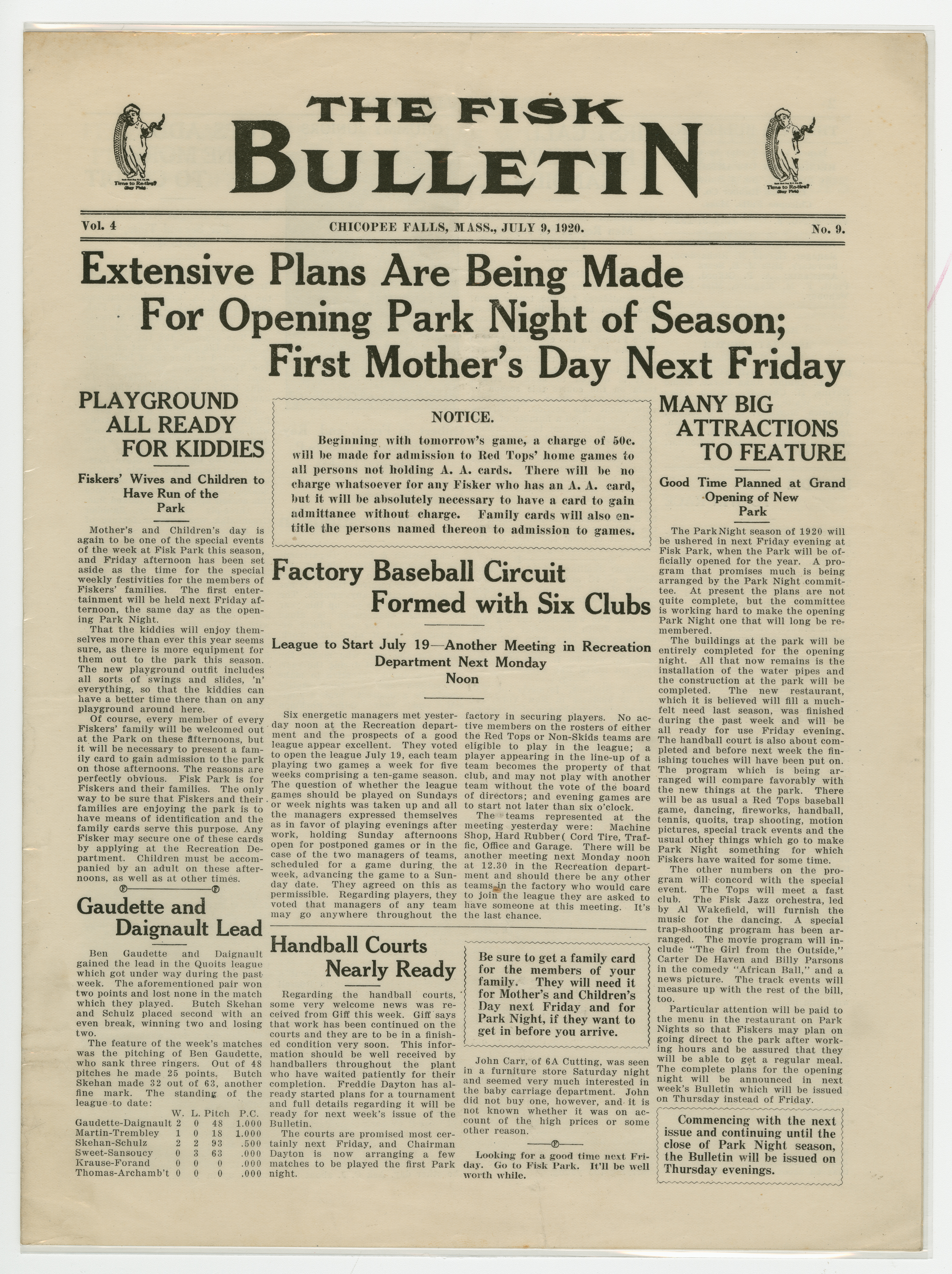 A four page newspaper describing the events related to the social groups and athletic clubs of the Fisk Tire Company for the week of July 9, 1920. Fisk Park is ready to open for the 1920 summer season and page one is totally dedicated to this event. Headlines proclaim the playground is ready for the children to enjoy, the handball courts are in top shape, the factory baseball circuit has six teams and Mother's Day will be the first Friday of the season. Page two leads off with employee notes, a story about a call for tennis candidates, some safety suggestions and the Red Tops win another game. The track team and its feats highlight page three. Photographs from the latest meet stretch along the bottom of the page. On page we four we are treated to stories about the track team eating a full chicken dinner, Ewald Saul swims the Chicopee River for a dollar, the Non-Skids lose in the ninth inning and there will be free skeet-shooting shells for any Fisker on Park Night. A photograph of Mr. and Mrs. Harold Wilson and attendants also appears on the page.