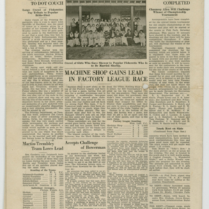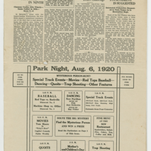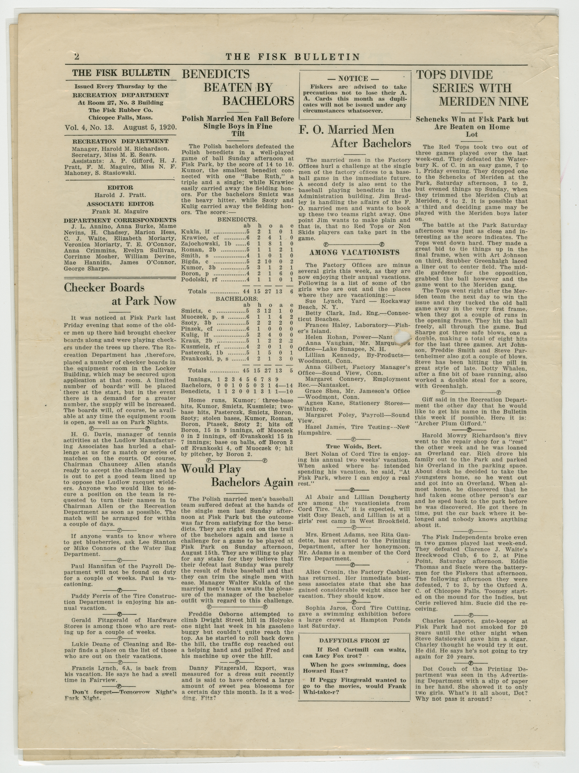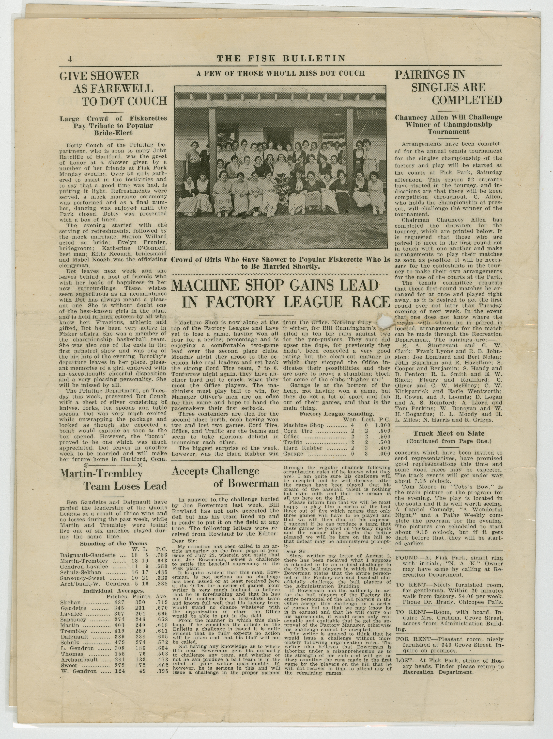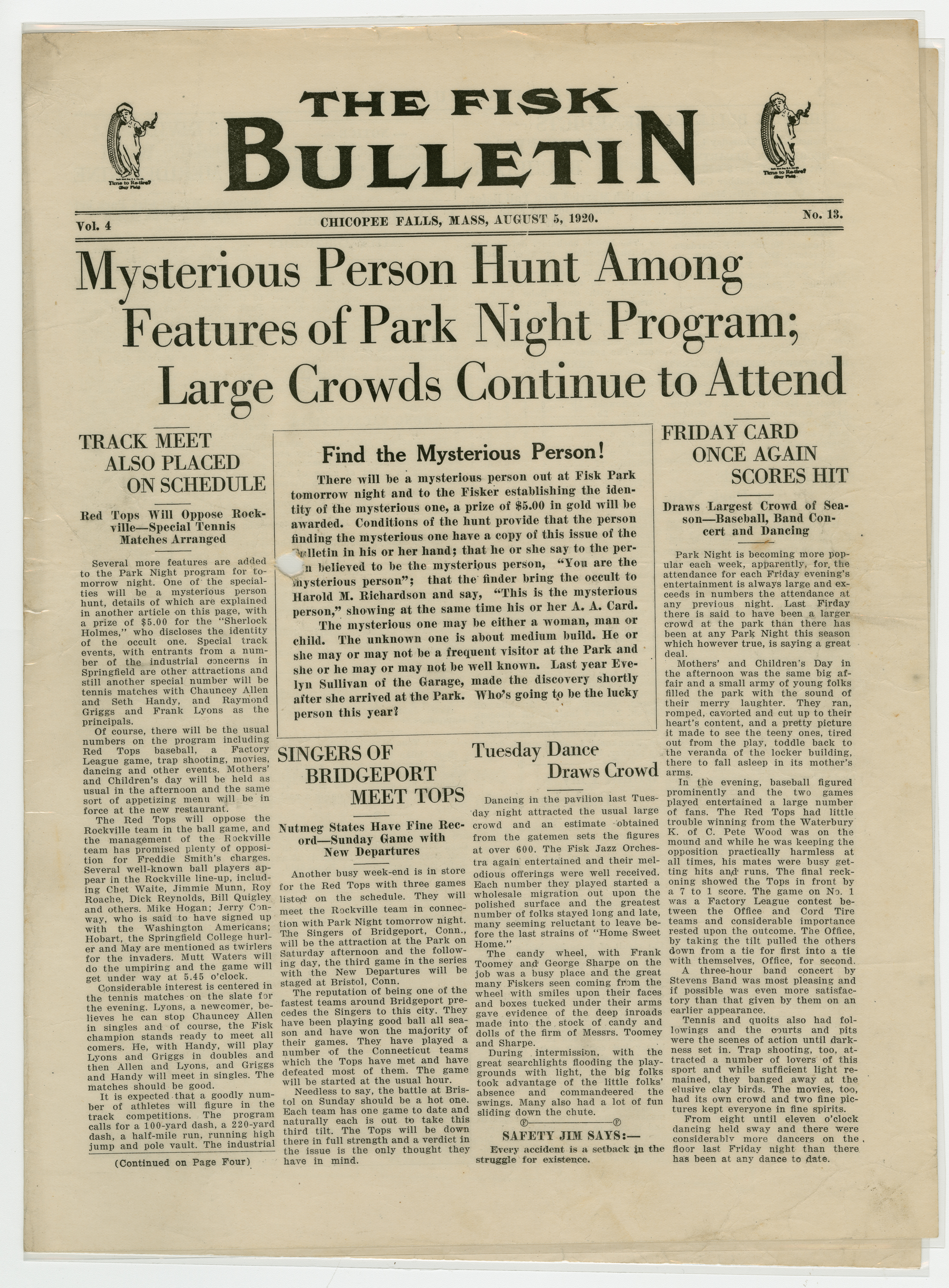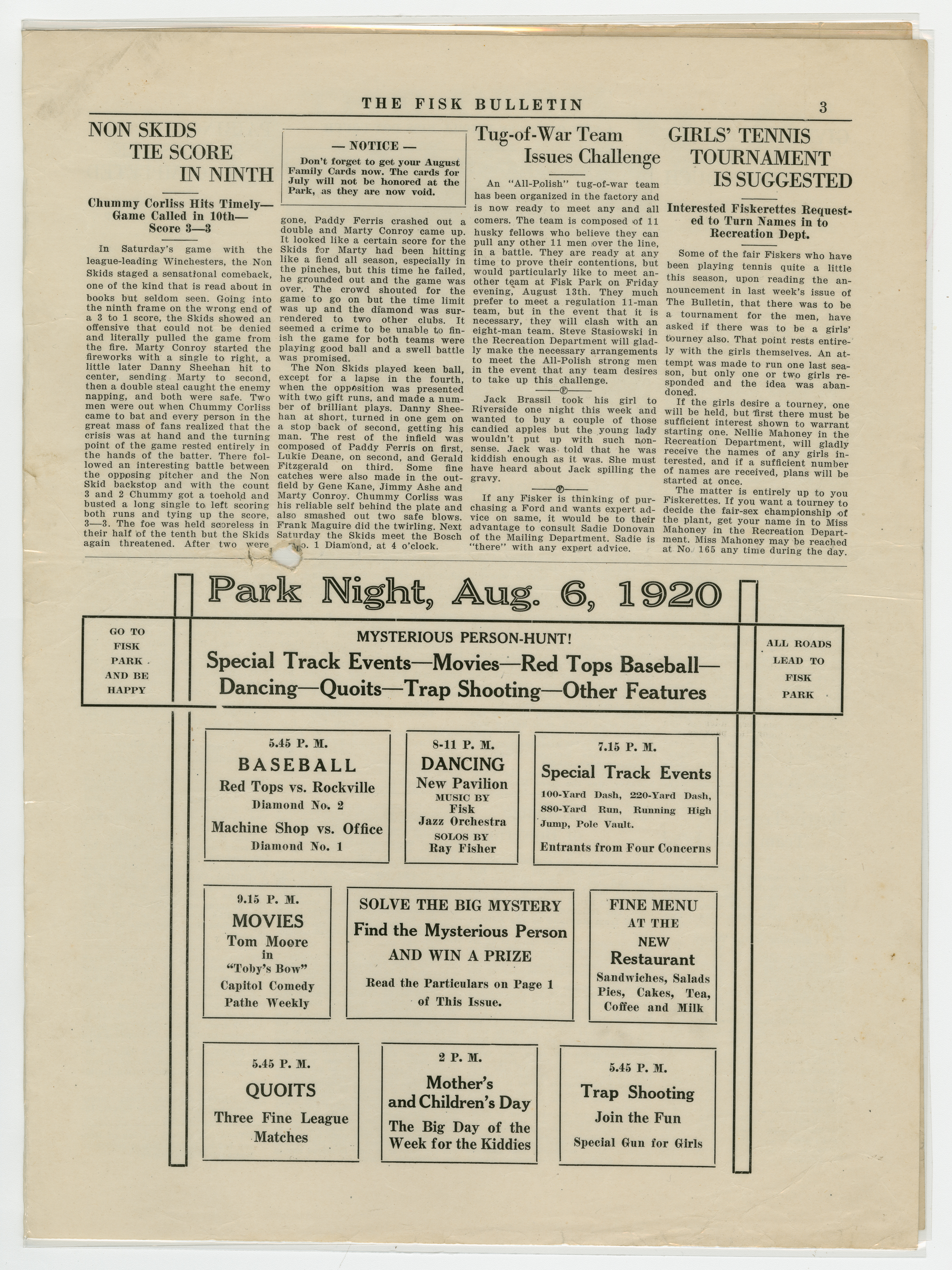 A four page newspaper describing the events related to the social groups and athletic clubs of the Fisk Tire Company for the week of August 5, 1920. The mysterious person hunt is back among the featured events at Park Night. The rules and prize are featured on page one. The track team, the Red Tops and tennis matches are lined up for the weekend at Fisk Park, said page one of the Fisk Bulletin. Page two is a mashup of stories about all things Fisk, including an announcement about the checkerboards being ready at the park and the results of the married men vs. the bachelors baseball game. On page three, the tug-of-war team issues a challenge, a women's tennis tournament is suggested and the Non Skids tie in ten innings. Also, the next Park Night schedule of events appears at the bottom half of the page. Page four sends Dot Couch off to her new life with a story and a photograph of attendees. The Machine Shop gains a lead in the factory league race and the pairings of the tennis tournament are announced.