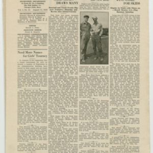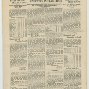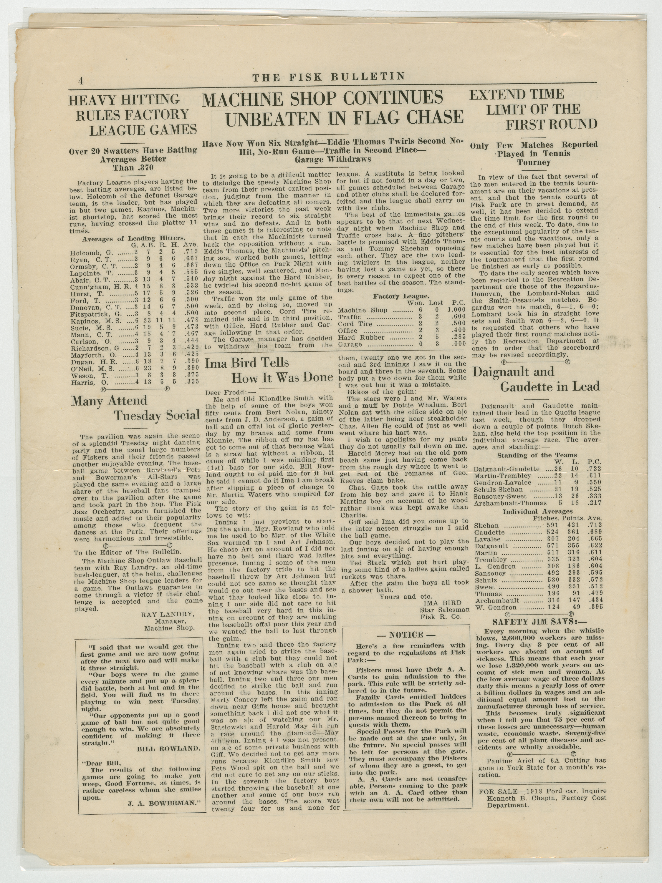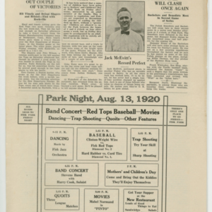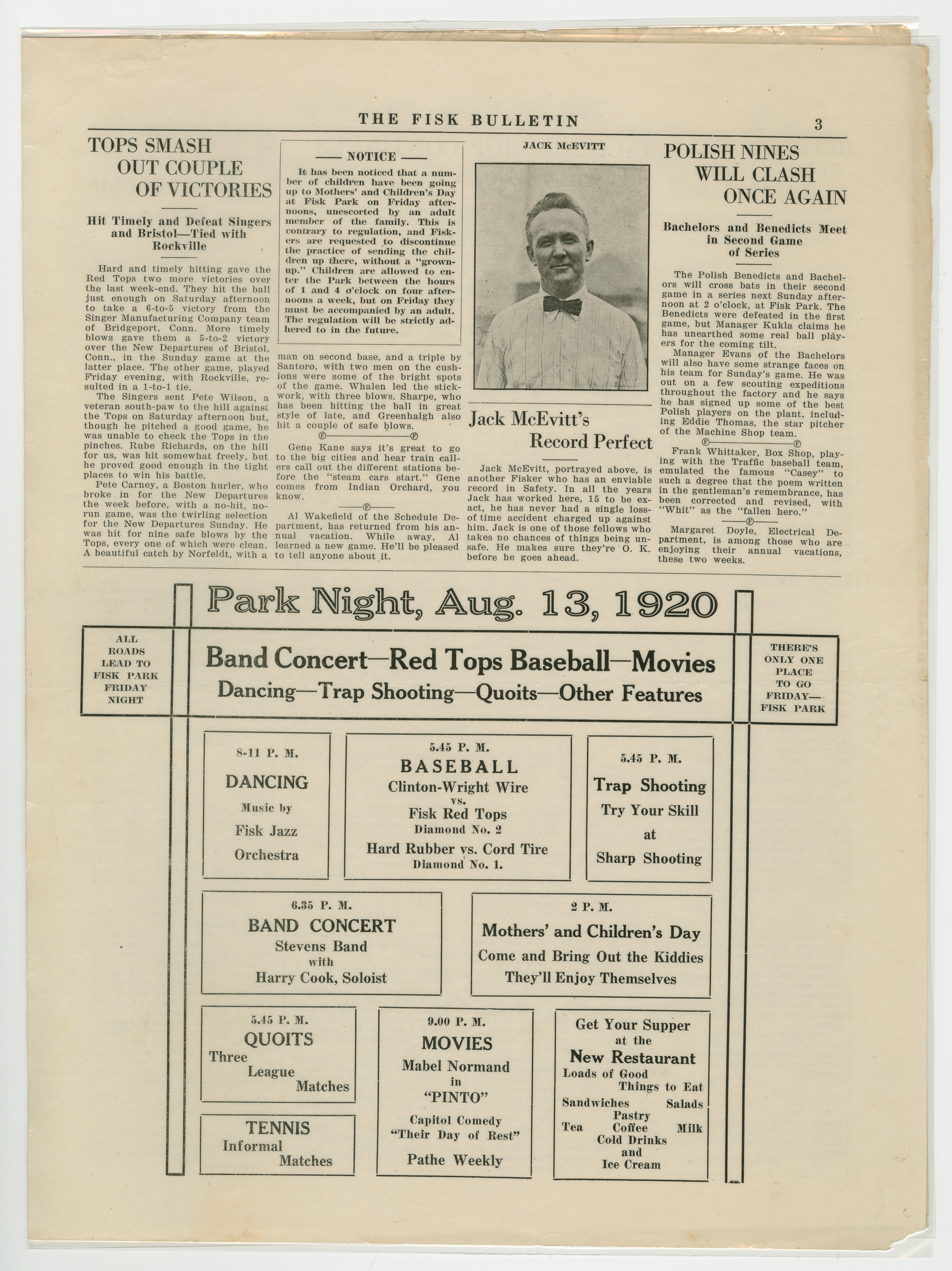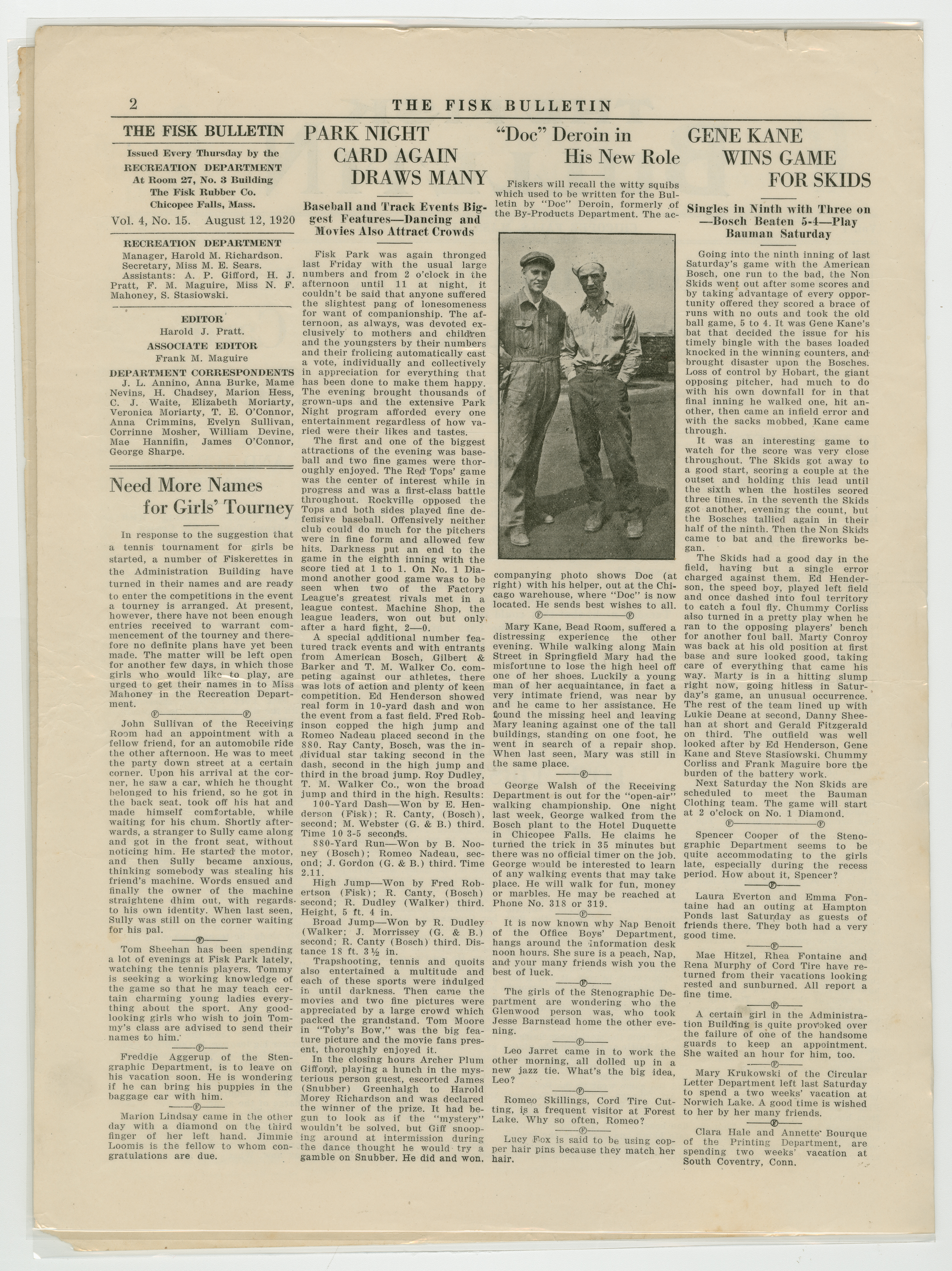 A four page newspaper describing the events related to the social groups and athletic clubs of the Fisk Tire Company for the week of August 12, 1920. The Bigelow-Hartfords are coming to town and they are bringing a crowd, or so says page one of the Bulletin. A call is out for all employees to attend the Red Tops game Saturday to show the visiting team who can cheer louder. In other page one news, the Boweman All-Stars lost the first game of the series for baseball bragging rights and the Red Tops have three tough games in a row. Page two highlights include an update and photograph on "Doc" Deroin, formerly of the By-Products Department, and new job in Chicago, a story on Gene Kane hitting a game winning single for the Non Skids and there is a need for more participants in the women's tennis tournament. The August 13, 1920 Park Night schedule and stories on the Red Tops win, the next clash of the bachelors and benedicts and Jack McEvitt's safety record appear on page three. Batting averages, baseball league standings and the quoits league make up the news on page four.