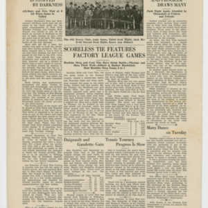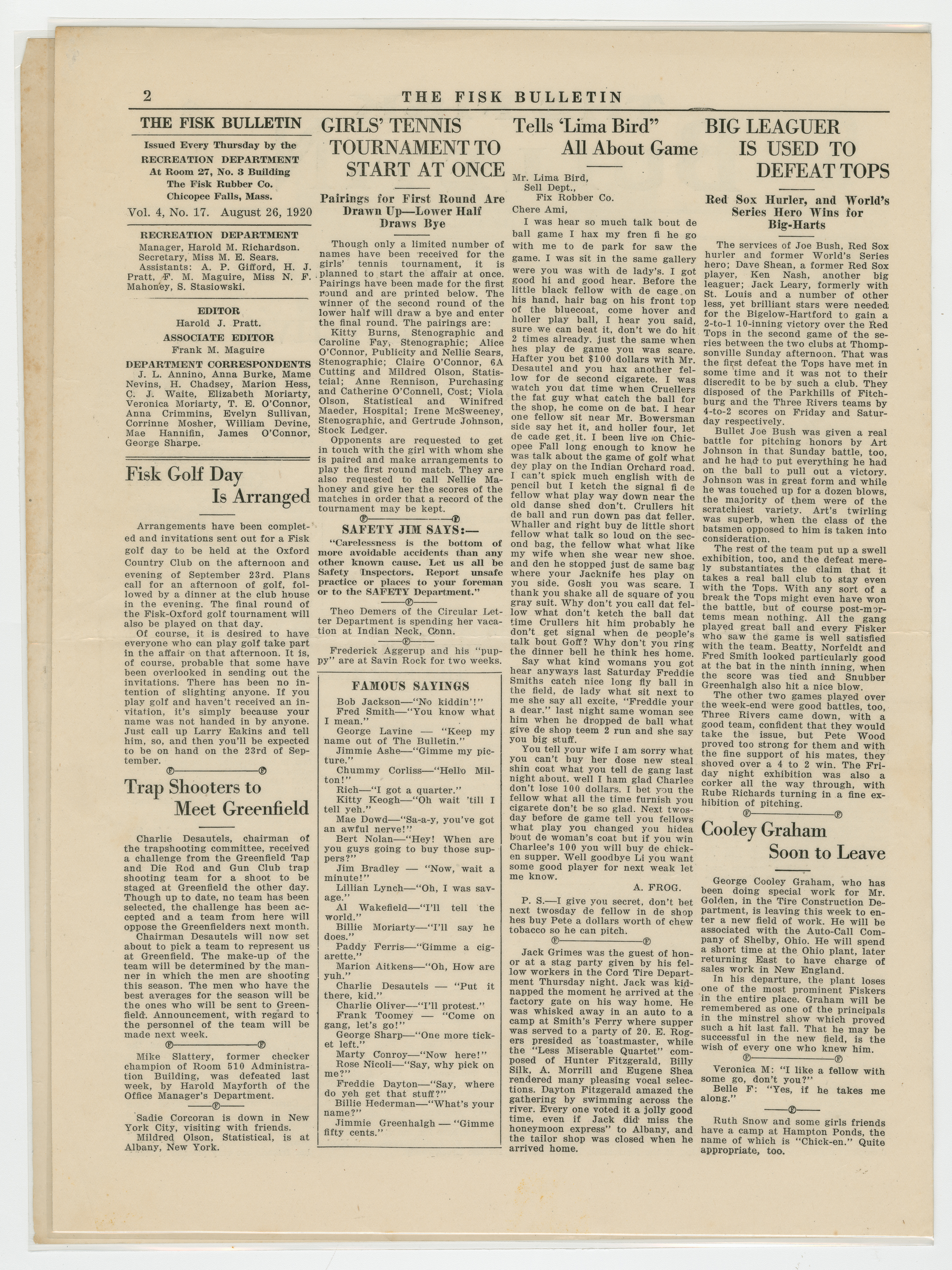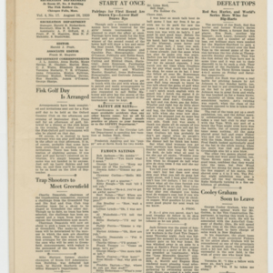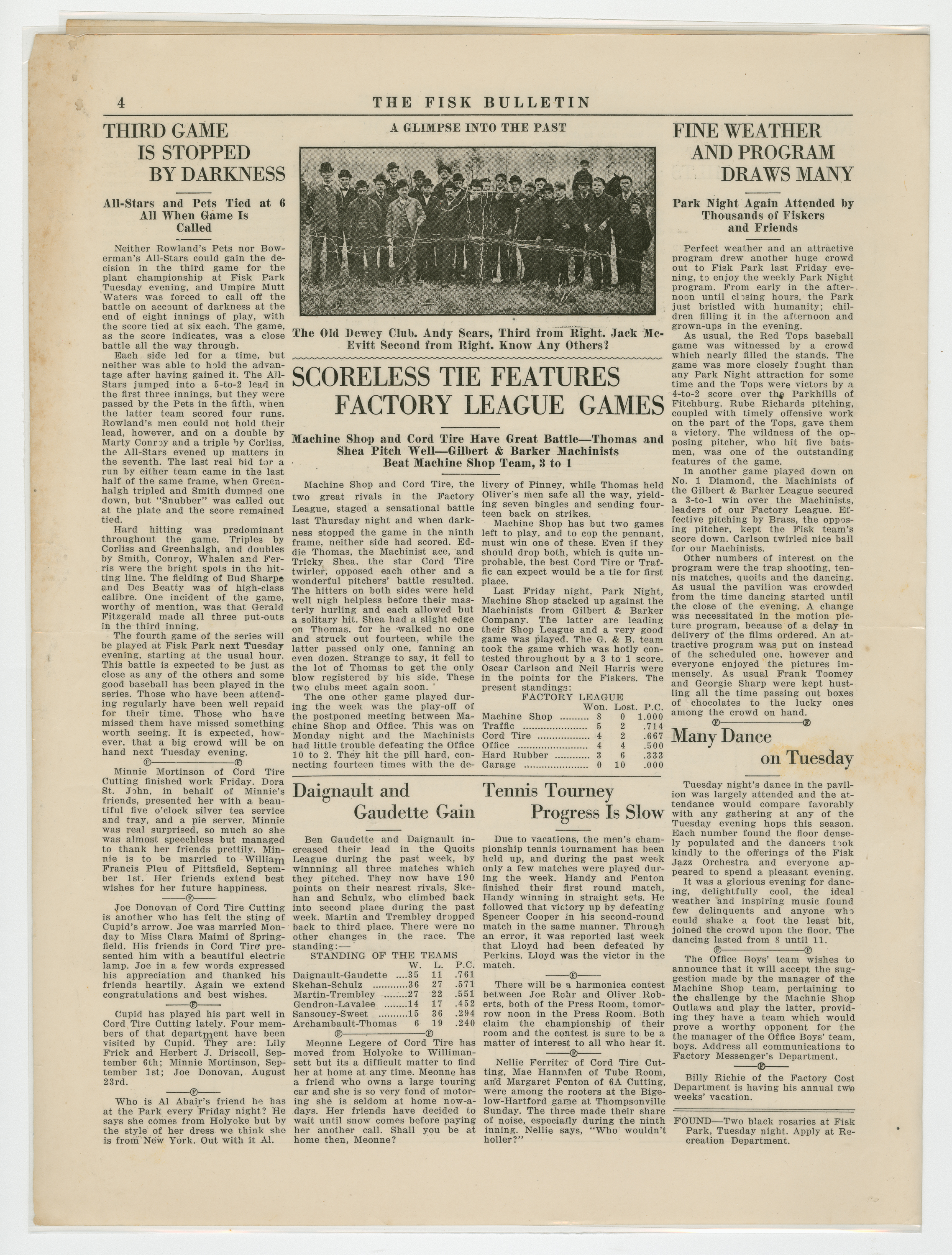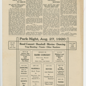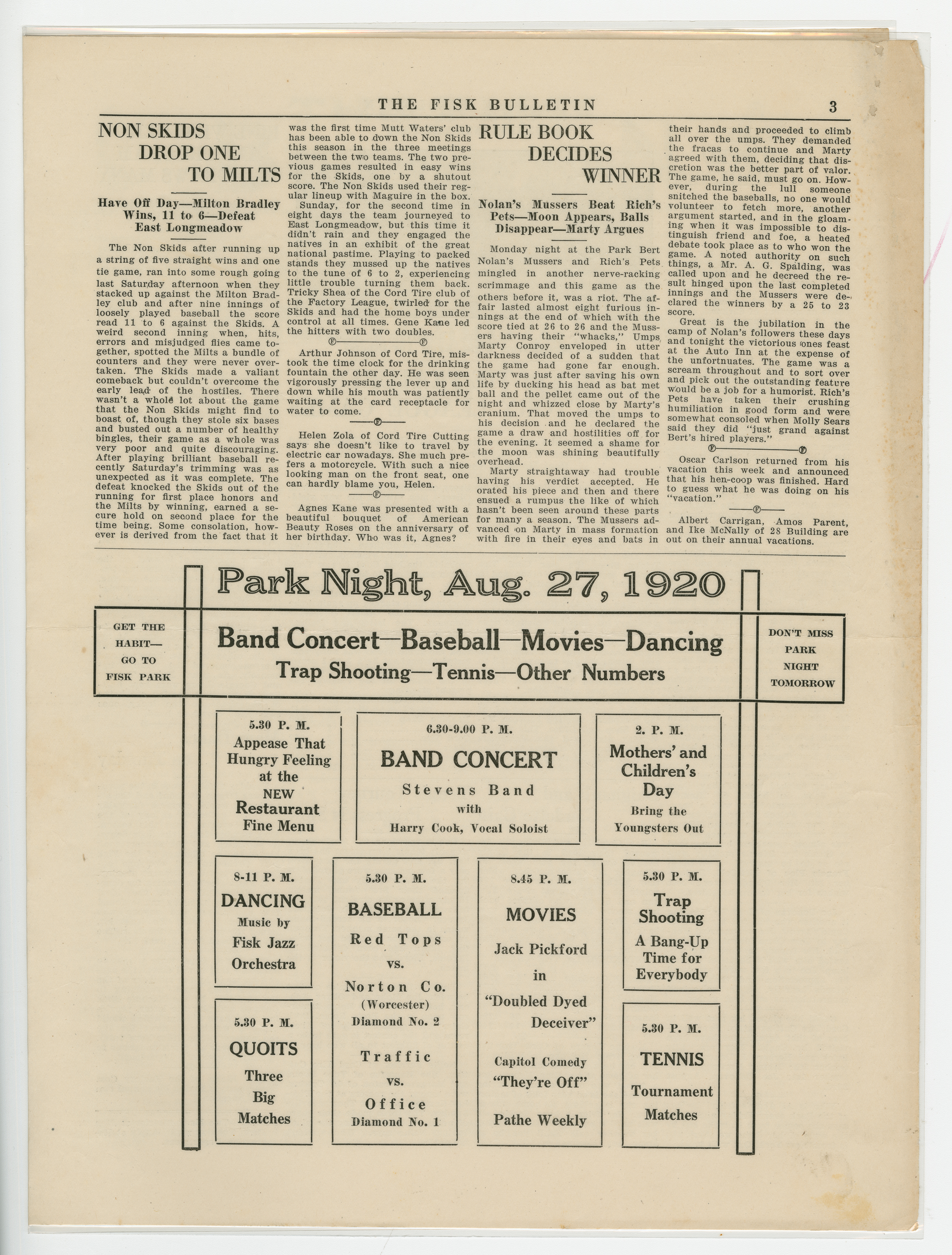 A four page newspaper describing the events related to the social groups and athletic clubs of the Fisk Tire Company for the week of August 26, 1920. Page one is all about the big plans for the Labor Day Weekend at the park. The track meet will be a big one. The Non Skids will be at the park on Saturday. The Red Tops have games against the Bristolites and the Norton Nine. And, the Stevens Band, with Harry Cook on vocals, will perform. Page two is the usual briefs and employee notes. Page three includes stories on the Non Skids loss and the wild post-game between the Pet's and the Mussers after the game was called on account of darkness. The game with the All-Stars and the Pets is also on page four, along with the Factory League highlights and a wrap-up of the latest Park Night and Tuesday night dance.