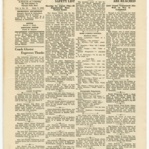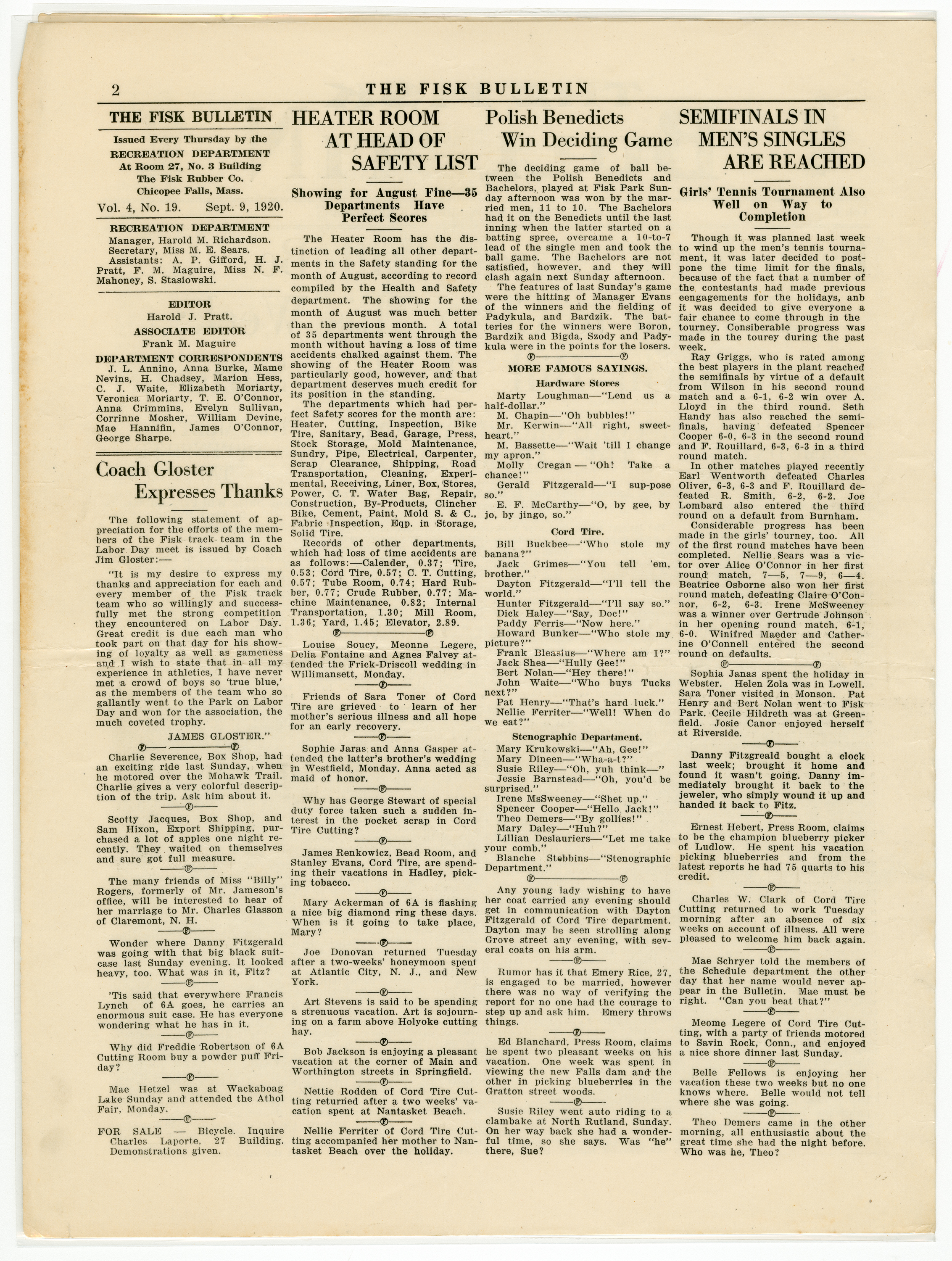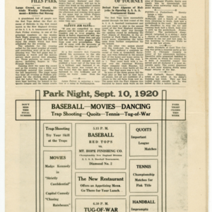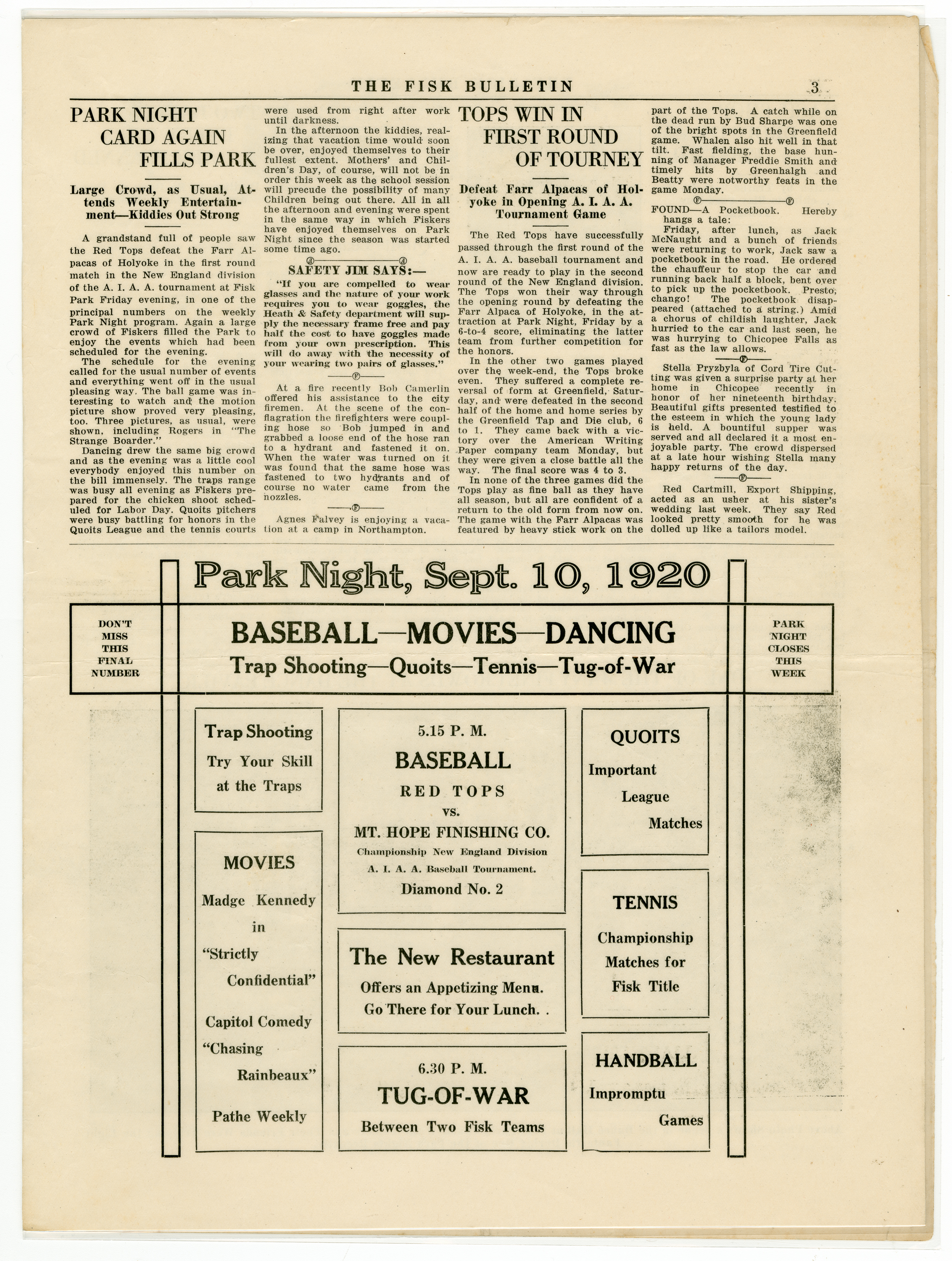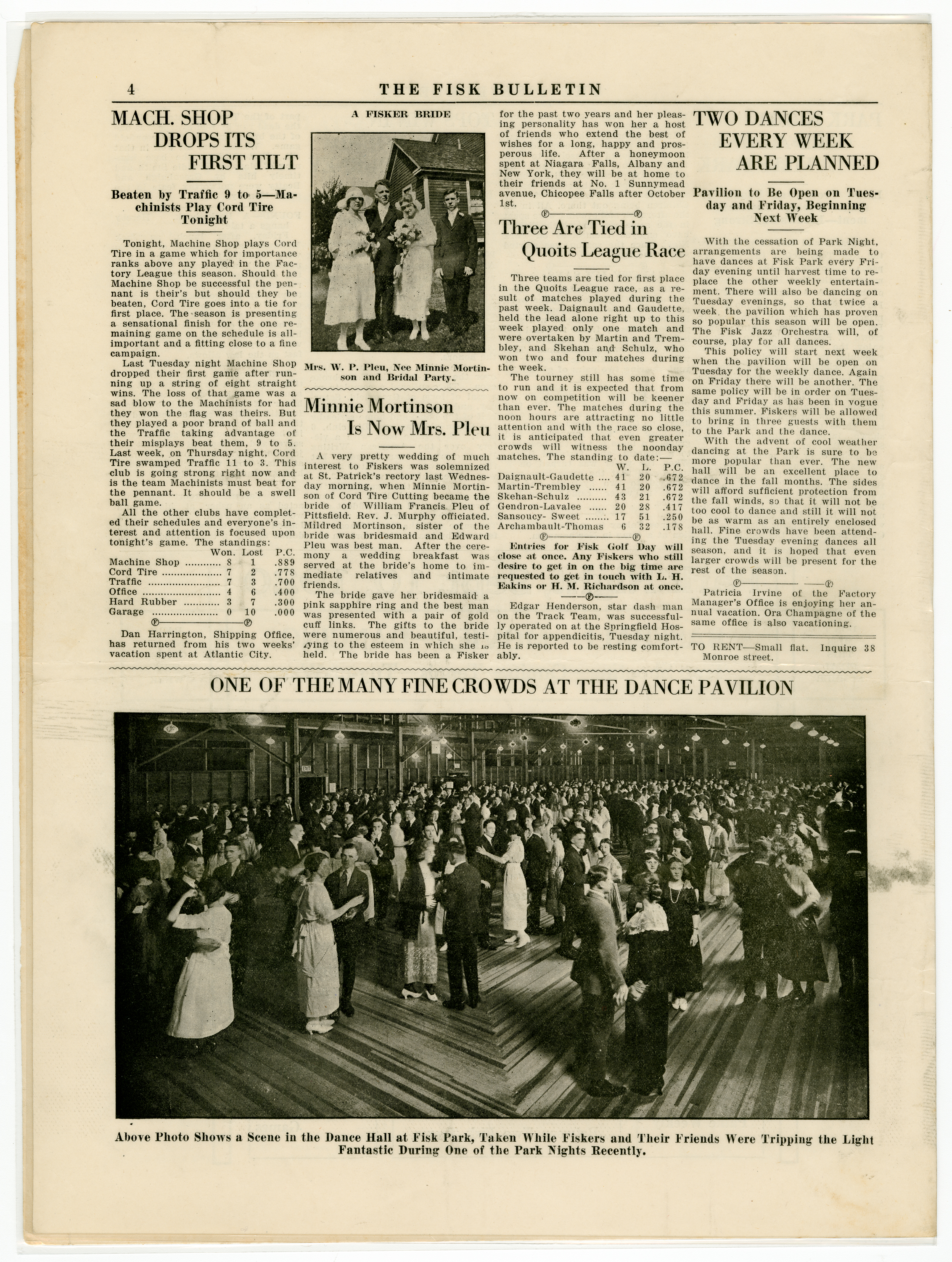 A four page newspaper describing the events related to the social groups and athletic clubs of the Fisk Tire Company for the week of September 9, 1920. Fall is coming and the Park Night season is coming to a close. Page one recaps the record breaking Labor Day weekend attendance and previews the big games coming on the final weekend of Park Night. Page two is crowded with employee notes, a story about the Heather Room leading the safety list, one about the married men winning baseball bragging rights and a brief on the tennis semi-final matches. Page three tells us that the Red Tops won in the first round of their playoffs and the final Park Night card is full of fun. Also, the schedule for the final Park Night is on the bottom half of the page. A huge photograph from one of the recent dances dominates page four along with stories about the Machine Shop losing to the Traffic Department, the marriage of Minnie Mortinson and the Pavilion being open Tuesdays and Friday in the fall for dances.