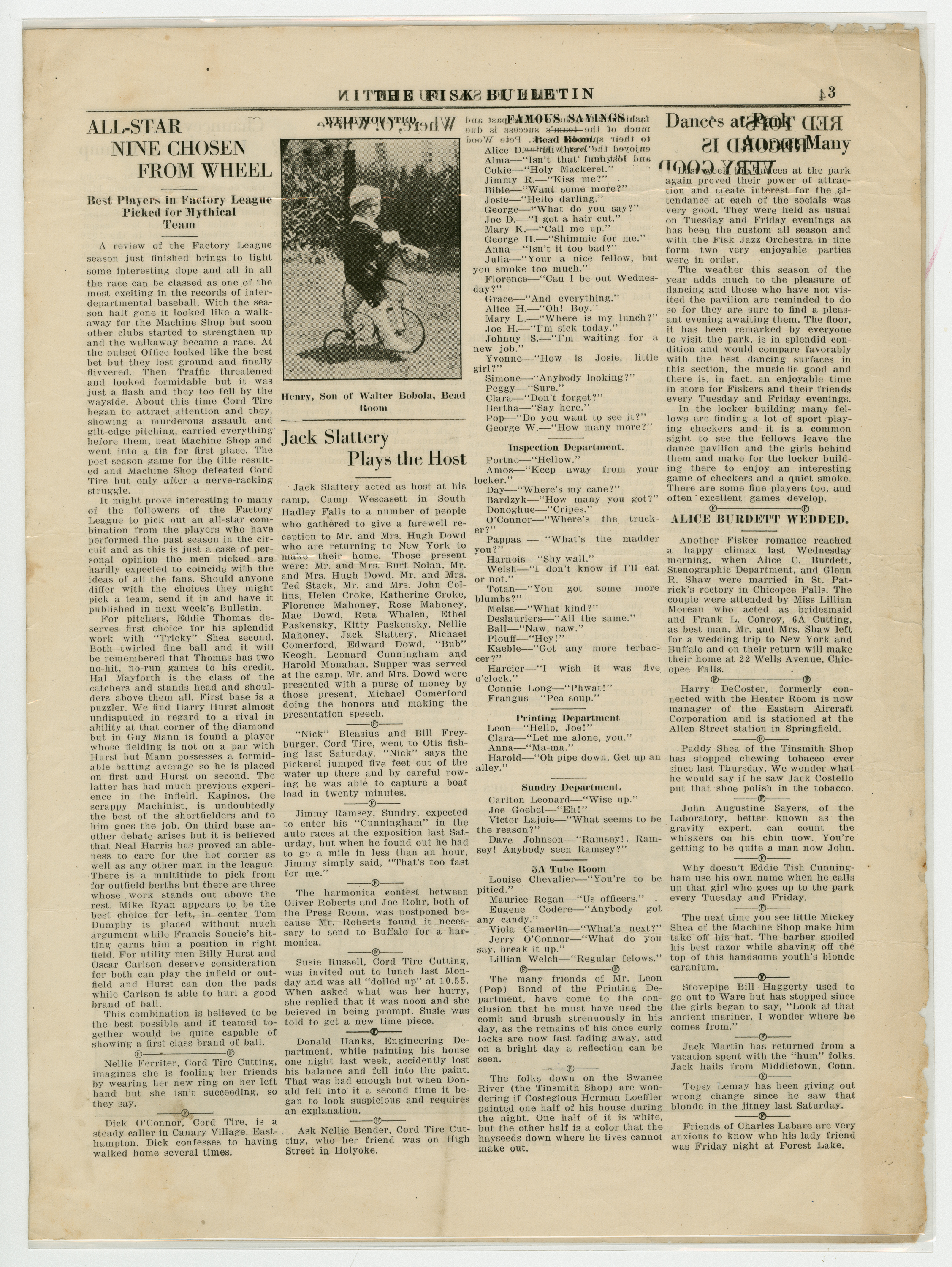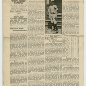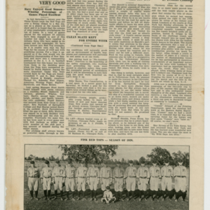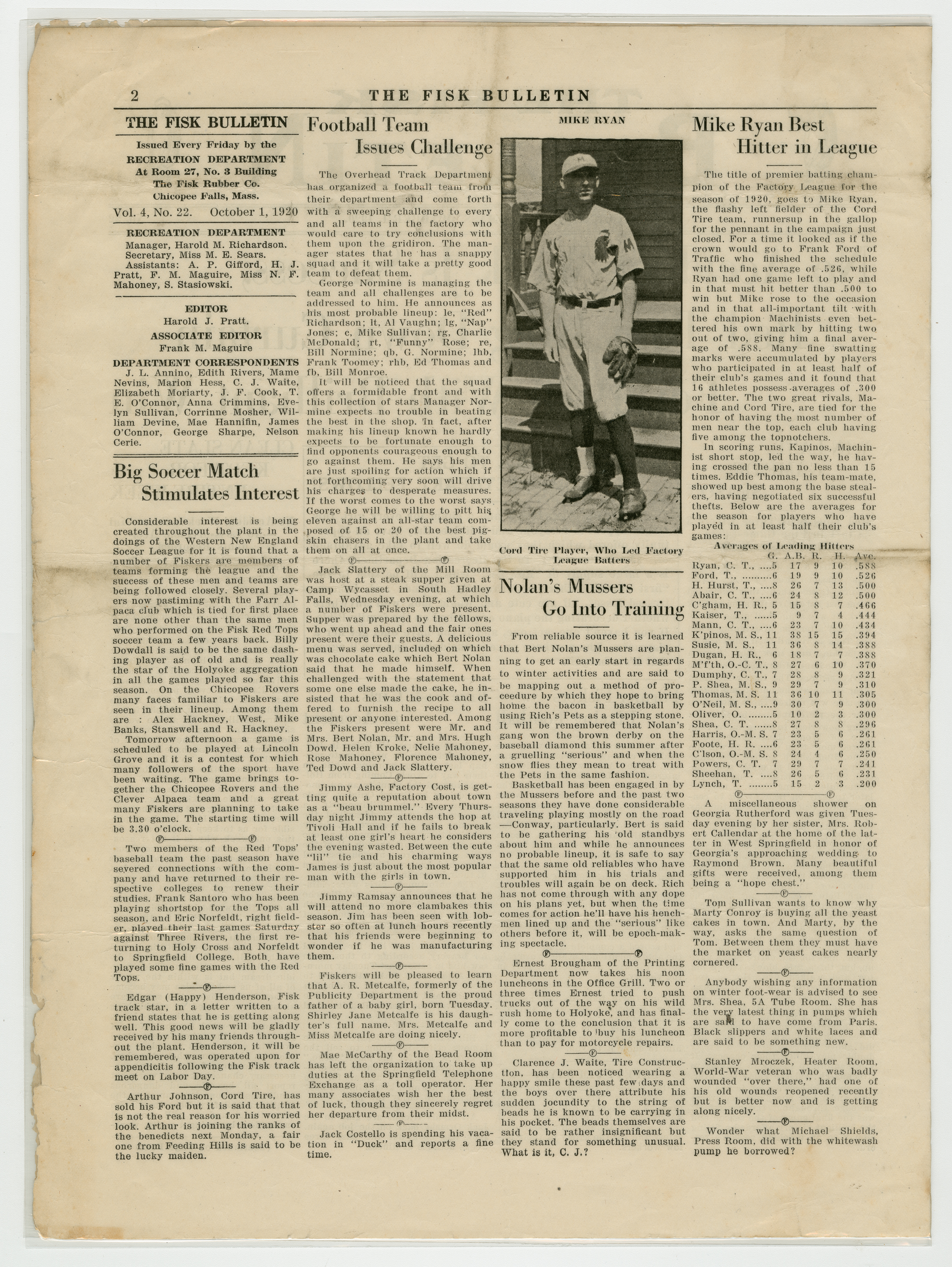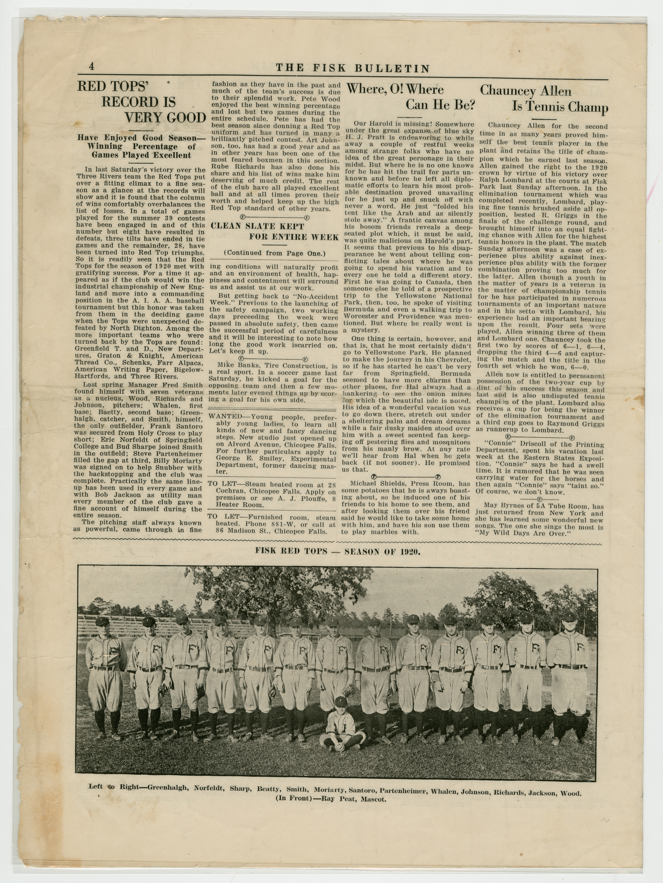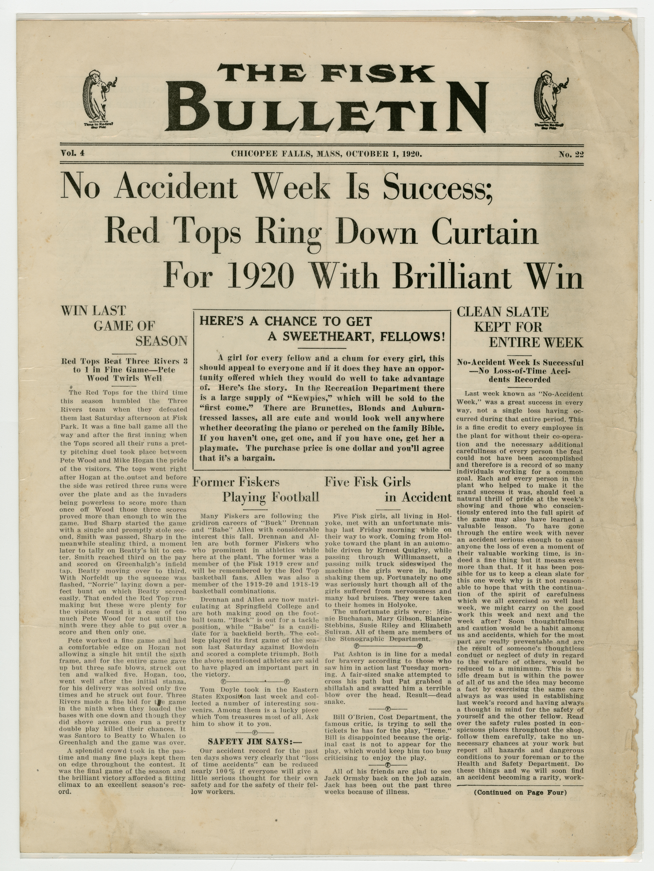 A four page newspaper describing the events related to the social groups and athletic clubs of the Fisk Tire Company for the week of October 1, 1920. Page one headlines are "No Accident Week is a Success," "Red Tops Ring Down Curtain For 1920 With Brilliant Win," "Former Fiskers Playing Football" and "Five Fisk Girls in Accident." On page two is another story about Mike Ryan and his factory league batting average of .588. There is a story on the Western New England Soccer League. A story about the football team issuing a challenge to other teams in the factory league. Finally, Bert Nolan is taking his Mussers into training early for the winter sports season. On page three the Bulletin has chosen its factory league fantasy baseball team. Rounding out the page is a mix of employee notes and announcements. Page four announces Chauncey Allen as the tennis tournament champion, recaps the Red Tops successful season and reveals H.J. Pratt, Editor of the Bulletin, has gone on a two week vacation, but didn't tell anyone where he was going. On the bottom of the page is photograph of the 1920 Red Tops baseball team.