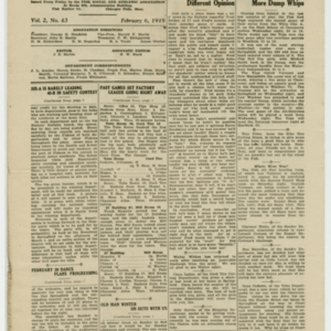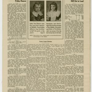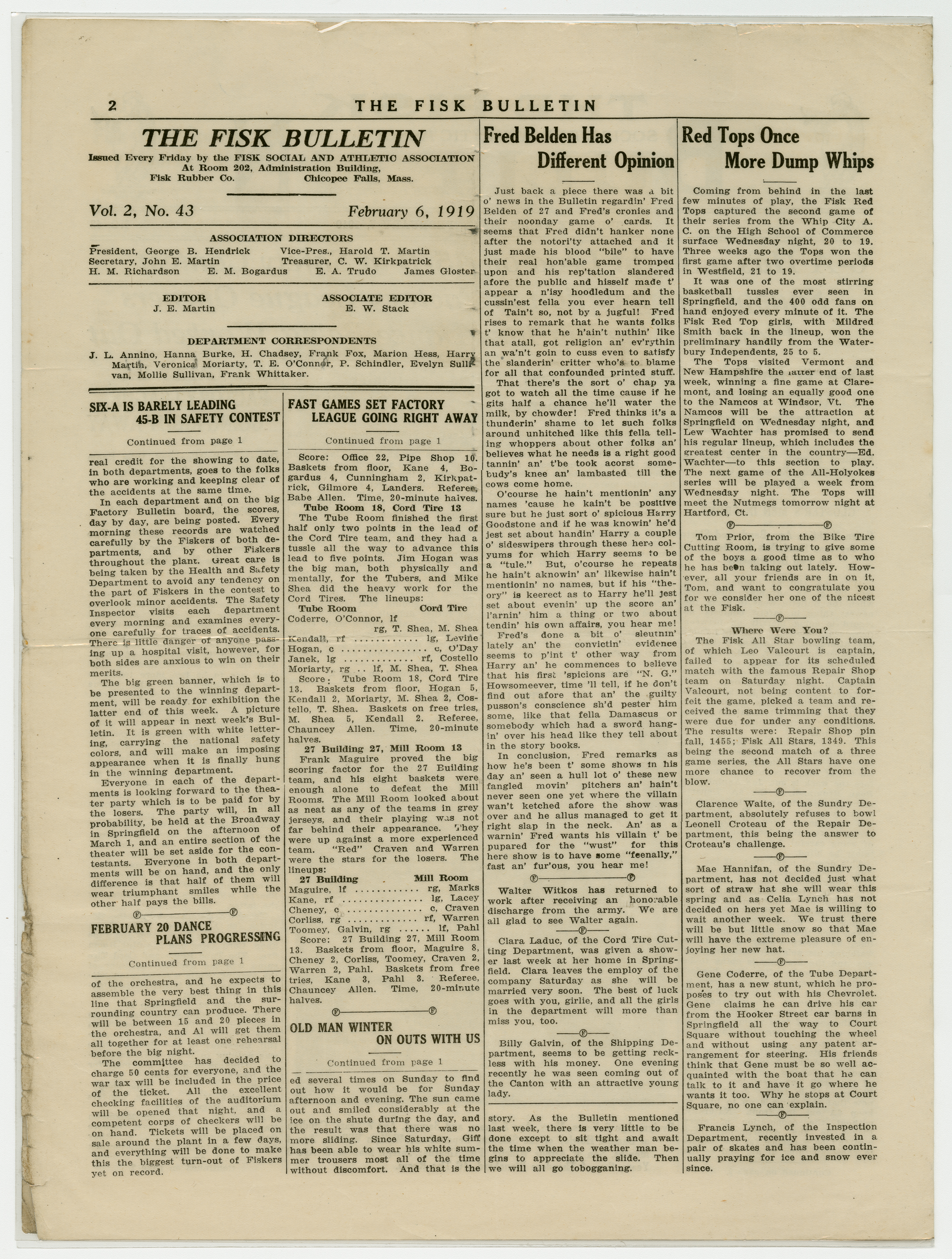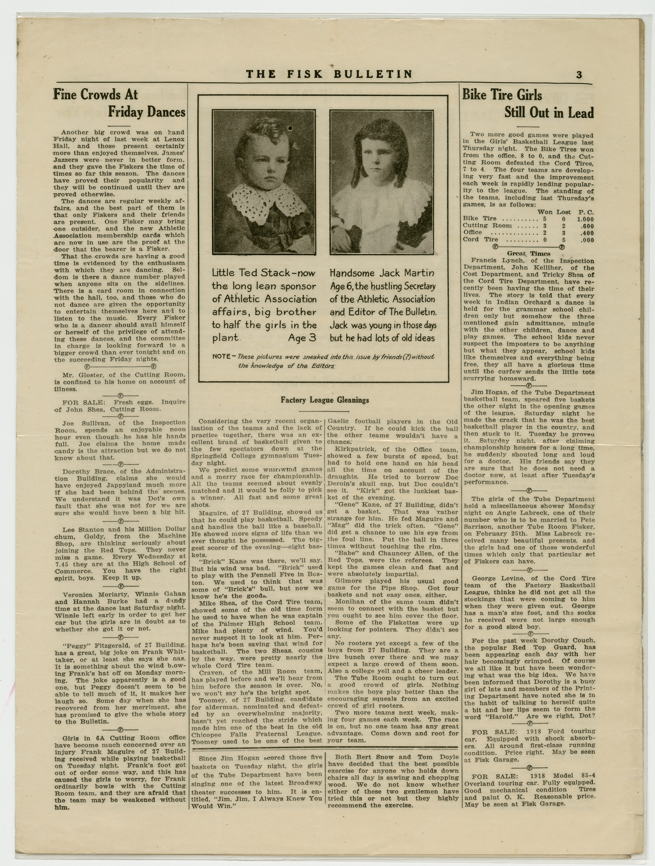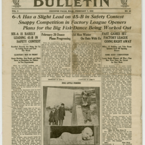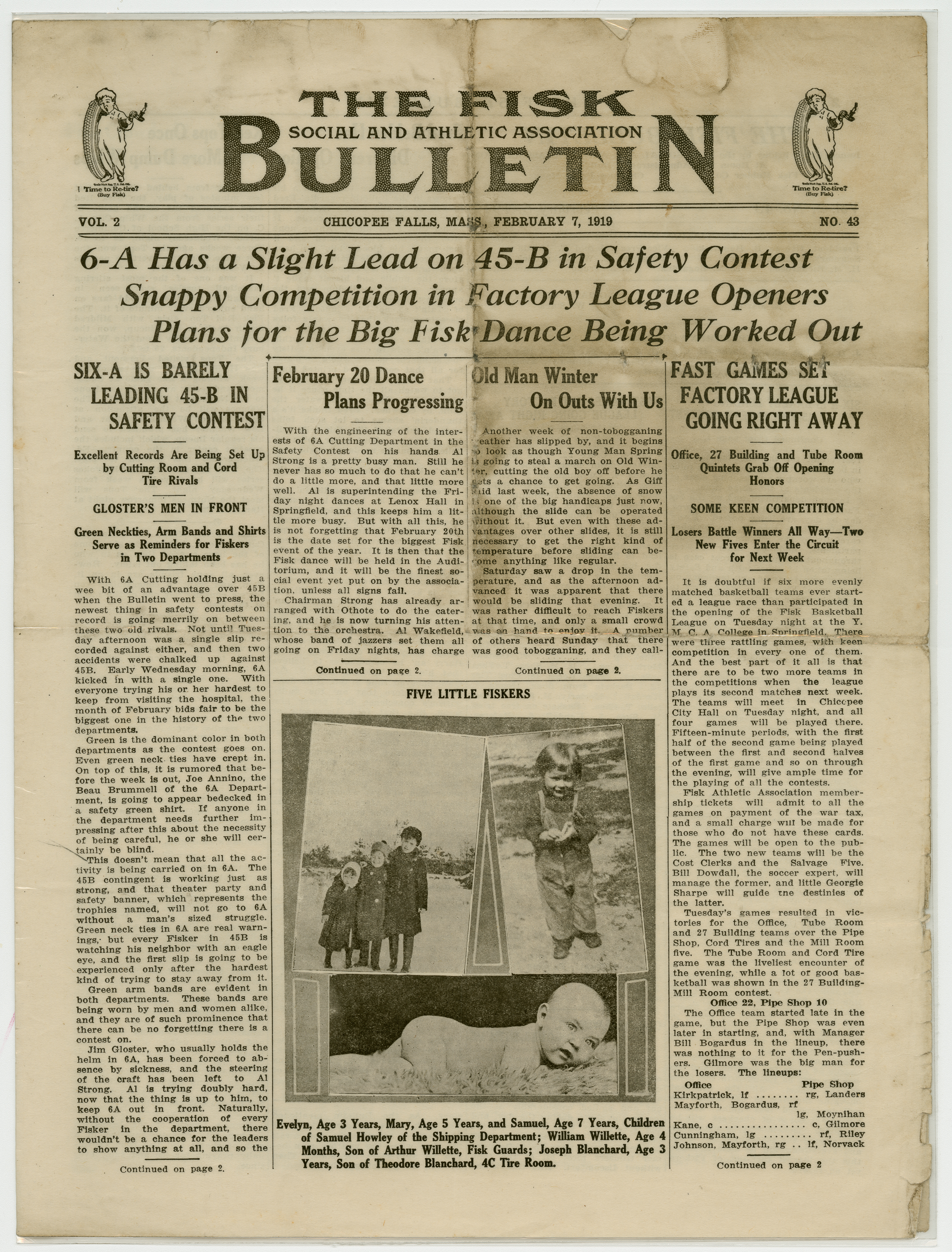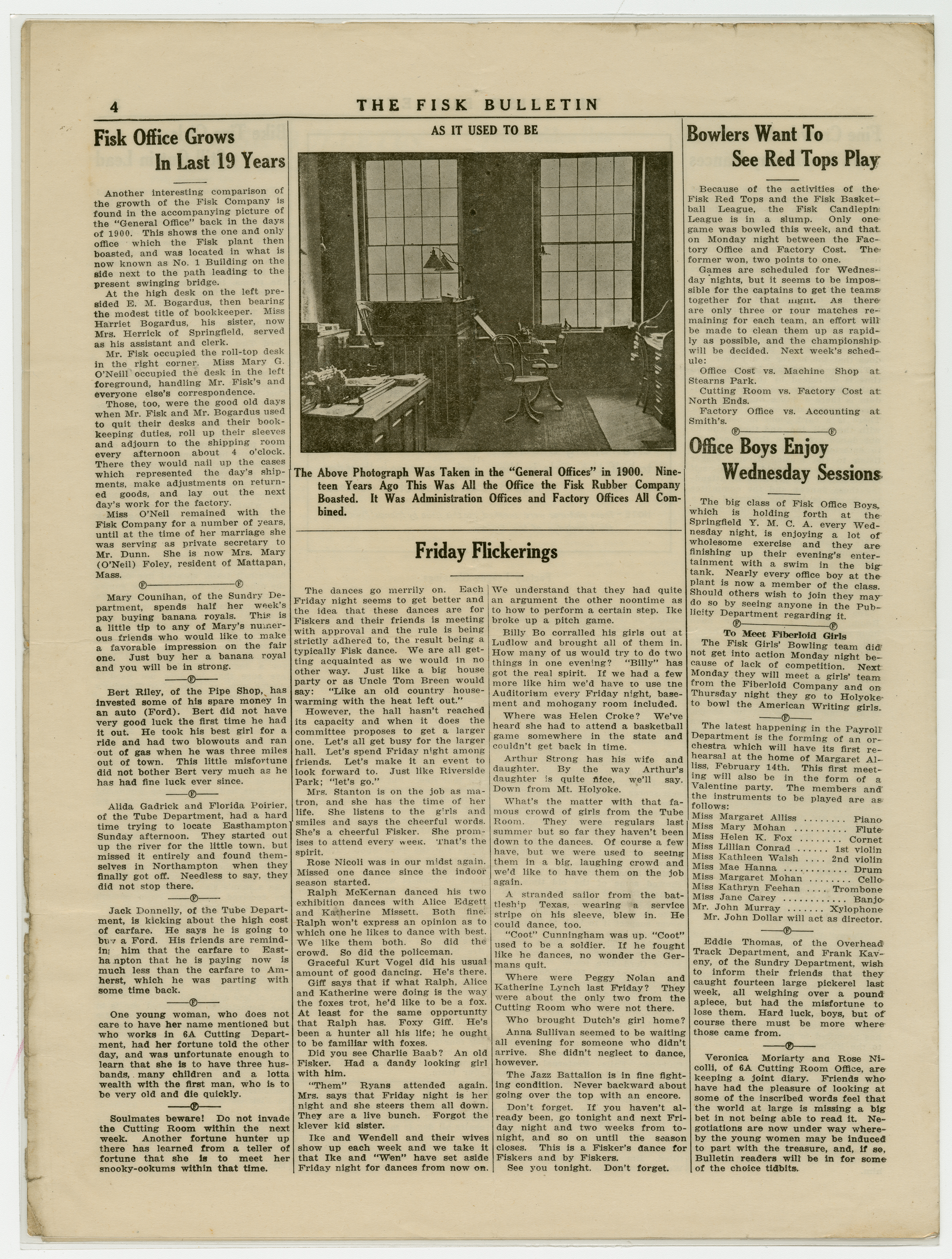 A four page newspaper describing the events related to the social groups and athletic clubs of the Fisk Tire Company for the week of February 7, 1919. In the Safety Contest 6-A has a slight lead over 45-B, plans for the February 20th Dance are in full swing and the Factory League is showing some fast games. Also on page one are photographs of five Fisk employee children. On page two Fred Belden speaks his mind about the card game featured in a past edition of the Bulletin. He wasn't too happy. The Red Tops basketball team beat the Westfield Whips again and the page one jumps land on page two. Ted Stack and Jack Martin have their photographs as young children featured at the top of page three. The Bike Tire women's team is leading the inter-factory basketball league and there are some fine crowds going to the Friday dances. A roundup of the other factory league games completes the page. Page four features a story about the Fisk Administrative Office growing over a 19 year period with a photograph of the office as it was in 1900. The Friday Flickerings column also appears and some sporting notes about the men's and women's bowling leagues wraps up the week's news.