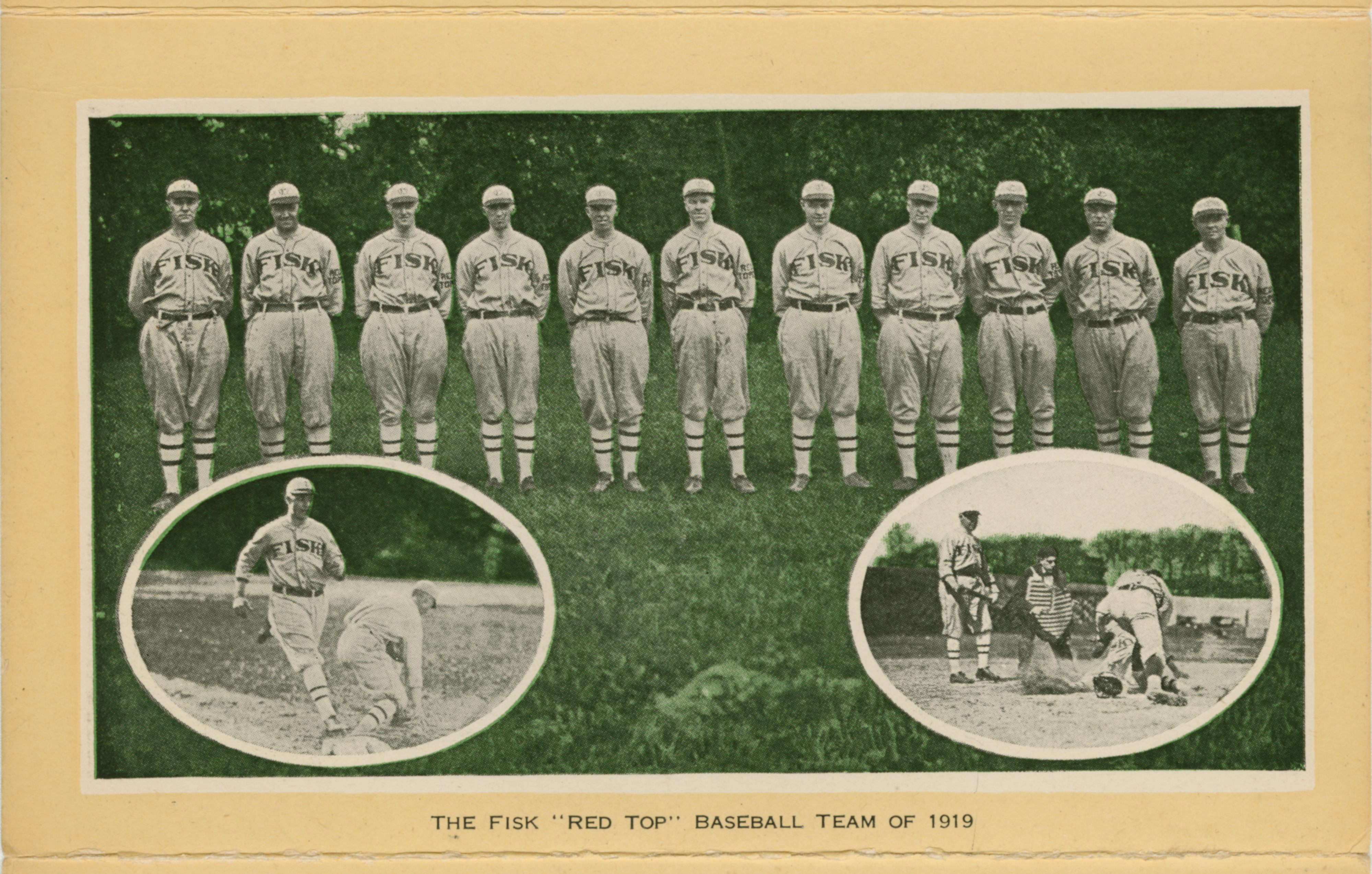 This card has three images of the Fisk "Red Top" baseball team of 1919. The main photograph is of the team in a line. There are two inset images of the "Red Tops," one in the lower left corner and one in the lower right corner. The image on the left shows a player running to a base while an opposing player reaches for the ball. The Fisk logo is clearly visible on the player hitting the base. The image on the right shows a play at home plate with one player sliding into home with a catcher making the tag. There is an umpire and a coach watching the action. The grass and trees in the larger photograph has been colored a dark green providing a background for the players and the inset photographs.