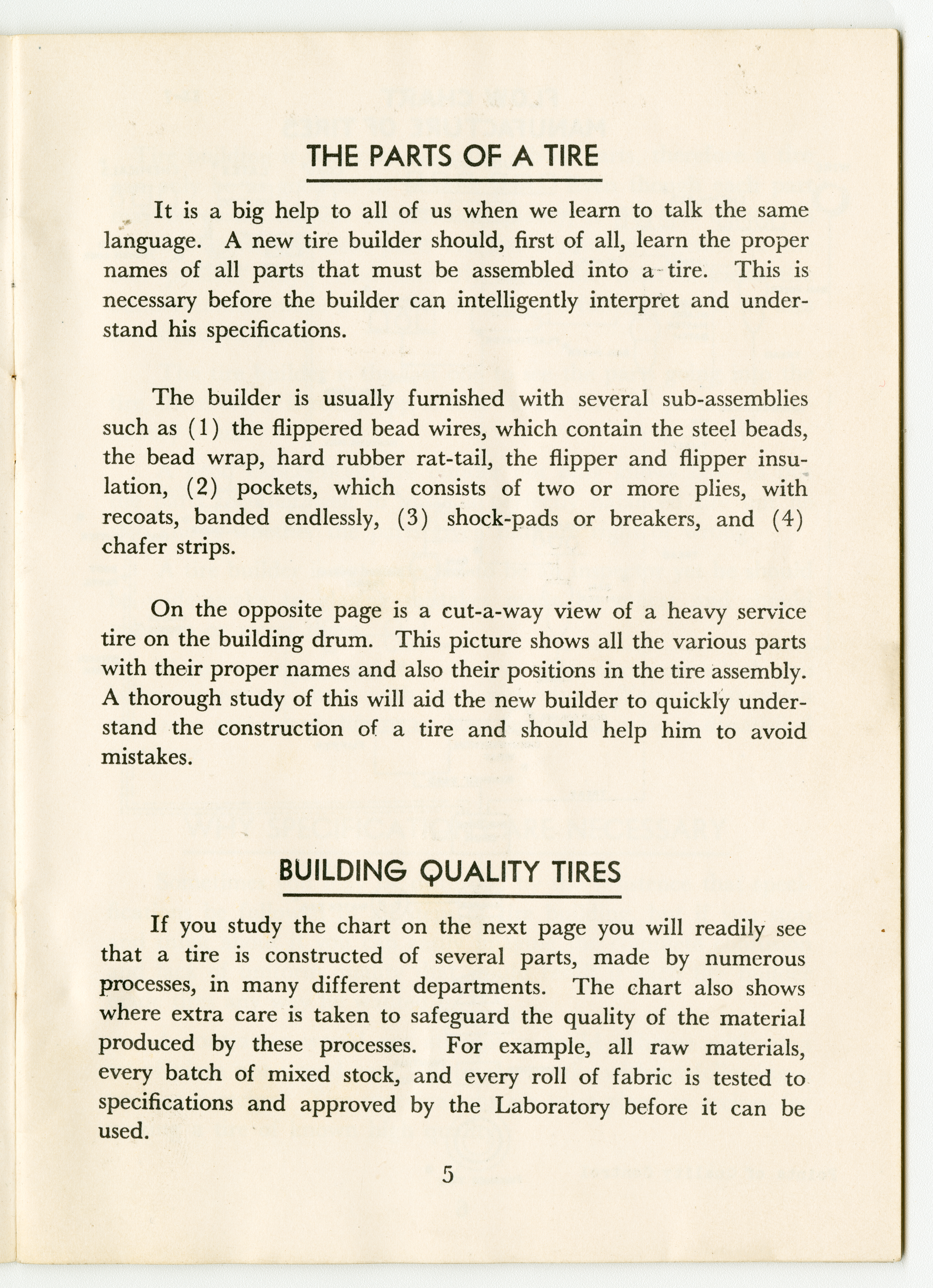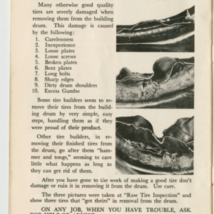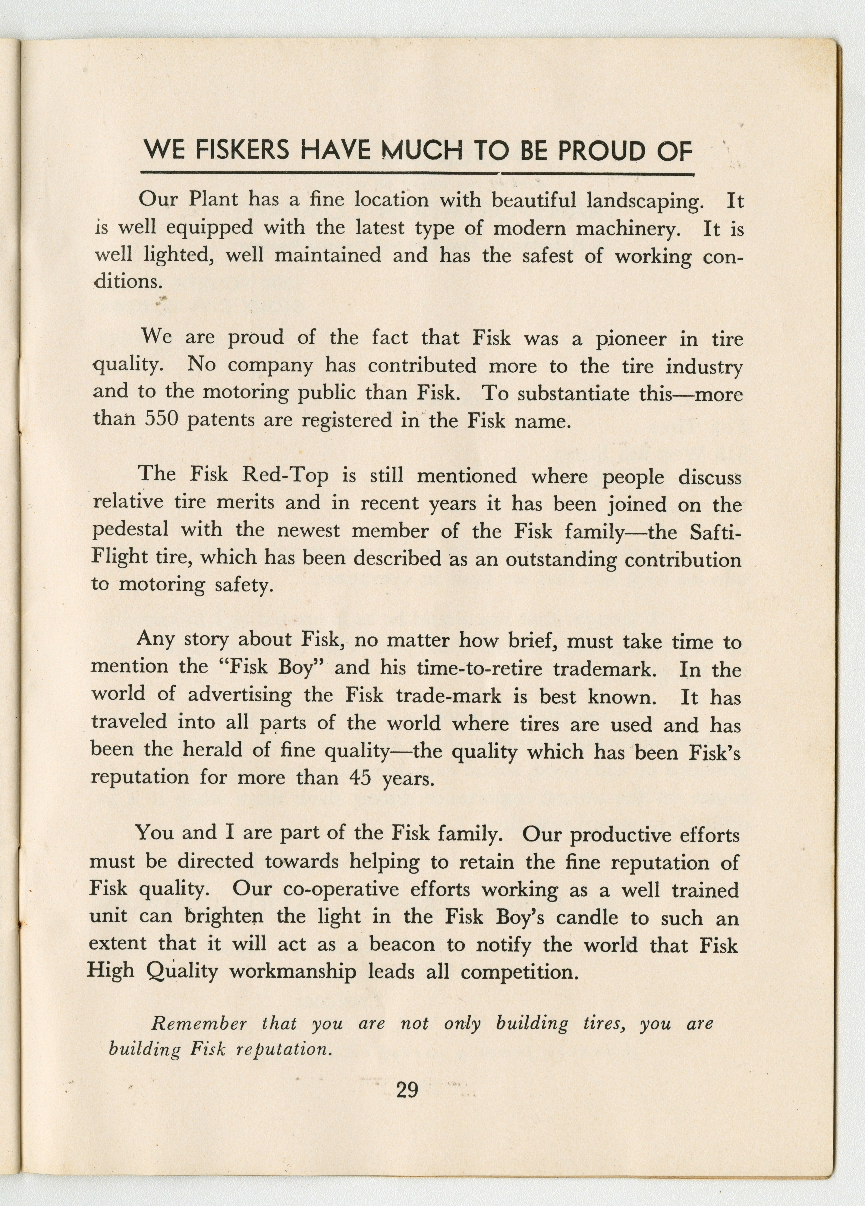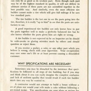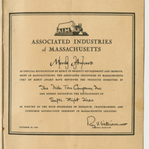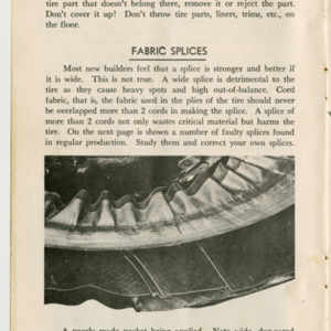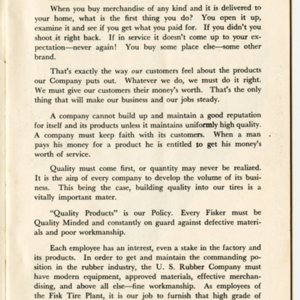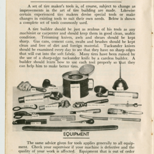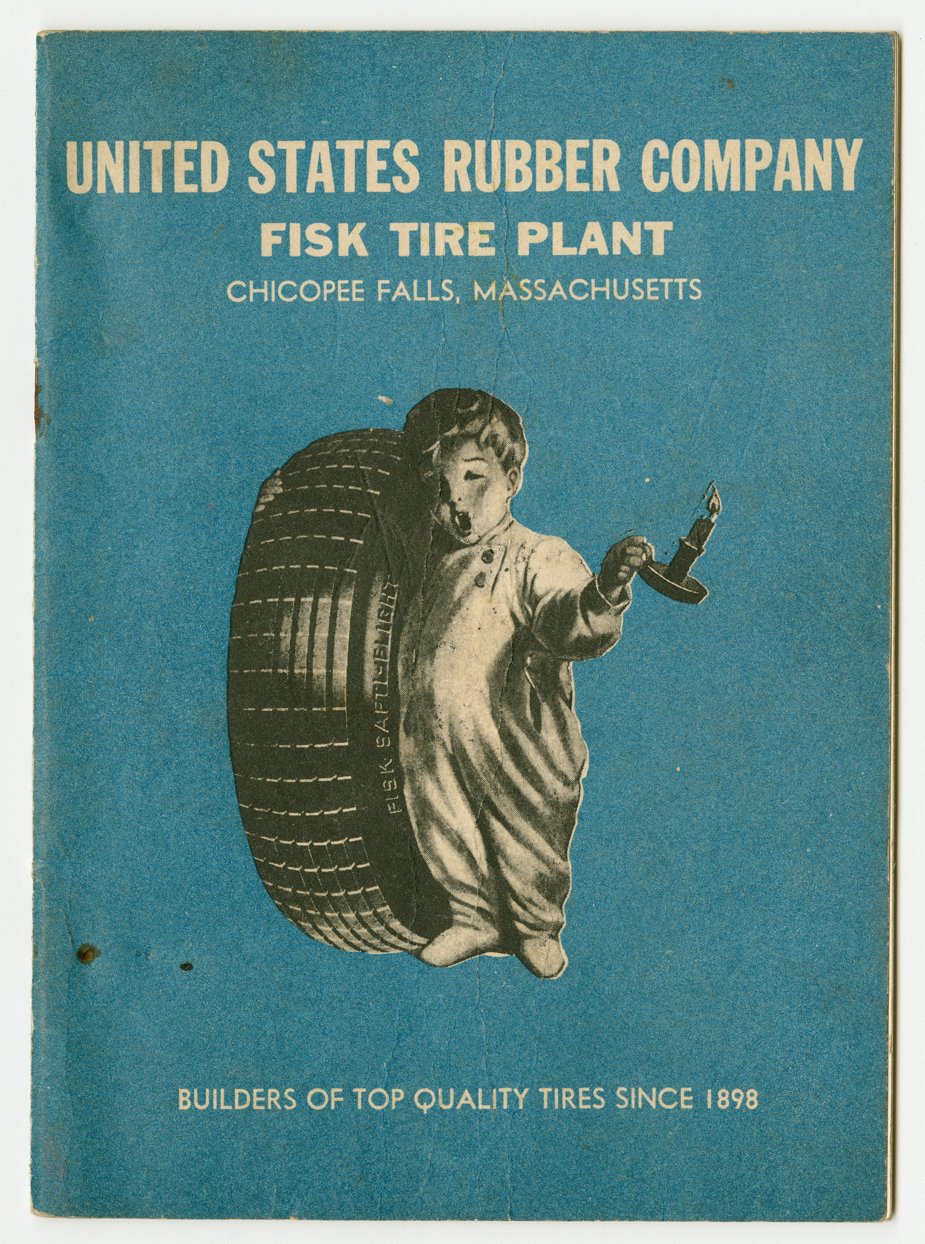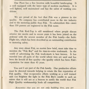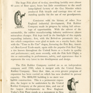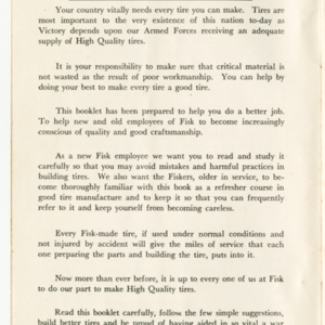 A small handbook for Fisk Tire Company employees produced and published by the Fisk Tire Company. The book guides employess through several of the processes involved in making tires, what makes up the parts of a tire and outlines safety rules and instructions. It was donated to the library by family of former Fisk employee Mary Joy, who worked at the Chicopee Falls Plant starting in 1937.