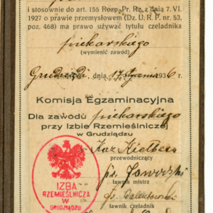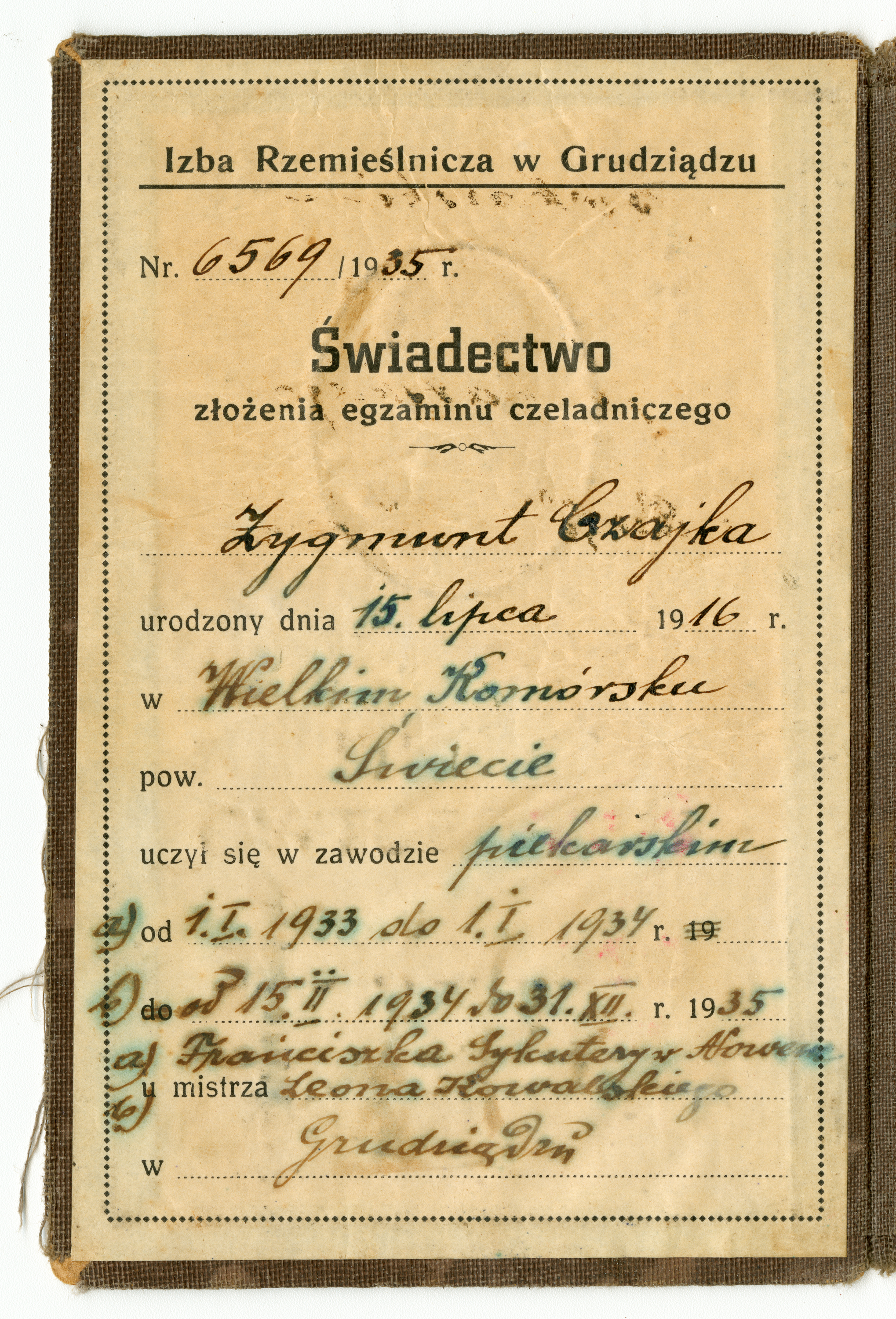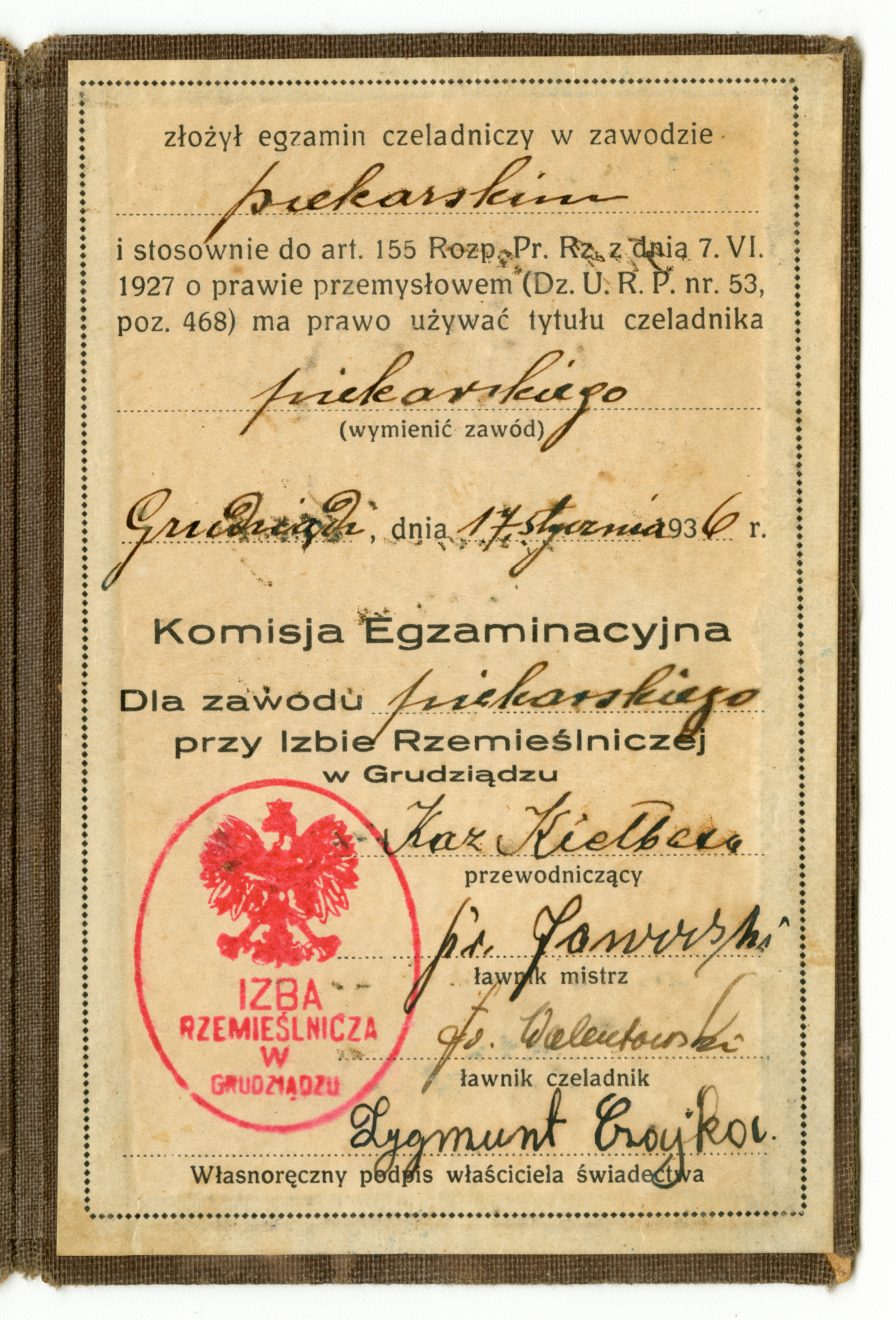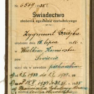 Identification papers for Zygmunt Czajka in the form of a small booklet. Zygmunt worked as a Baker in Poland during the German occupation in 1939-1945. He later brought his family and baking skills to Chicopee and opened Bob's Bakery on Exchange Street in 1965.