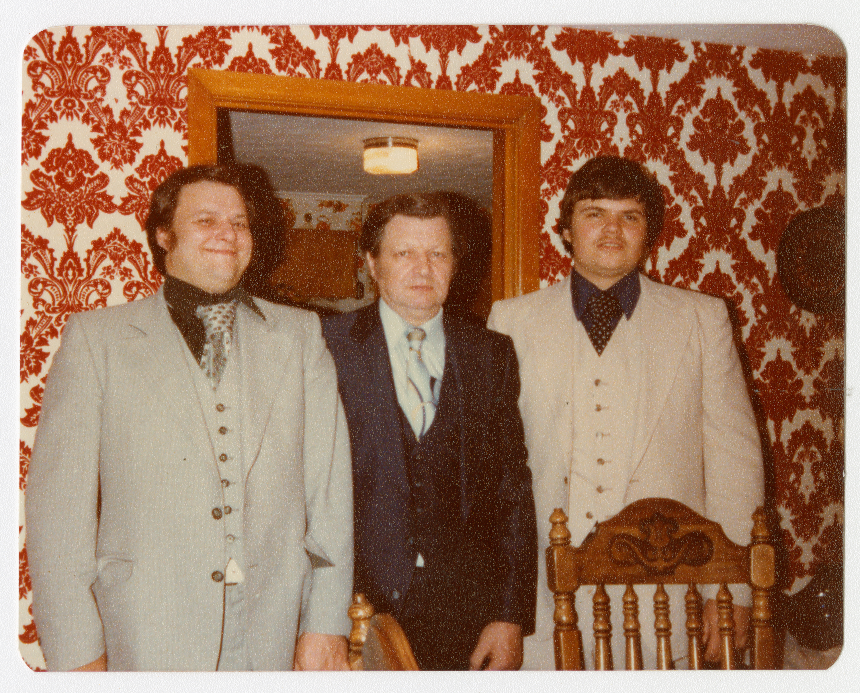 Color photograph of Zygmunt, center, Bogumit left, and Paul Czjaka, right, dressed in suits in a room with colorful wallpaper. A table with chairs in in front of them and a doorway to another room is behind them. Zygmunt worked as a Baker in Poland during the German occupation in 1939-1945. He later brought his family and baking skills to Chicopee and opened Bob's Bakery on Exchange Street in 1965. Paul took over the bakery in the 1980s and Bogumit helped out during the busy seasons.