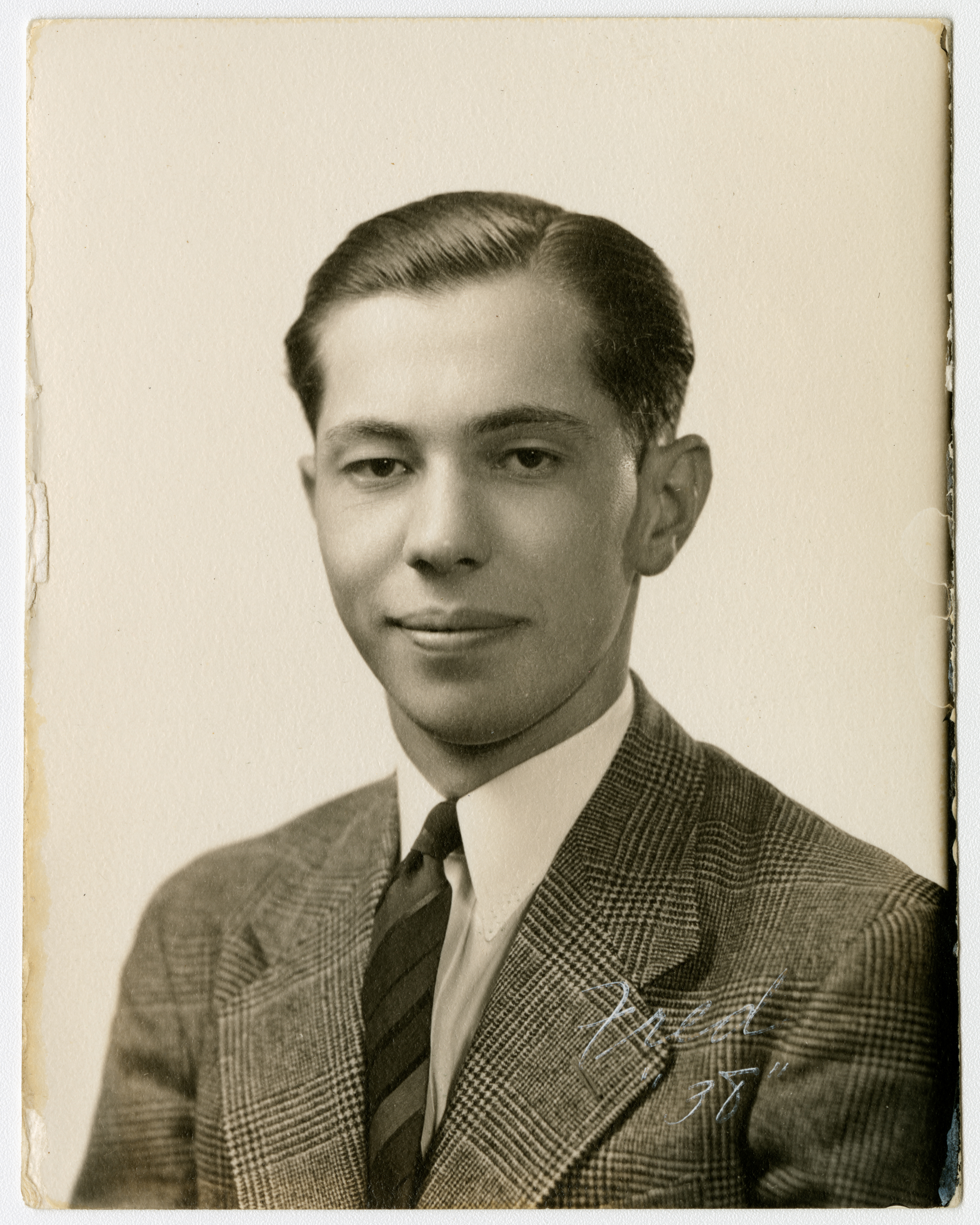 Senior portrait of a young man dressed in a suit from the Chicopee High School Class of 1937 showing head, shoulders and face. Even lighting from the left of the frame highlights the face and lets the rest fall into a slight shadow. Writing on the bottom right of the print says "Pete '37."