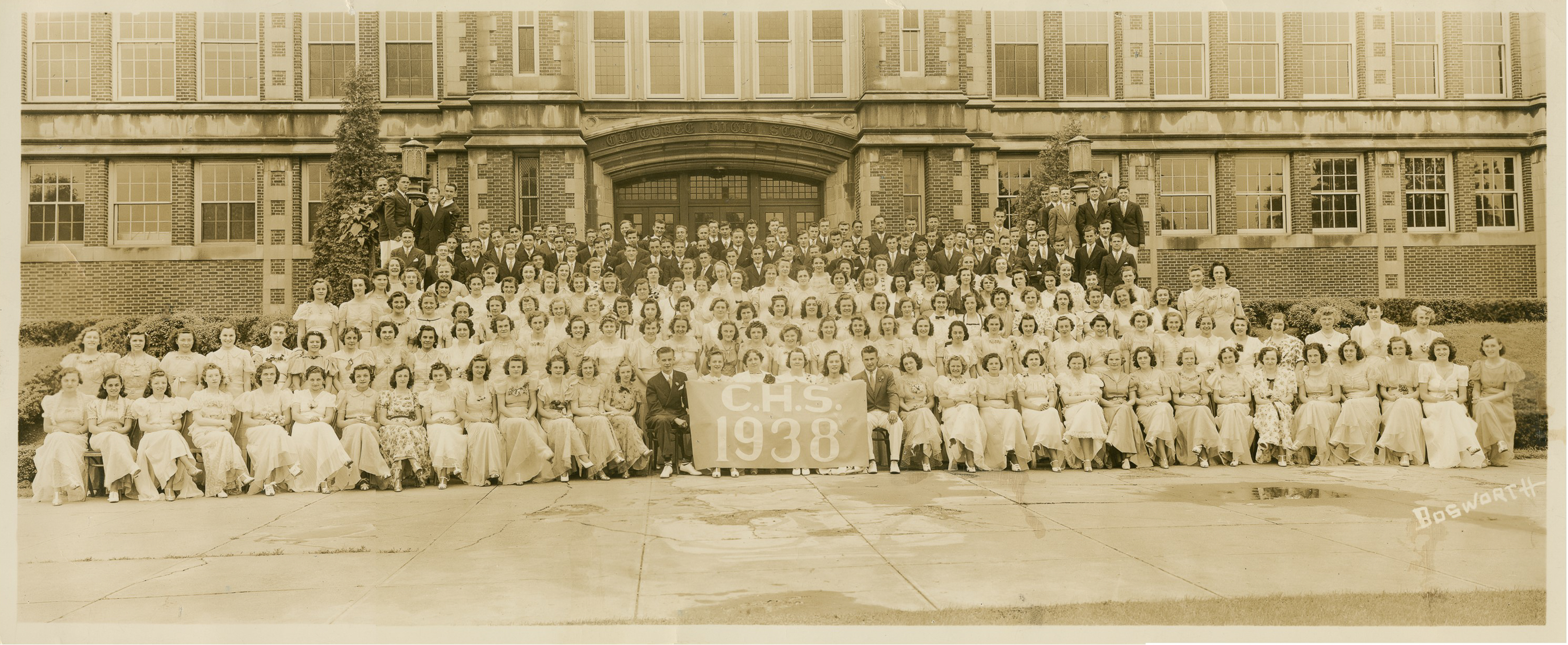 Panoramic photograph of the Chicopee High School class of 1938 taken in front of the school.