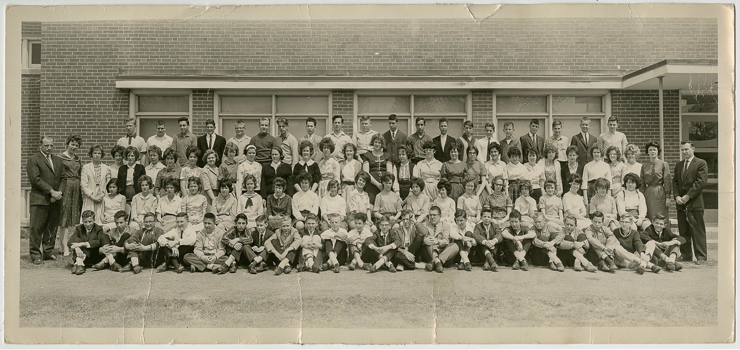 A panoramic photograph of the Lambert-Lavoie Elementary School 8th Grade class outside the school.