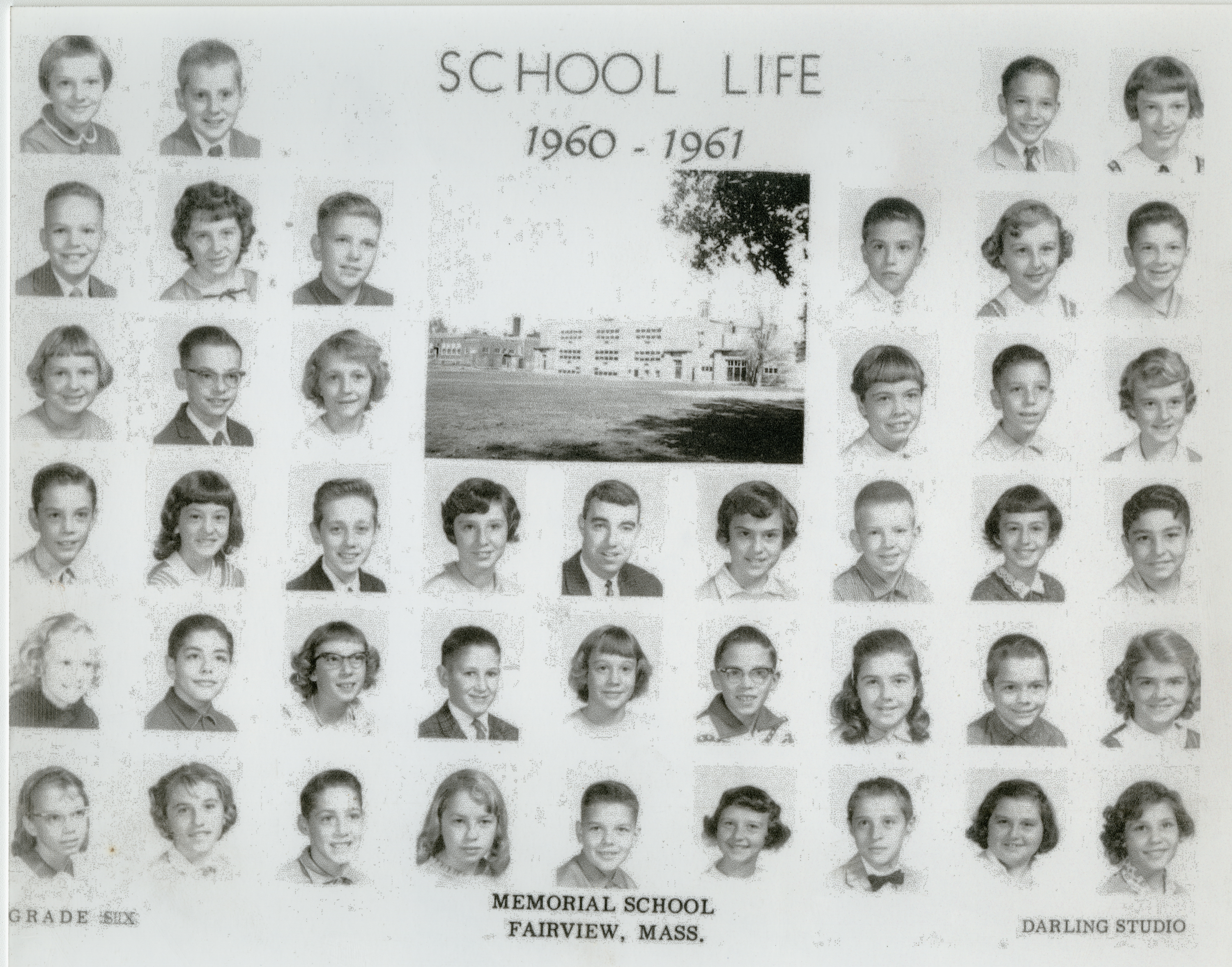 A class photo of the Fairview Elementary School 1960-61 6th Grade class made up of small individual headshots arranged evenly on the page. "School Life 1960-1961" is printed at the top middle of the page. On the bottom is "Grade Six," "Fairview Memorial School, Fairview, Mass.," and "Darling Studio."