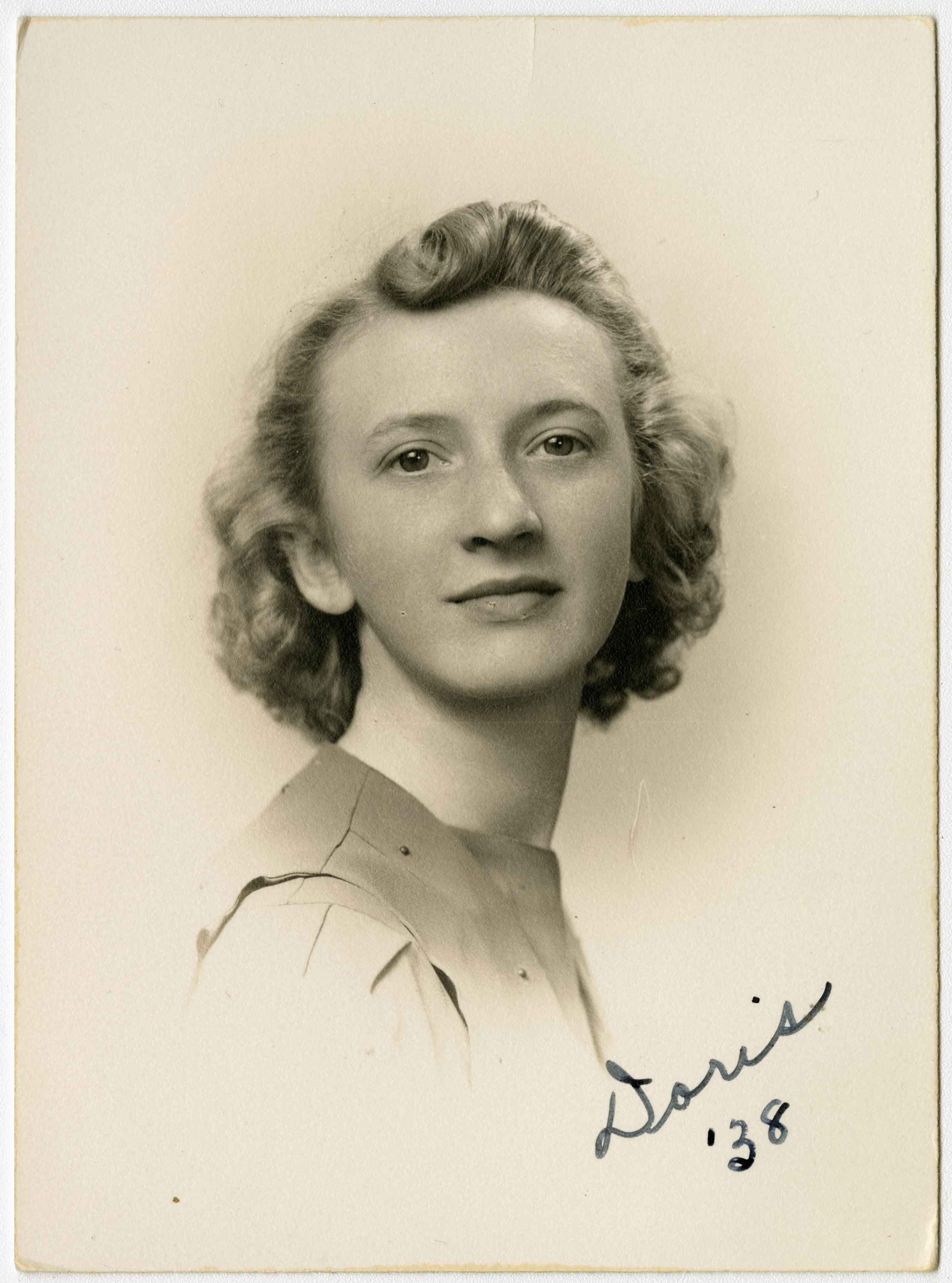 Senior portrait of a young woman from the Chicopee High School Class of 1938 showing head, shoulders and face with the shoulders turned to the right of the frame and face turned back toward the front. Even lighting throughout illuminates the face. There is a halo masking the edges of the subject and the shoulder blends in so that only the face is visible in the center of the frame. Writing at the bottom right of the frame says "Doris '38."