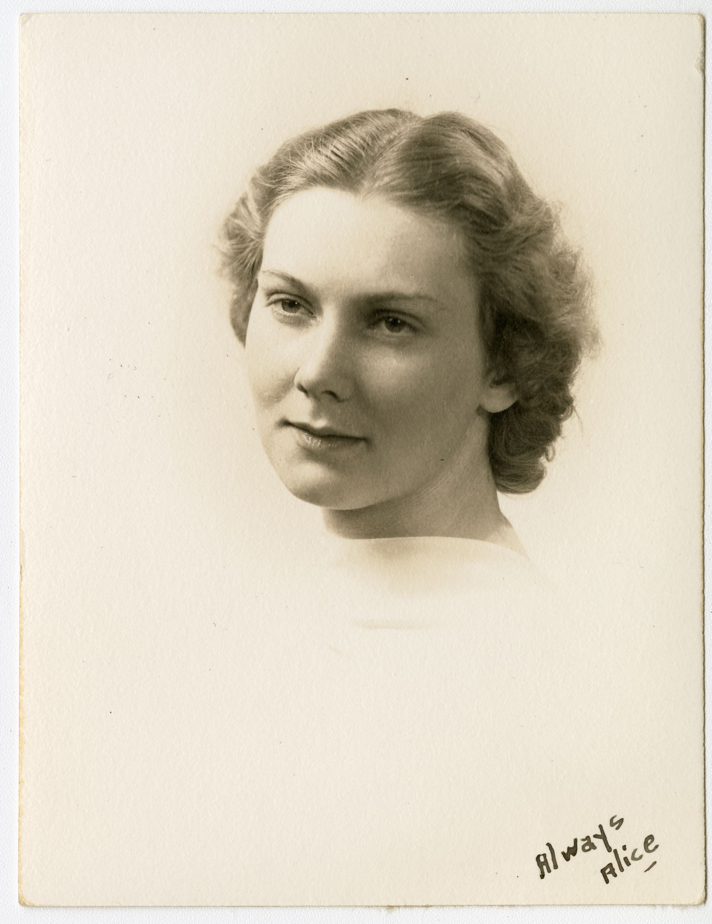 Senior portrait of a young woman from the Chicopee High School Class of 1938 showing head, shoulders and face with the shoulders turned to the left of the frame and face turned back toward the front. Even lighting throughout illuminates the face. There is a halo masking the edges of the subject and the shoulder blends in so that only the face is visible in the center of the frame. Writing on the bottom right of the print says "Always, Alice."