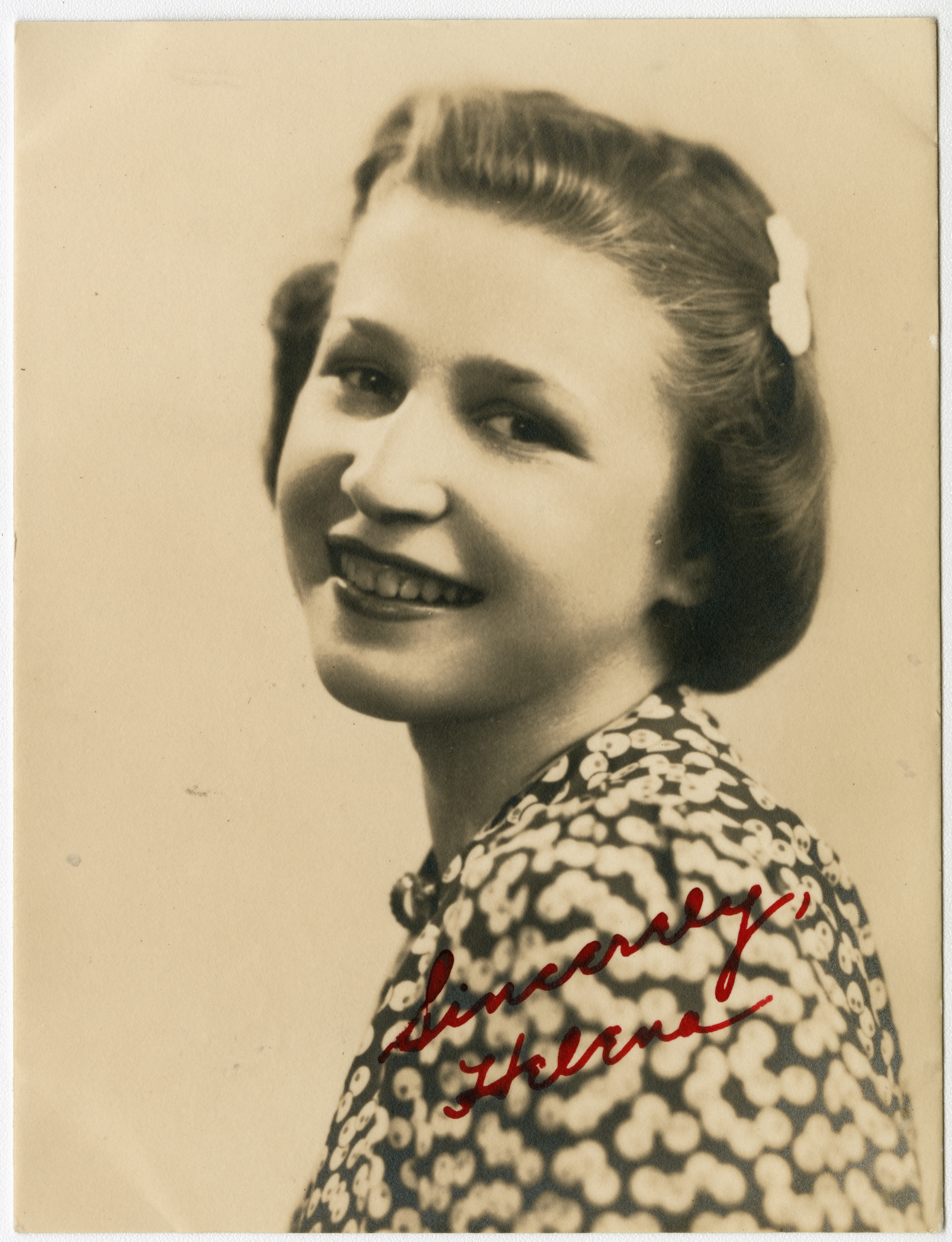 Senior portrait of a young woman from the Chicopee High School Class of 1938 showing head, shoulders and face with the shoulders facing left and face turned back toward the camera. Even lighting throughout illuminates the face. The subject is wearing a dark shirt with a pattern on it. Writing on the bottom right of the print says "Sincerely, Helena."