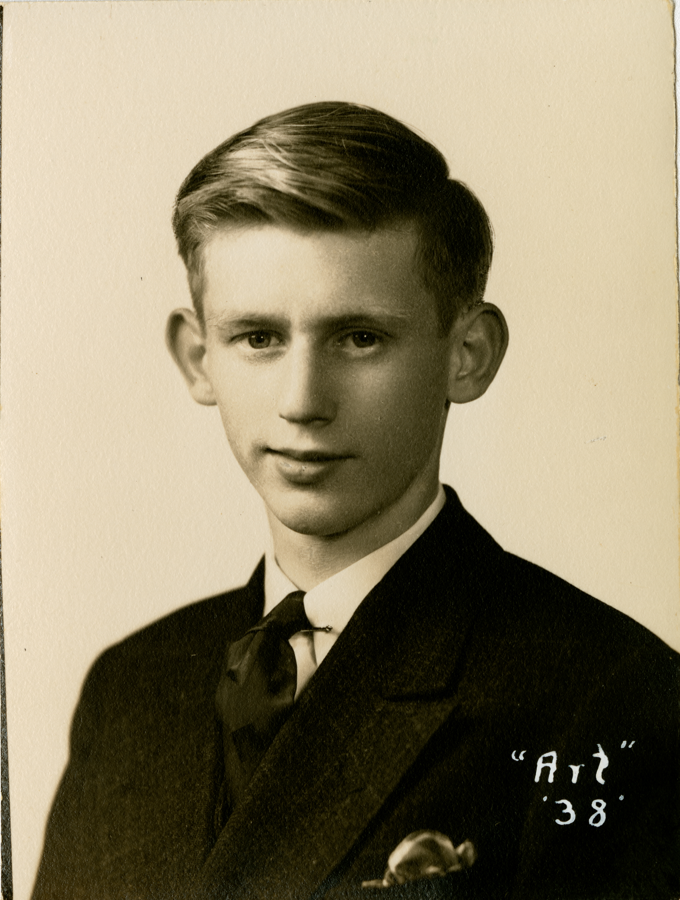 Senior portrait of a young man from the Chicopee High School Class of 1938 showing head, shoulders and face with the shoulders turned to the front. Strong side light illuminates the most of the face. The subject is wearing a dark suit with a white shirt and silk tie. Writing on the bottom right of the print says ""Art" '38."