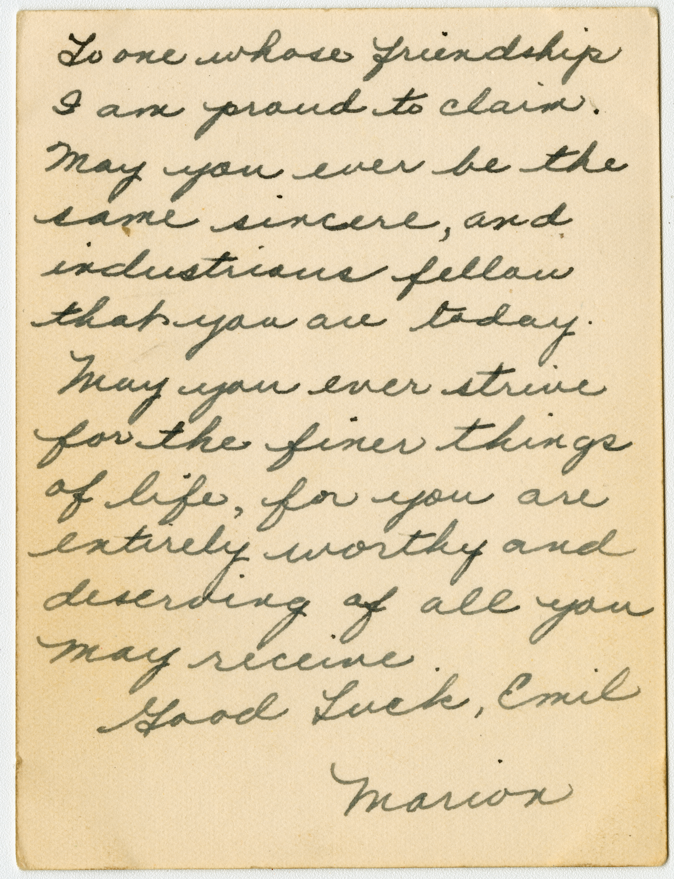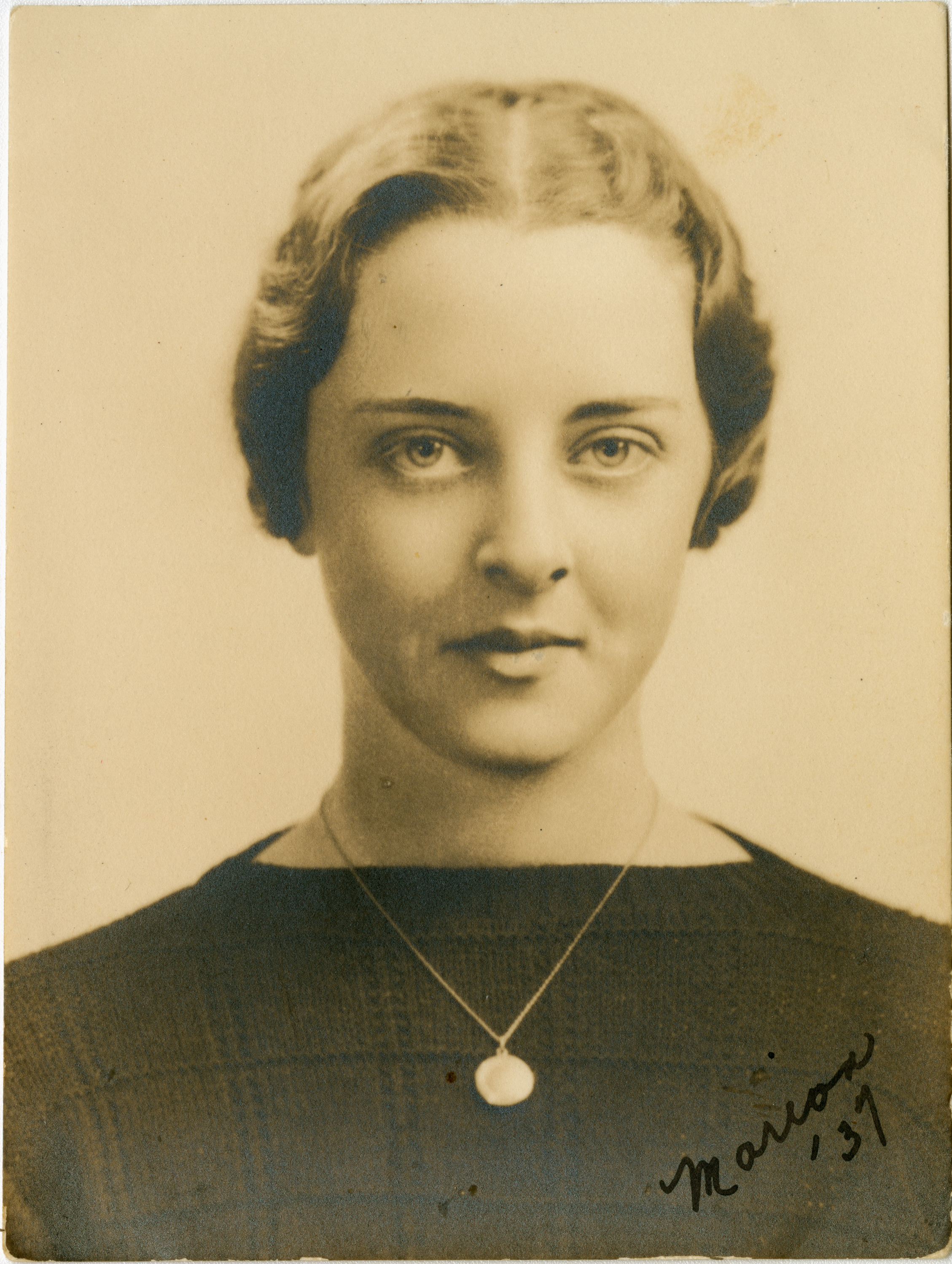 Senior portrait of a young woman from the Chicopee High School Class of 1938 showing head, shoulders and face with the shoulders facing front. The subject is wearing a dark shirt that contrasts with the background. Writing on the bottom right of the print says "Marion '37." On the back of the print is a message to Emil.