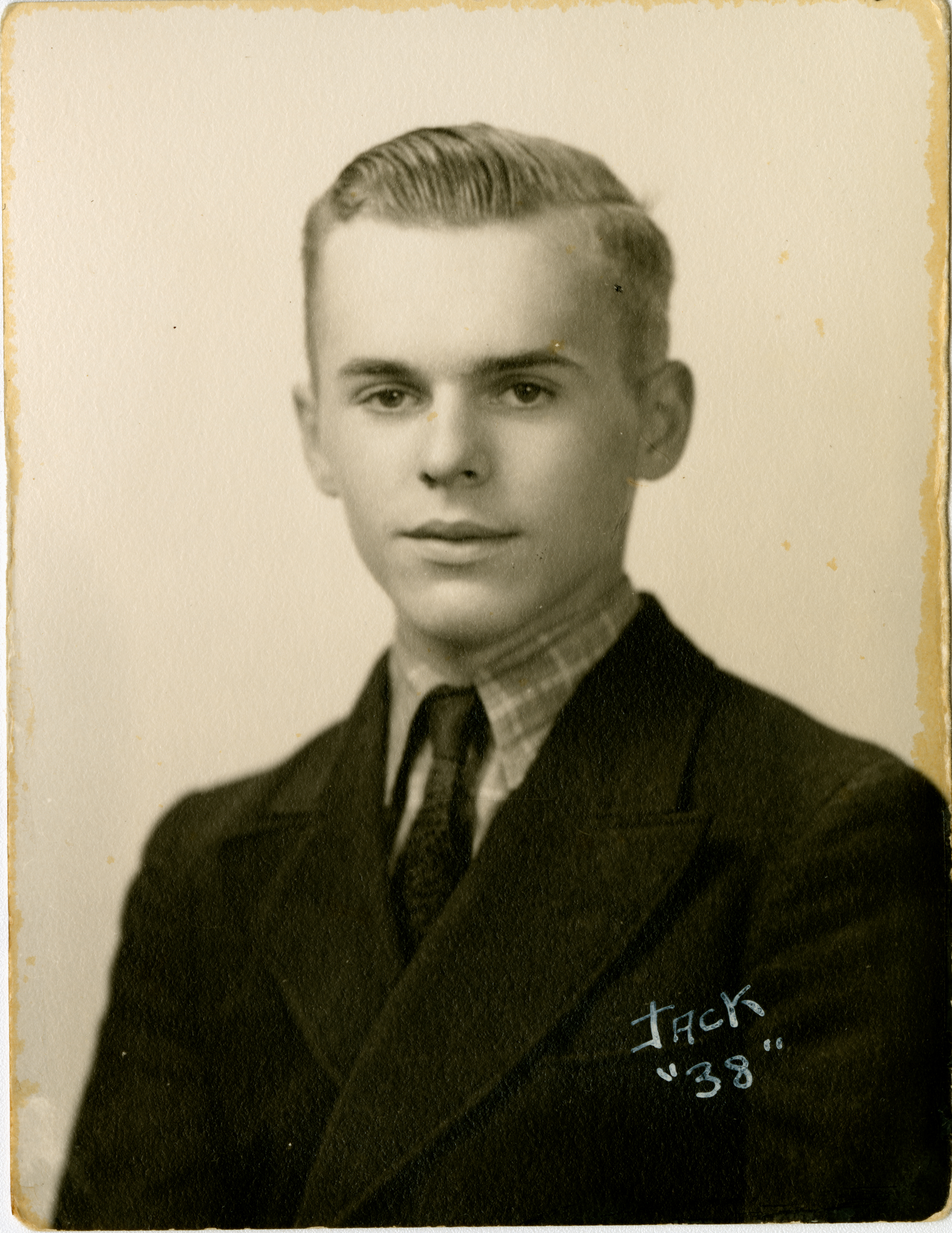 Senior portrait of a young man from the Chicopee High School Class of 1938 showing head, shoulders and face with the shoulders turned to the front. Strong side light illuminates the most of the face. The subject is wearing a dark suit with a plaid shirt and dark tie. Writing on the bottom right of the print says "Jack "38."