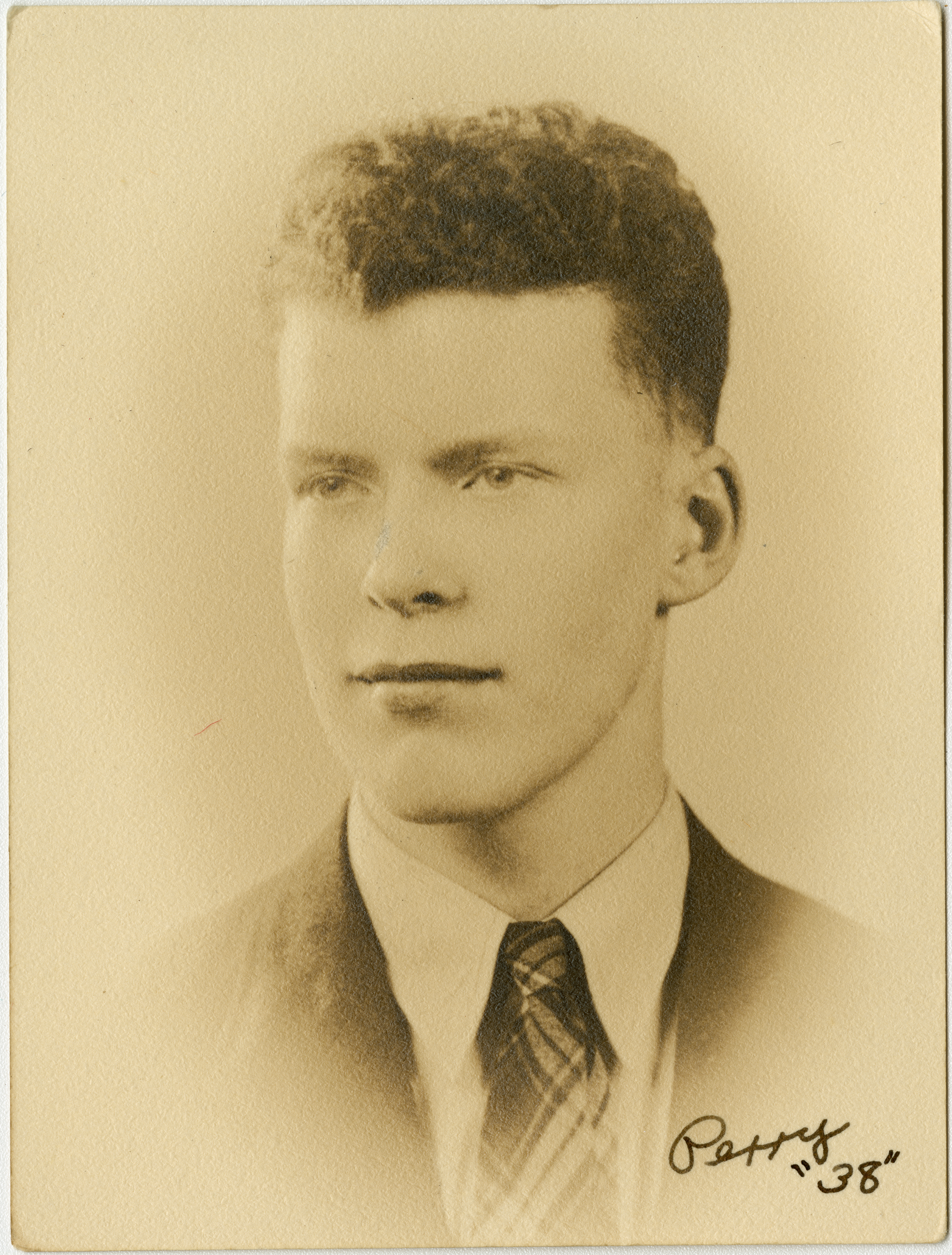 Senior portrait of a young man from the Chicopee High School Class of 1938 showing head, shoulders and face with the shoulders turned to the front and head turned to the left. Strong side light illuminates the most of the face. The subject is wearing a dark suit with a white shirt and plaid tie. Writing on the bottom right of the print says "Perry "38"."