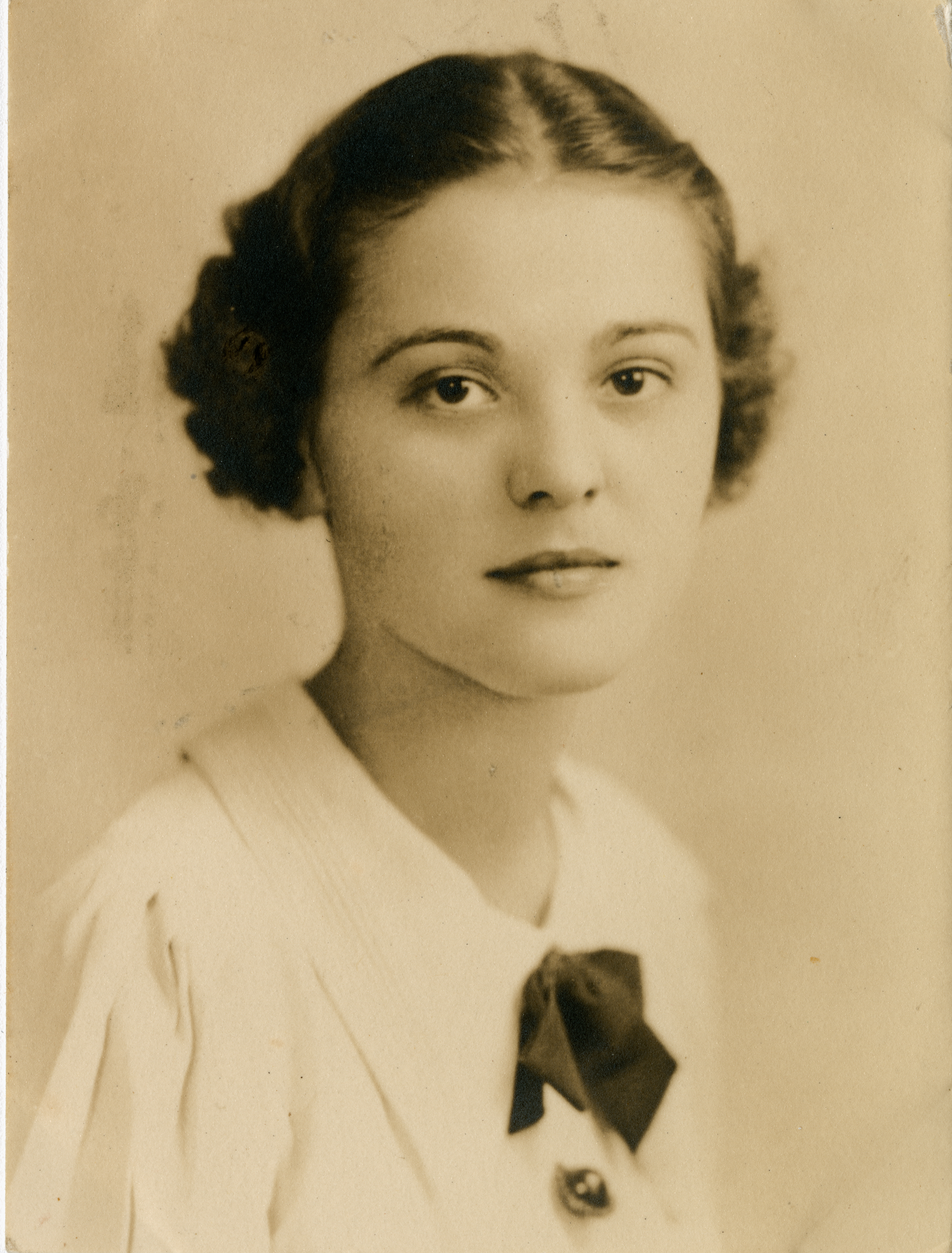Senior portrait of a young woman from the Chicopee High School Class of 1938 showing head, shoulders and face with the shoulders turned to the right and with her head turned to face the camera. Soft side light illuminates the subject. The subject is wearing a white shirt with a bow at the collar. The background is slightly darker and there is no fade There is no writing on the print.