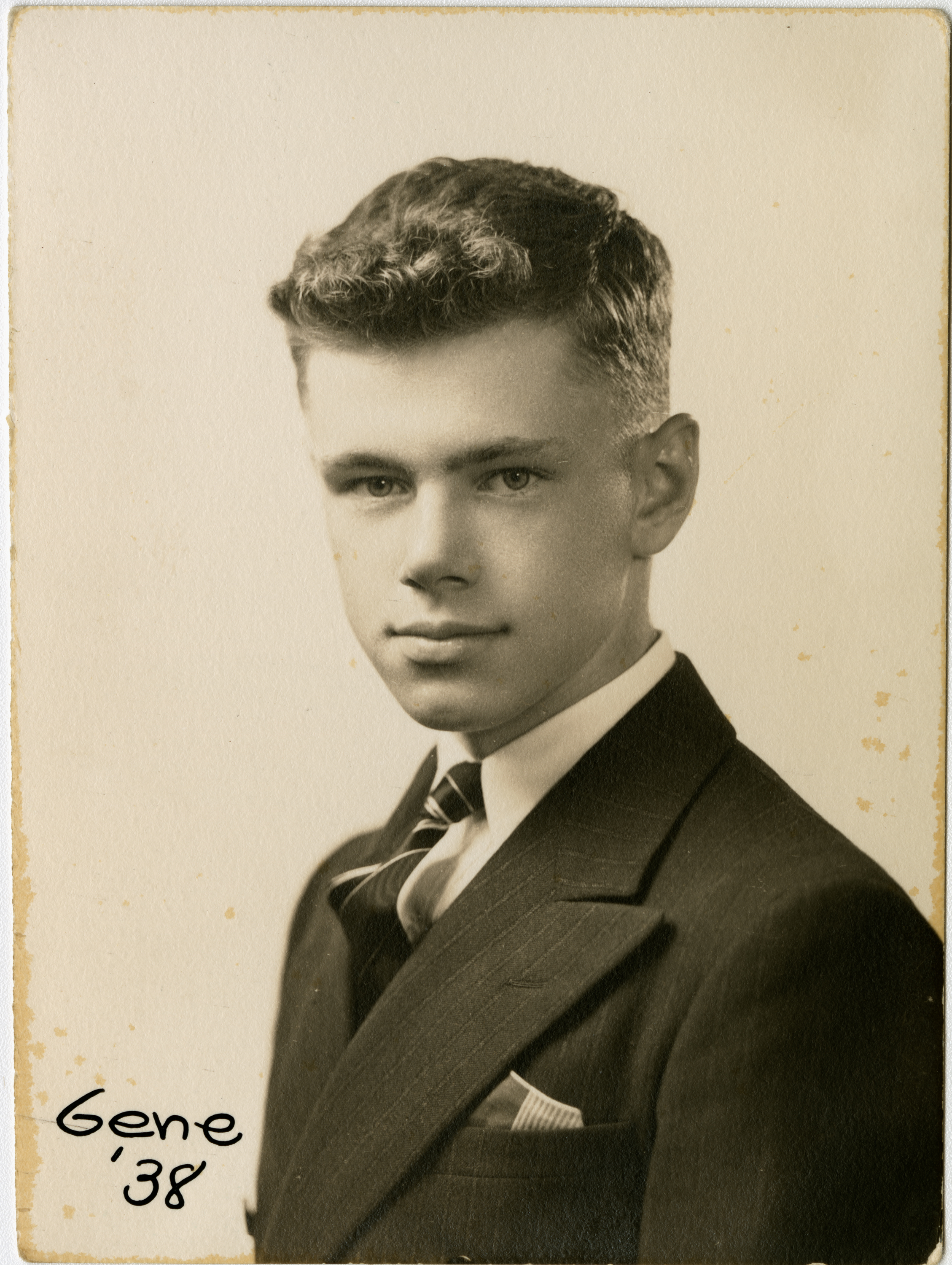Senior portrait of a young man from the Chicopee High School Class of 1938 showing head, shoulders and face with the shoulders turned to the left and the face turned back to the front. Strong side light illuminates the most of the face. The subject is wearing a dark suit with a white shirt and dark tie. Writing on the bottom left of the print says "Gene '38."
