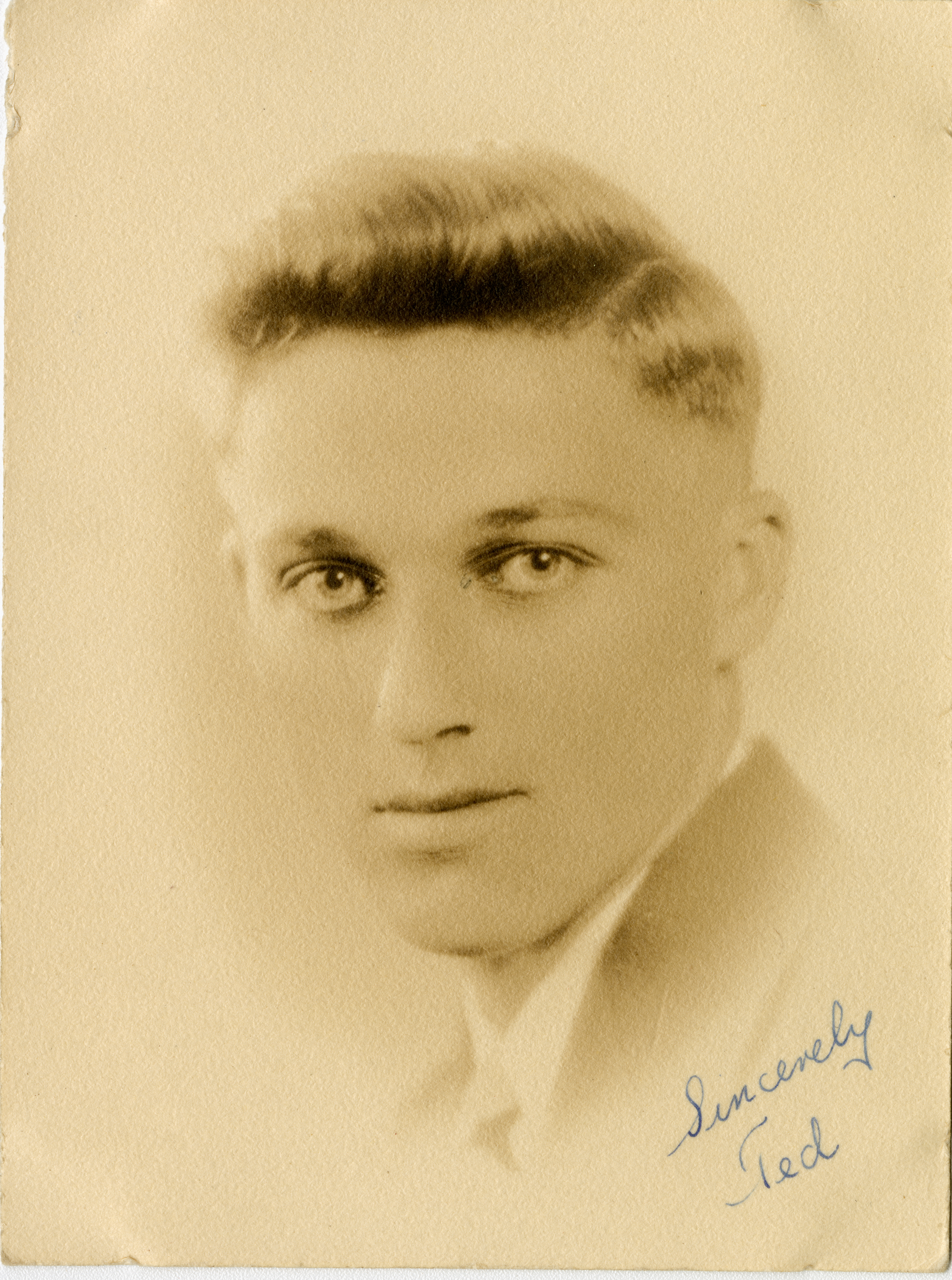 Senior portrait of a young man from the Chicopee High School Class of 1938 showing head, shoulders and face with the shoulders turned to the left and the face turned back to the front. Strong side light illuminates the most of the face. The subject is wearing a light suit with a white shirt and dark tie. The focus is soft and the subject fades into the background. Writing on the bottom right of the print says "Sincerely Ted."