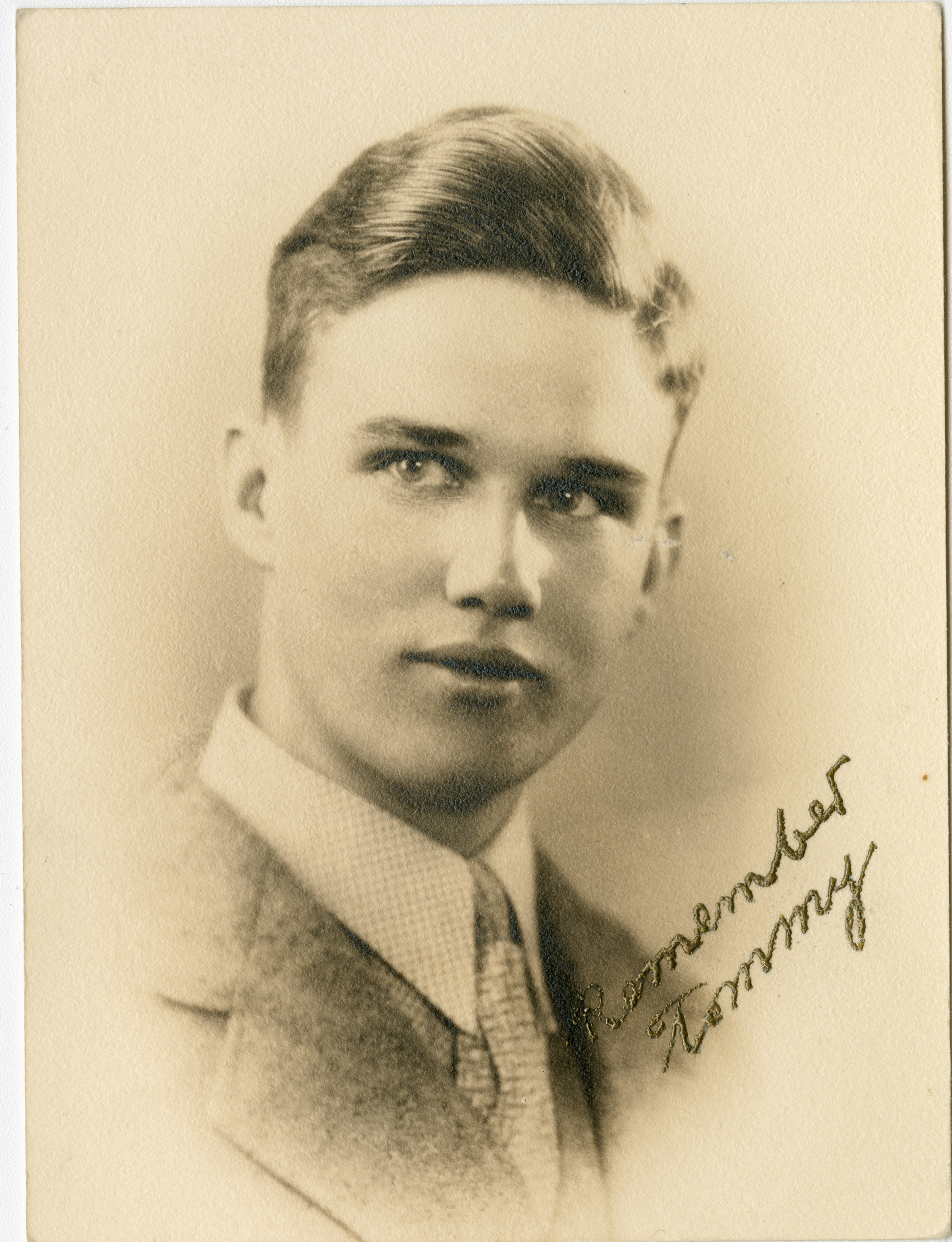 Senior portrait of a young man from the Chicopee High School Class of 1938 showing head, shoulders and face with the shoulders facing front right. The subject's face is turned back to the left and is looking past the camera. Soft side light illuminates the most of the face. The subject is wearing a light textured suit with a checked shirt and checked tie. Writing on the bottom left of the print says "Remember Tommy."