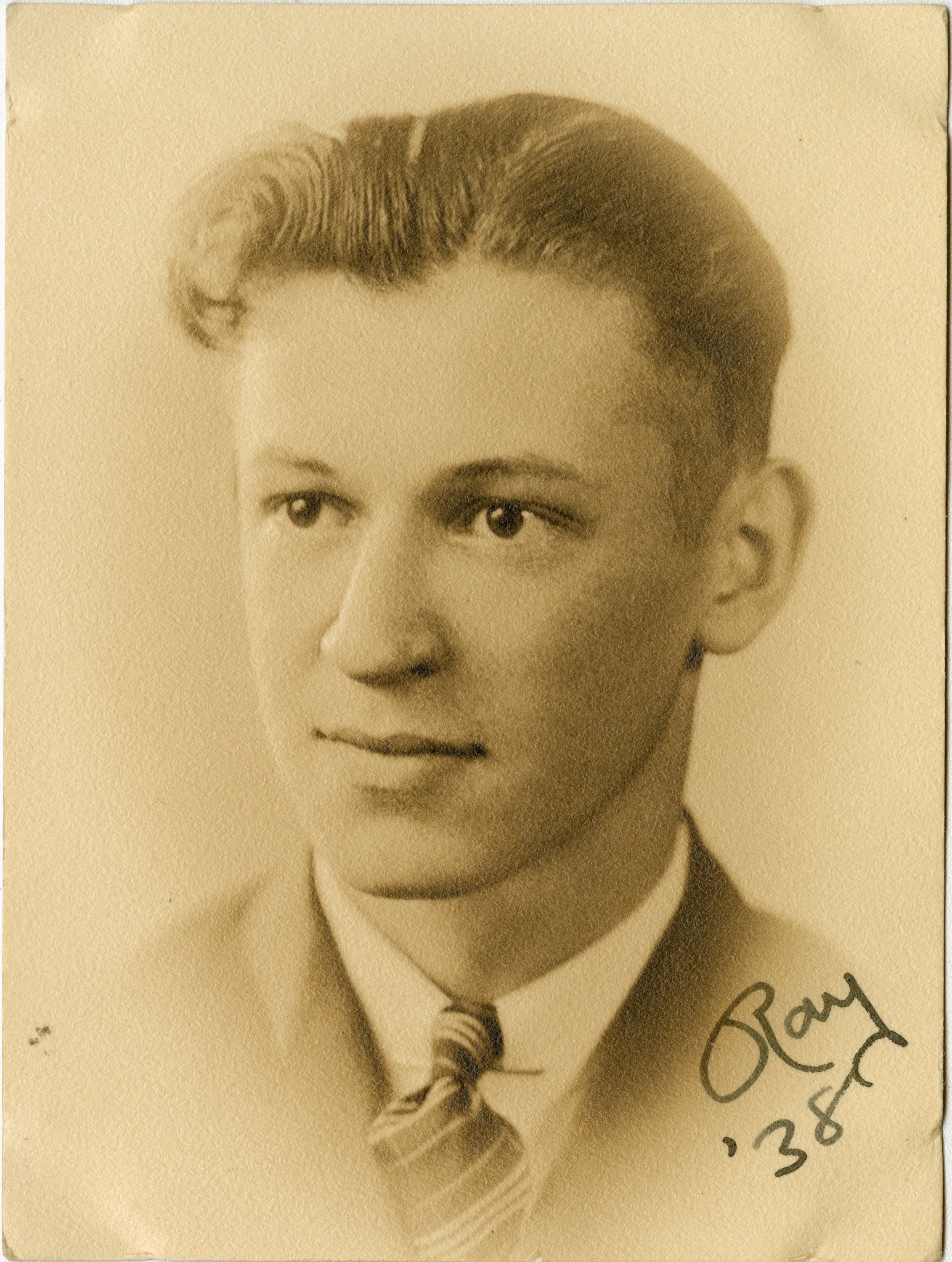 Senior portrait of a young man from the Chicopee High School Class of 1938 showing head, shoulders and face with the shoulders facing front. The subject's face is turned to the left and is looking past the camera. Soft light illuminates the most of the face. The subject is wearing a dark suit with a white shirt and striped tie. Writing on the bottom left of the print says "Ray '38."