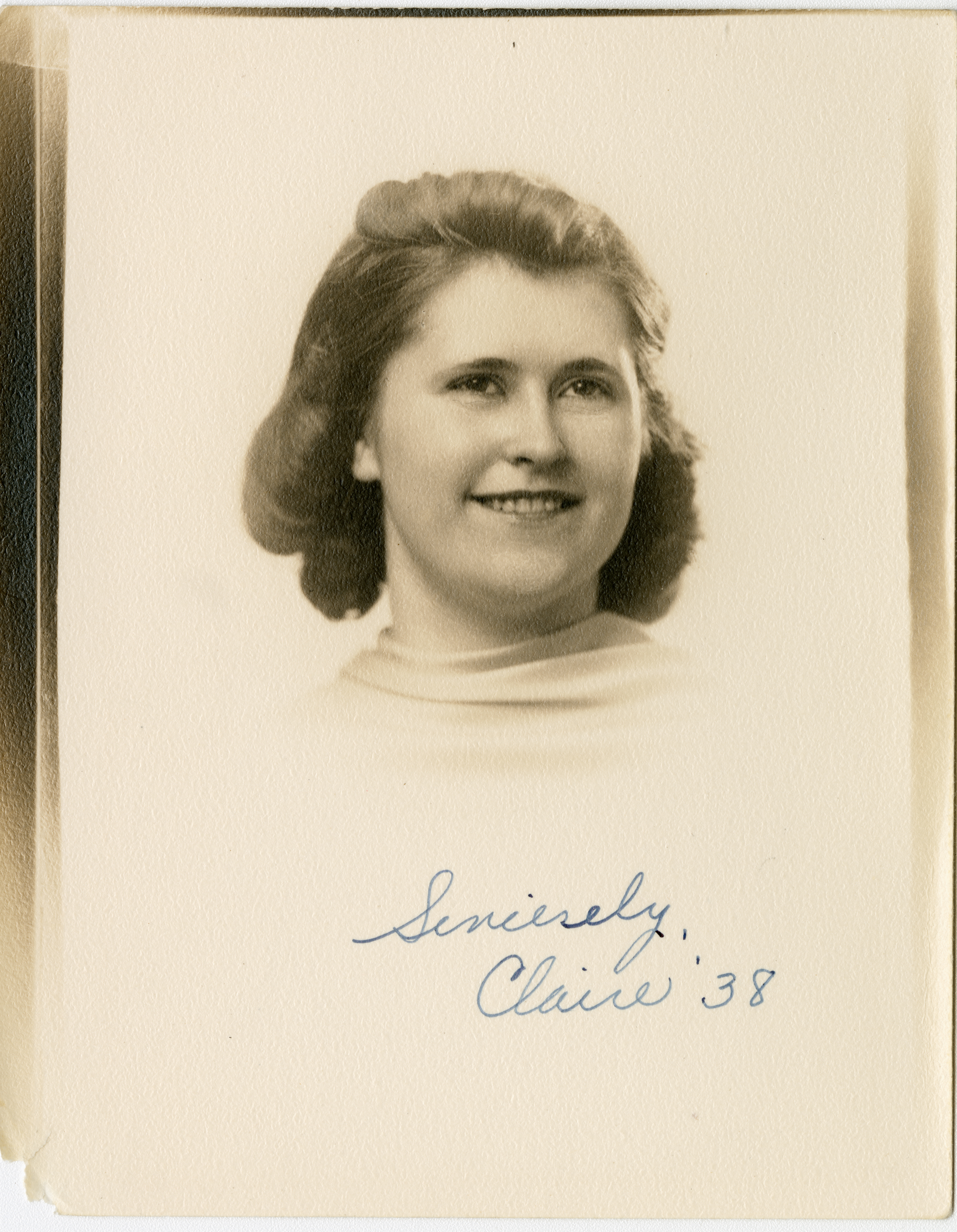 Senior portrait of a young woman from the Chicopee High School Class of 1938 showing head, shoulders and face with the shoulders and face turned to the right. She is looking past the camera. Strong side light illuminates the right side. The subject is wearing a light shirt that fades into the background. Writing on the bottom right of the print says "Sincerely, Clare '38"