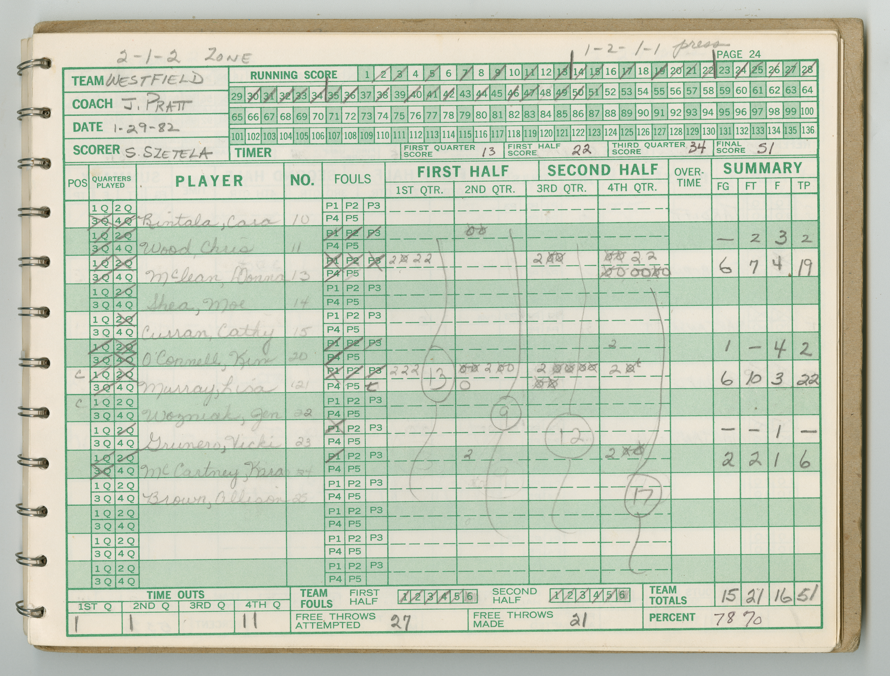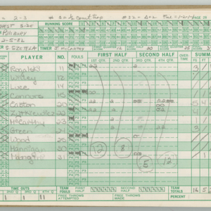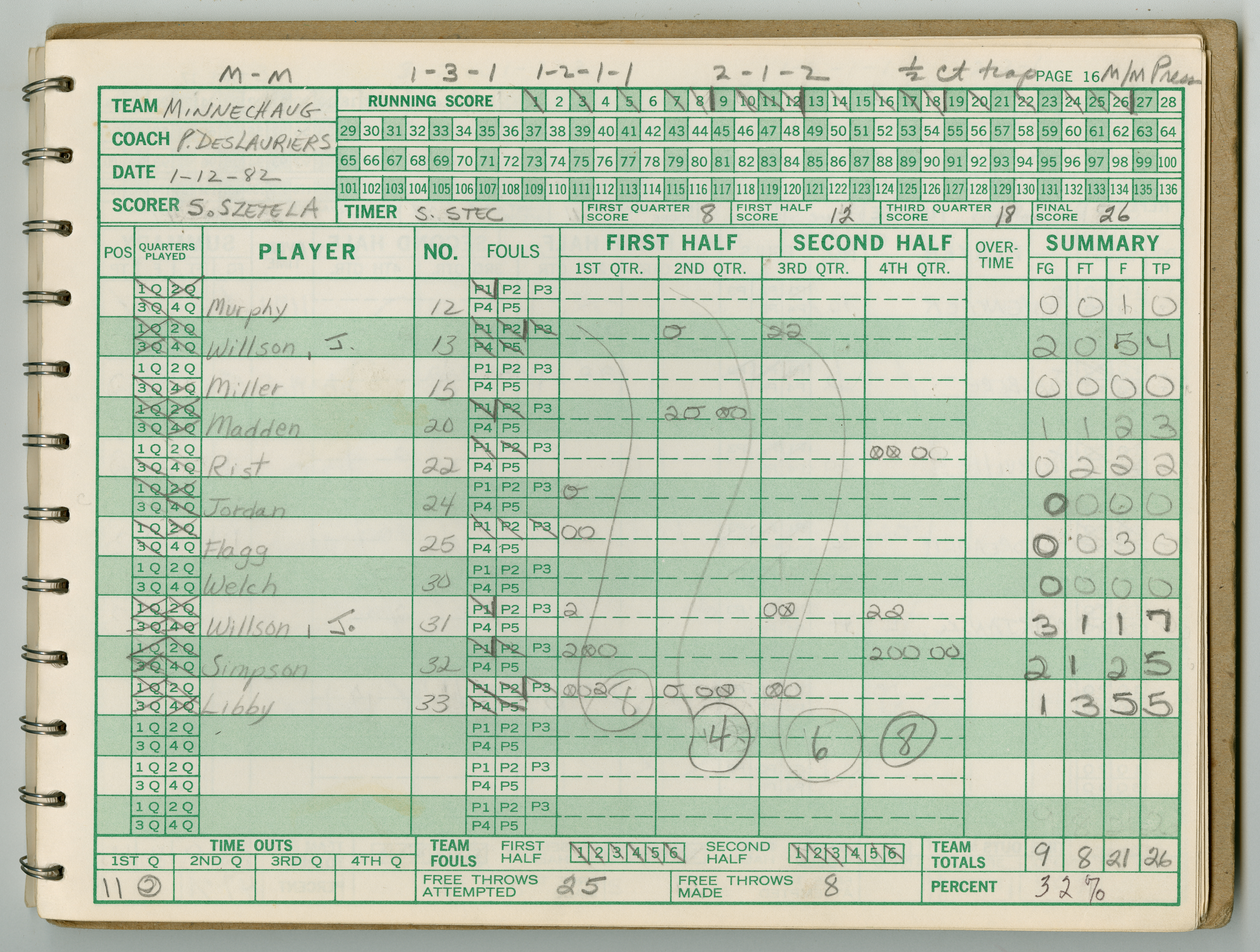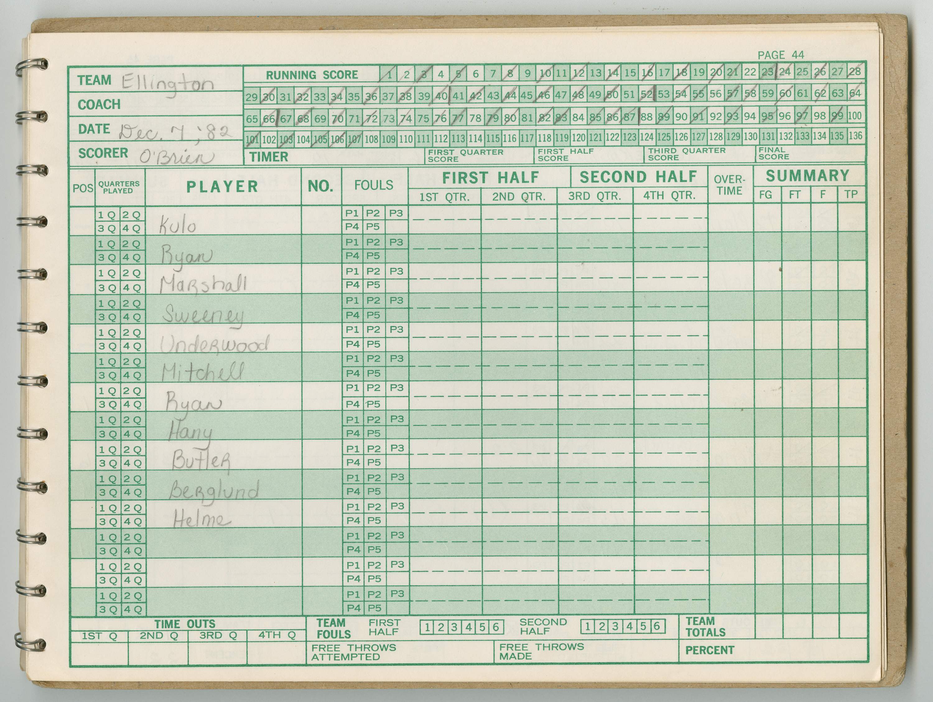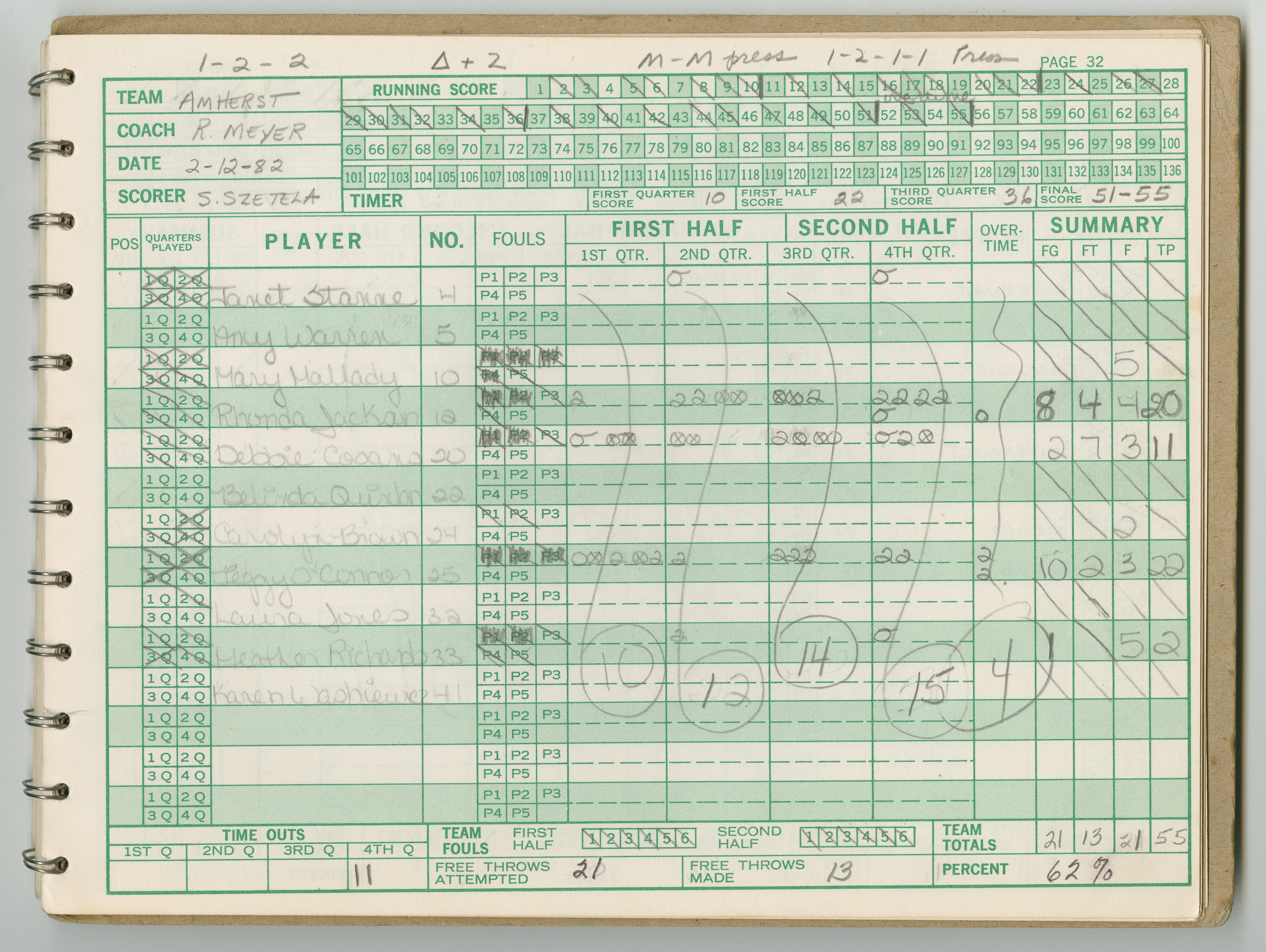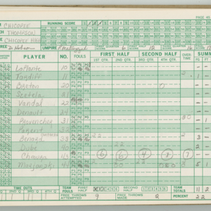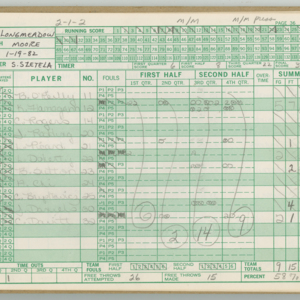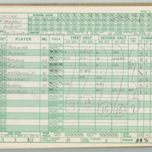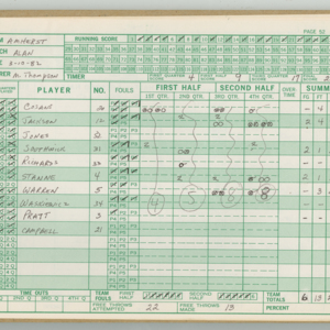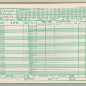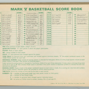 Official Scorebook of the 1981 - 1982 girl's basketball season. Each entry lists the names of the players and the complete scores and coaches notes of the game played between Chicopee and their opponent. The 1981 - 1982 season was a championship season for Chicopee and the third year coaching the girl's team for Coach Thompson.