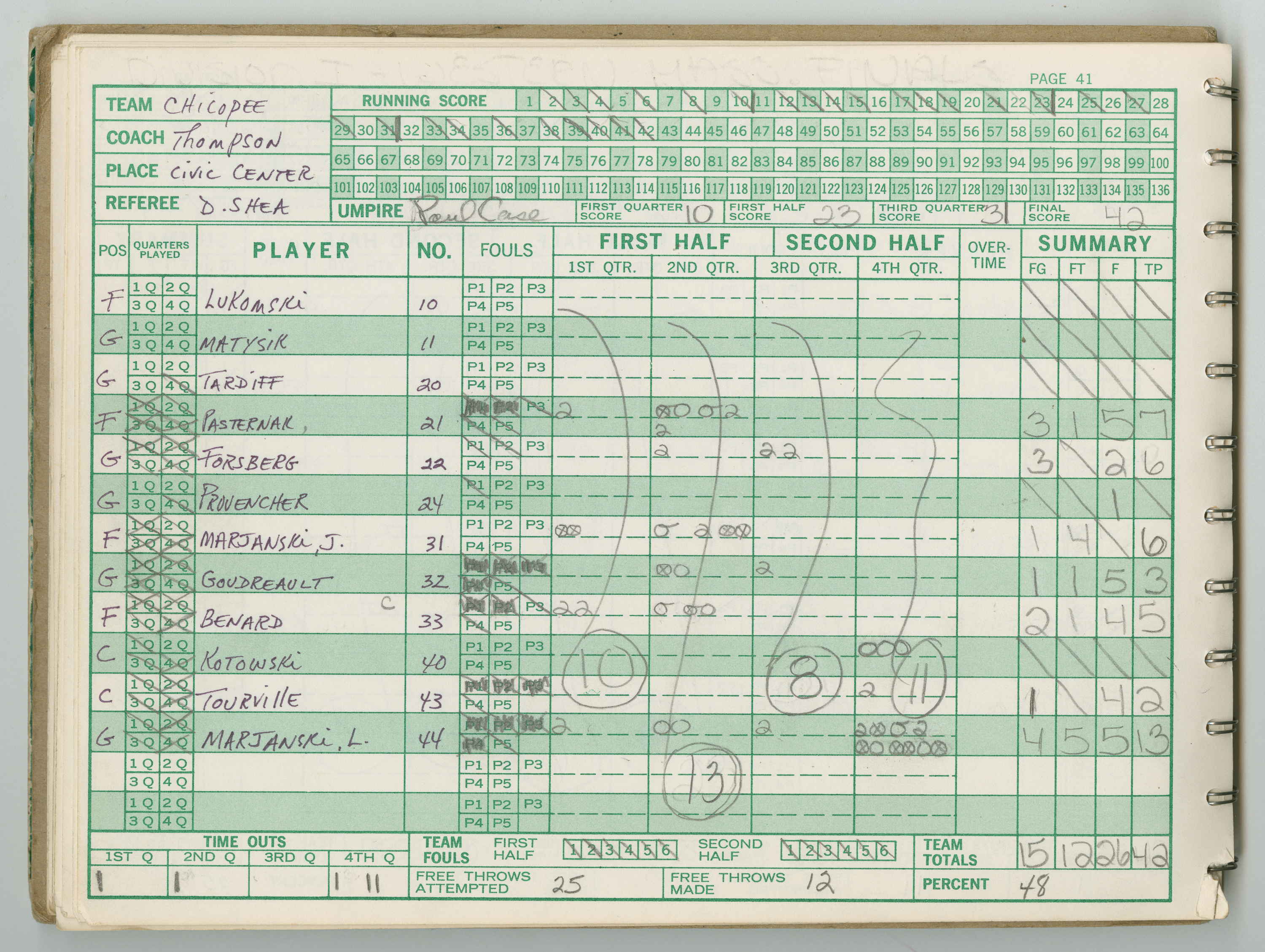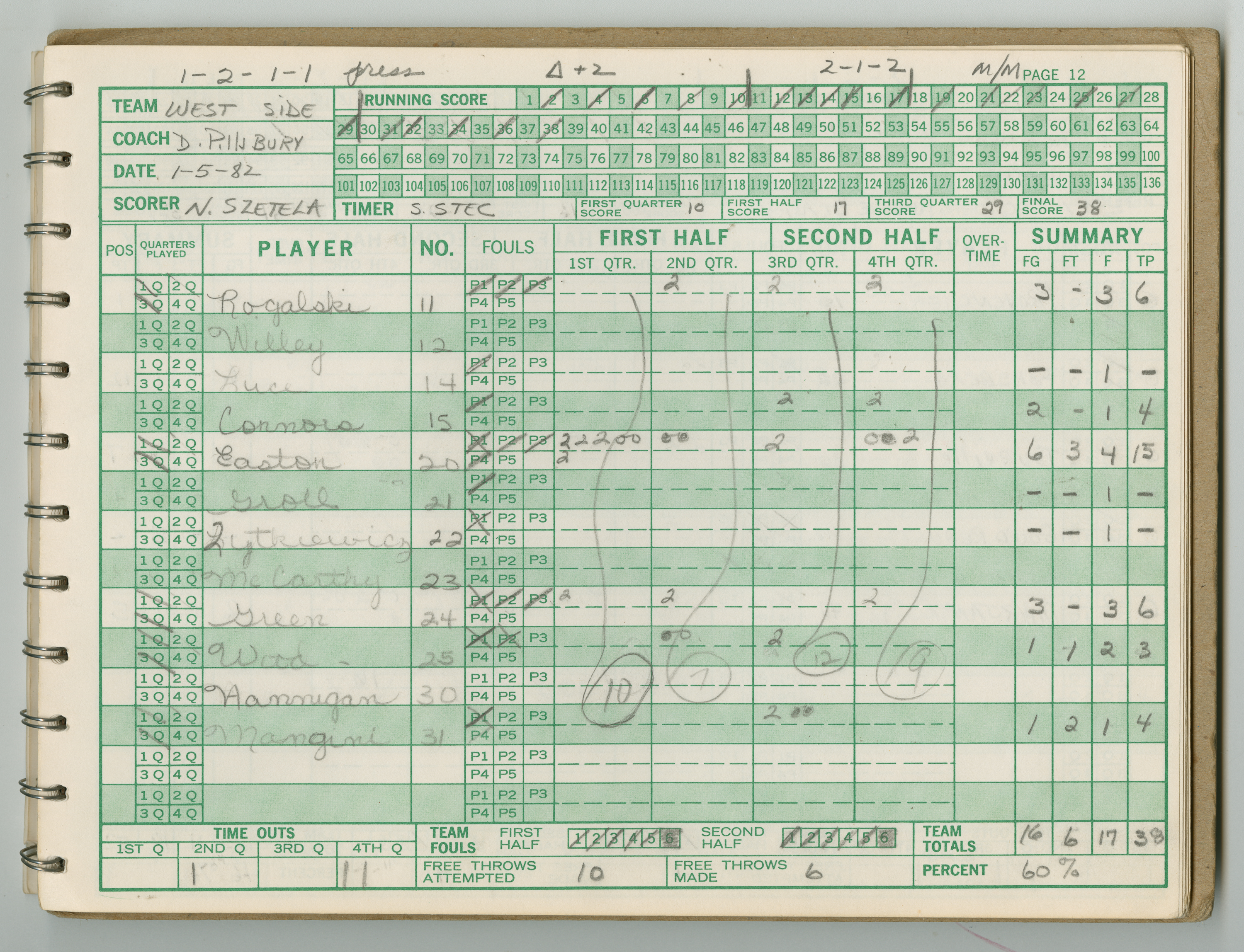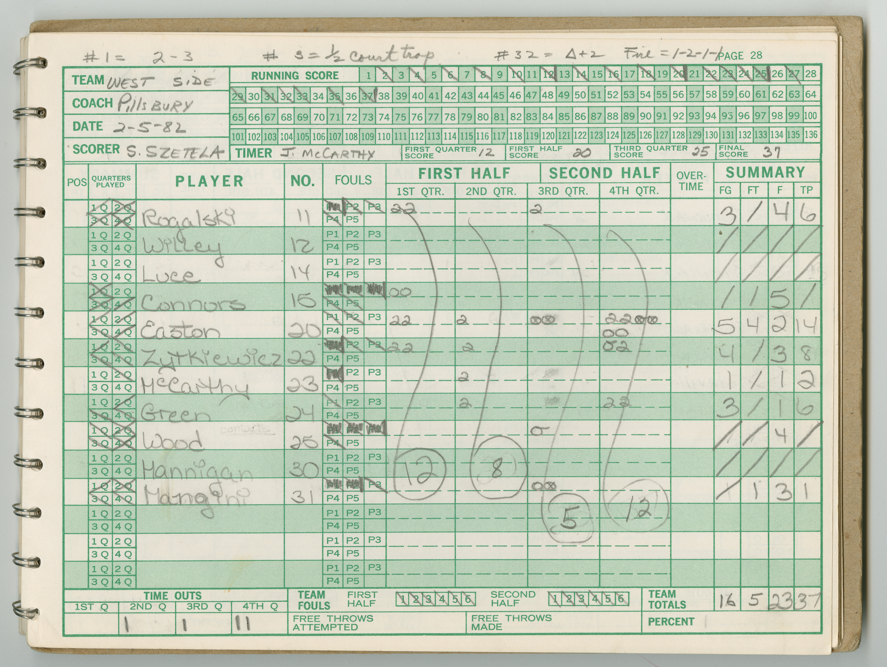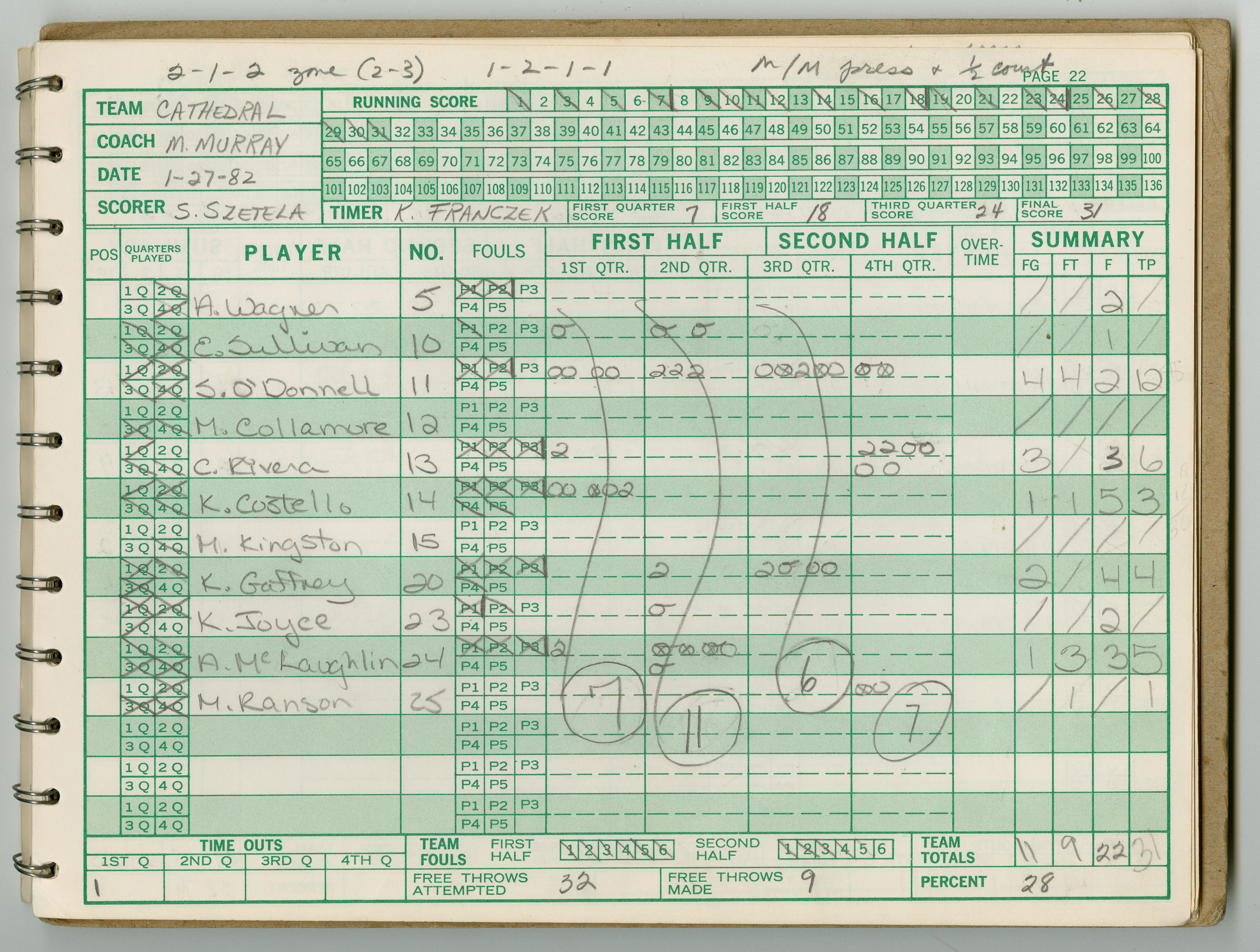Official Scorebook of the 1981 - 1982 girl's basketball season. Each entry lists the names of the players and the complete scores and coaches notes of the game played between Chicopee and their opponent. The 1981 - 1982 season was a championship season for Chicopee and the third year coaching the girl's team for Coach Thompson.