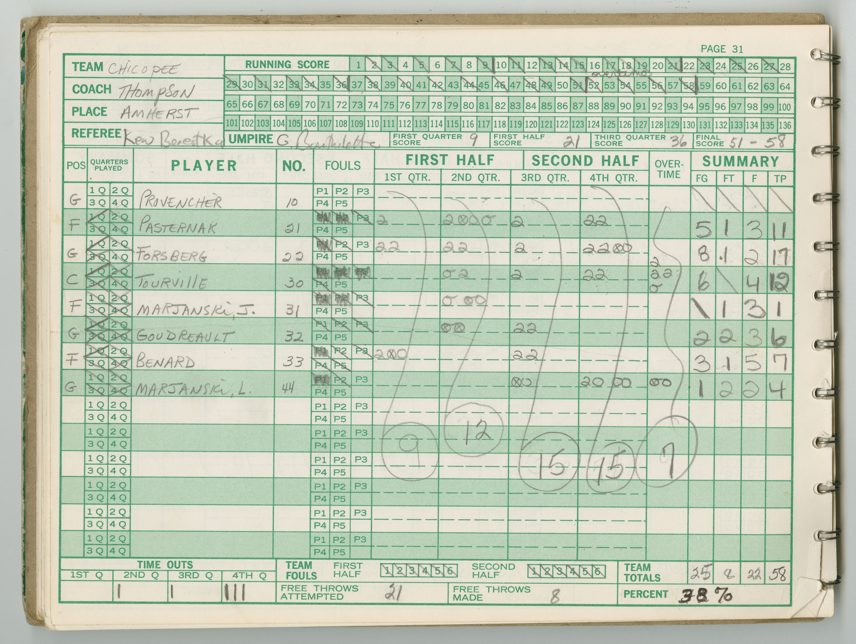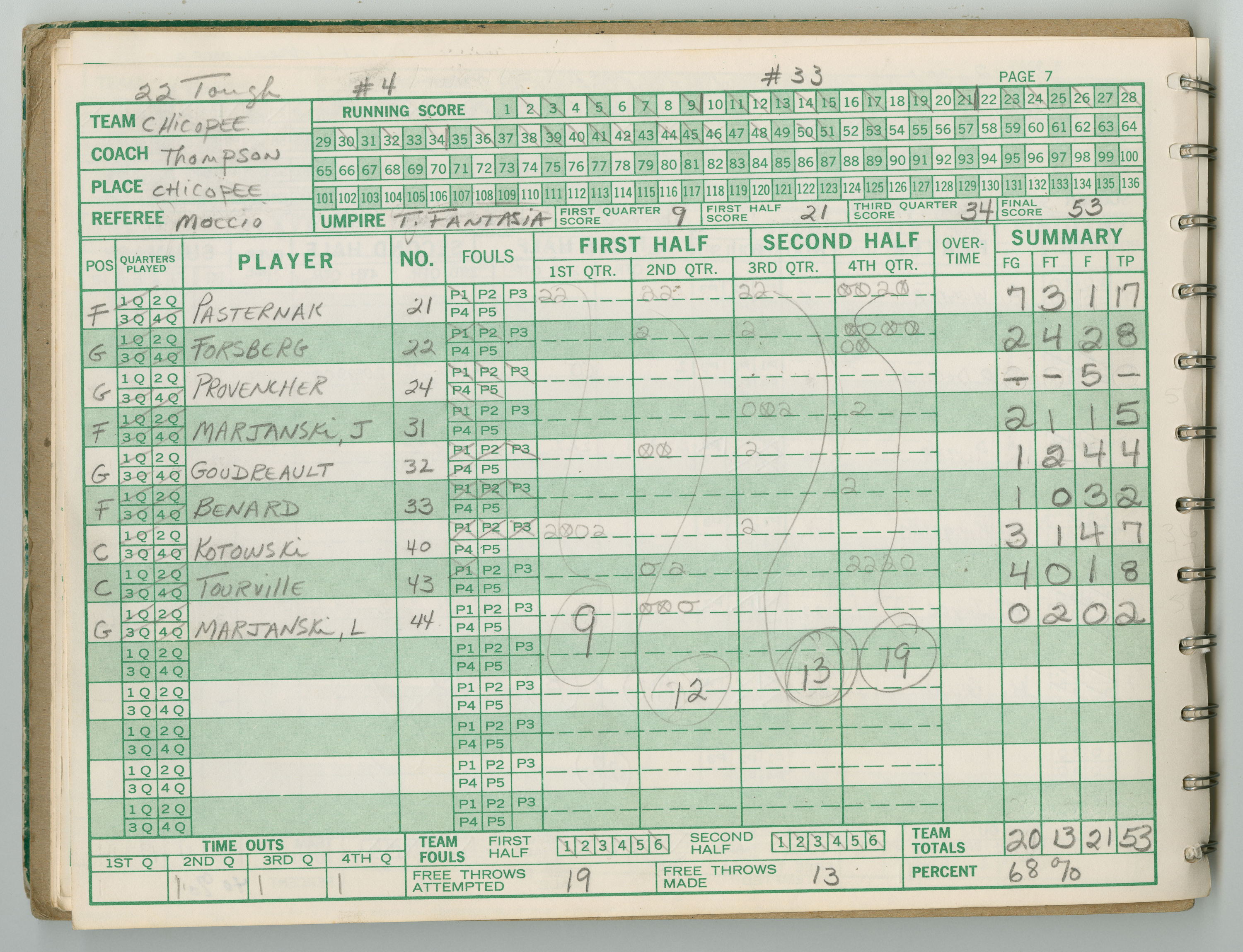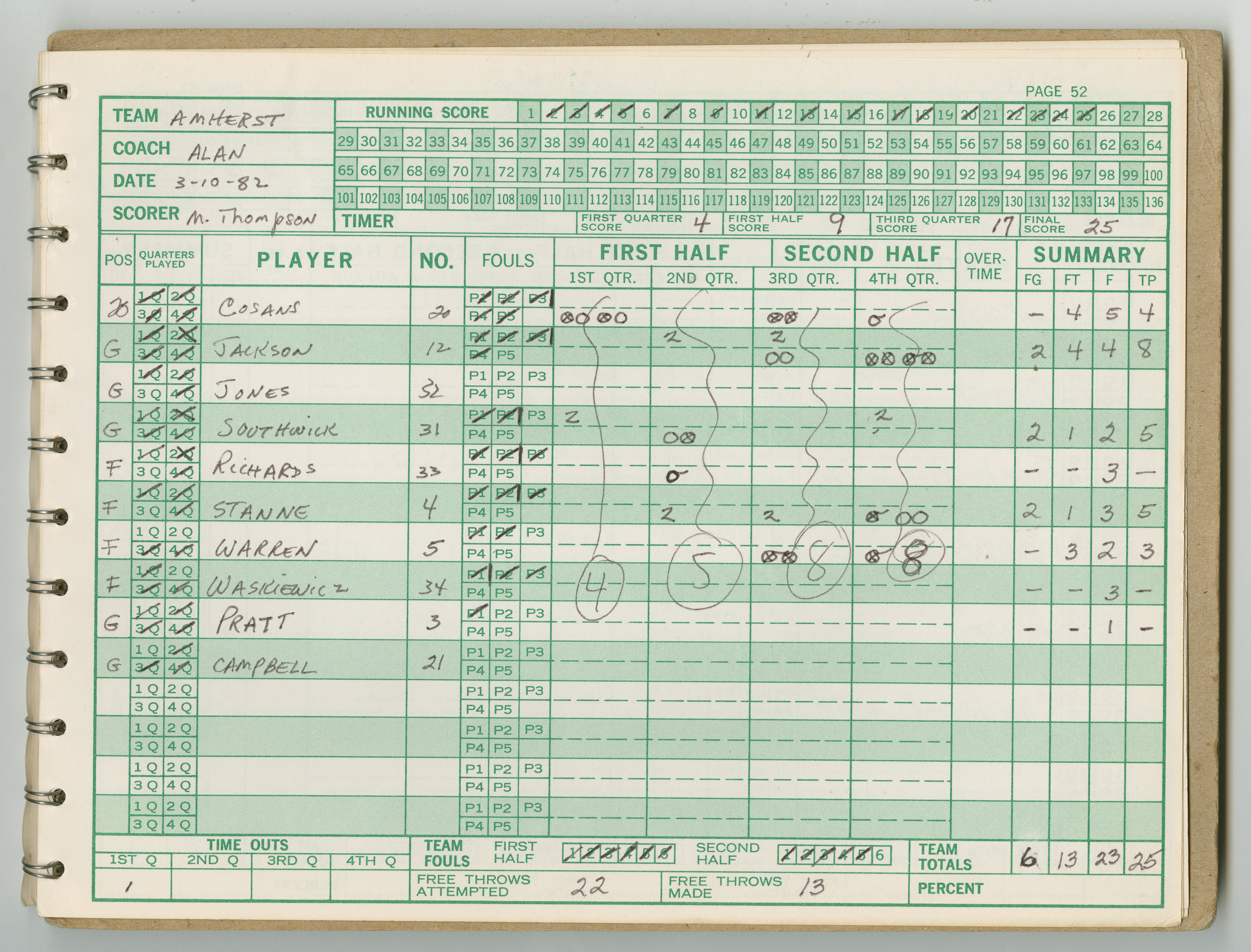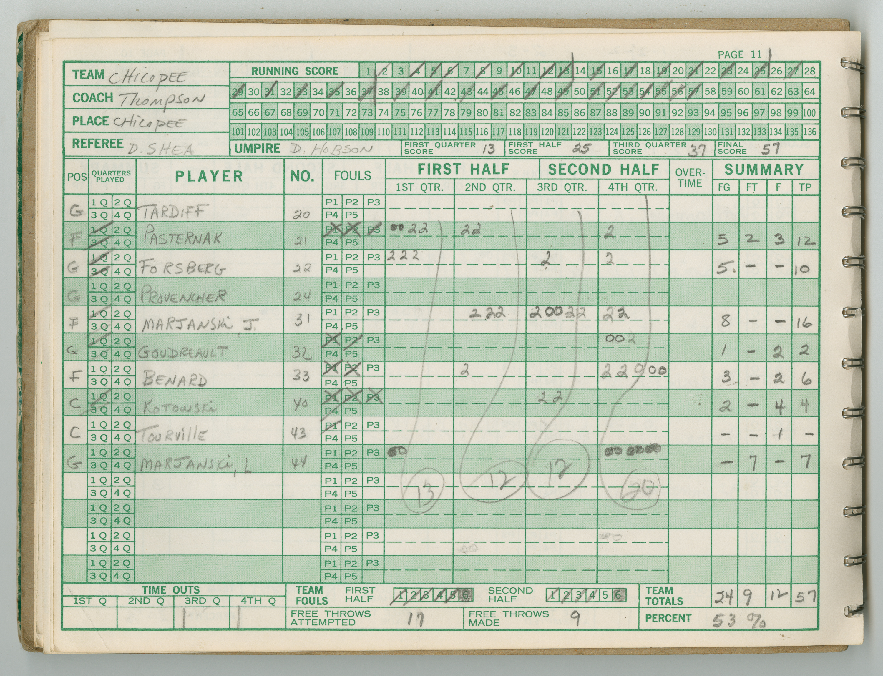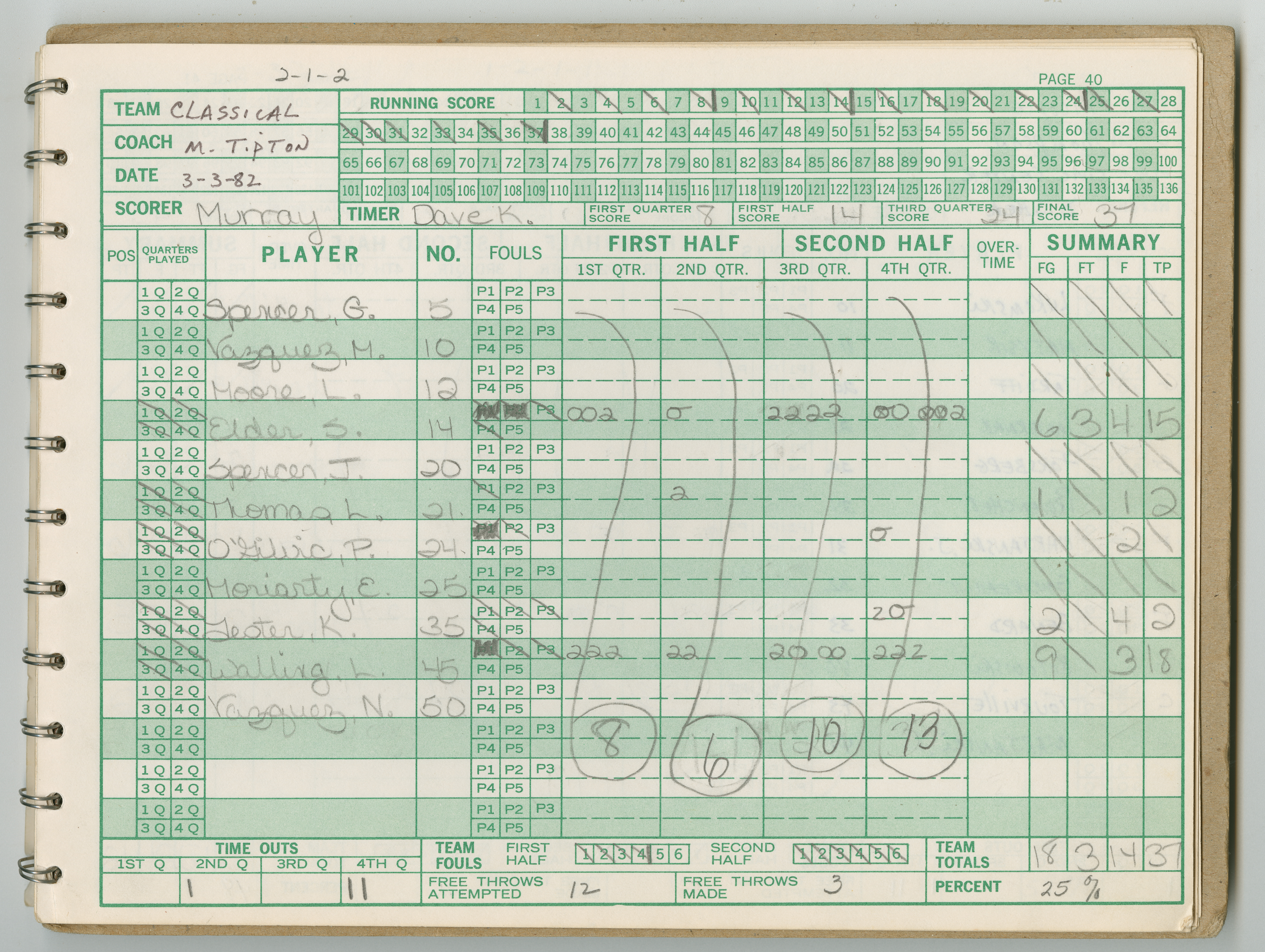 Official Scorebook of the 1981 - 1982 girl's basketball season. Each entry lists the names of the players and the complete scores and coaches notes of the game played between Chicopee and their opponent. The 1981 - 1982 season was a championship season for Chicopee and the third year coaching the girl's team for Coach Thompson.