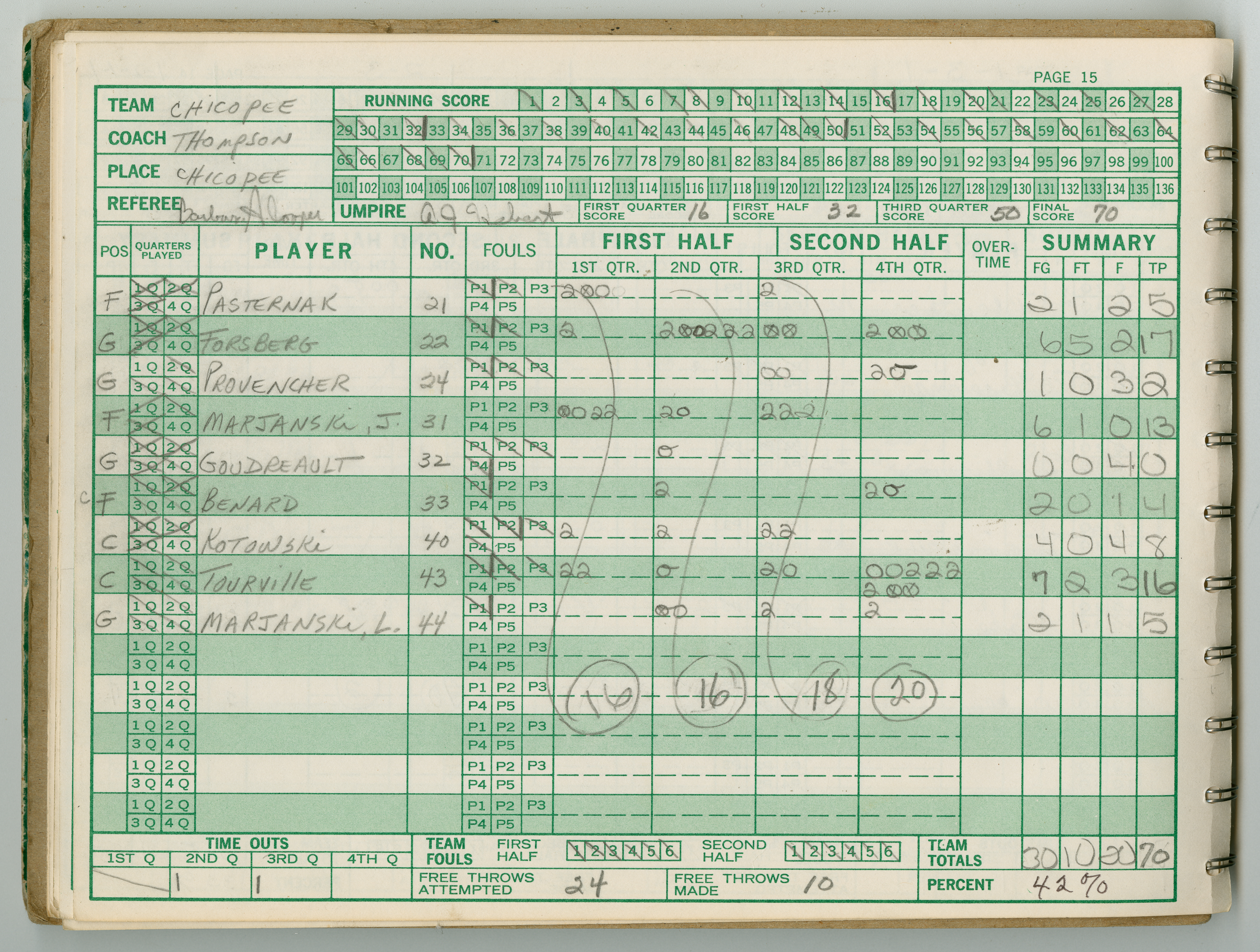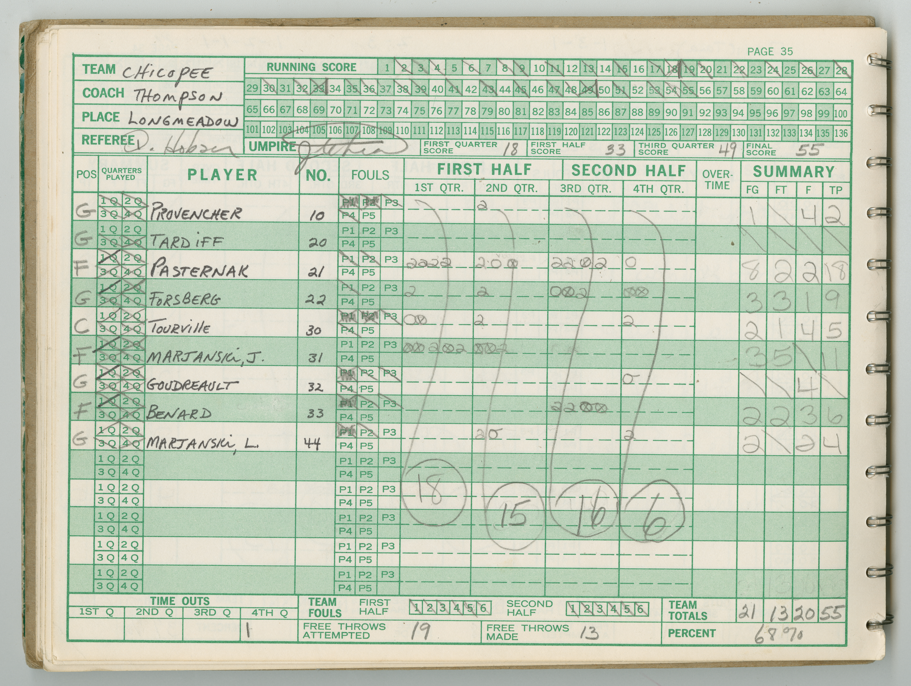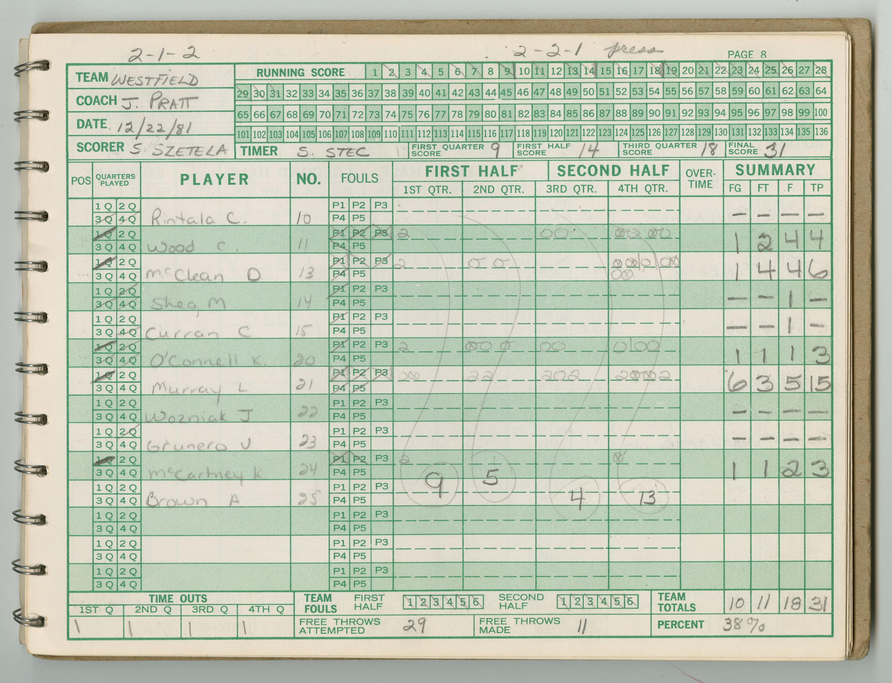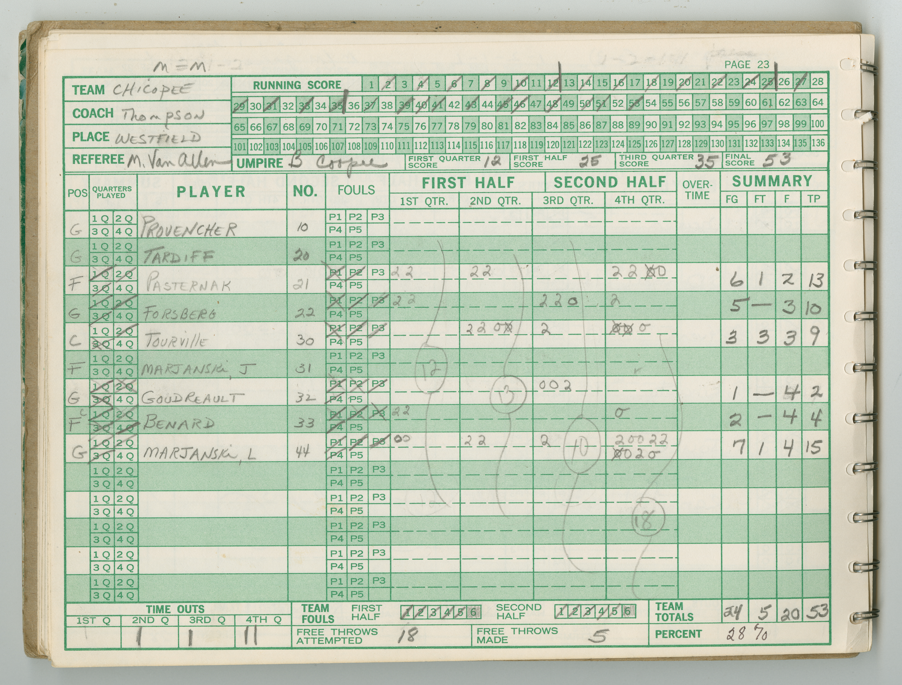 Official Scorebook of the 1981 - 1982 girl's basketball season. Each entry lists the names of the players and the complete scores and coaches notes of the game played between Chicopee and their opponent. The 1981 - 1982 season was a championship season for Chicopee and the third year coaching the girl's team for Coach Thompson.