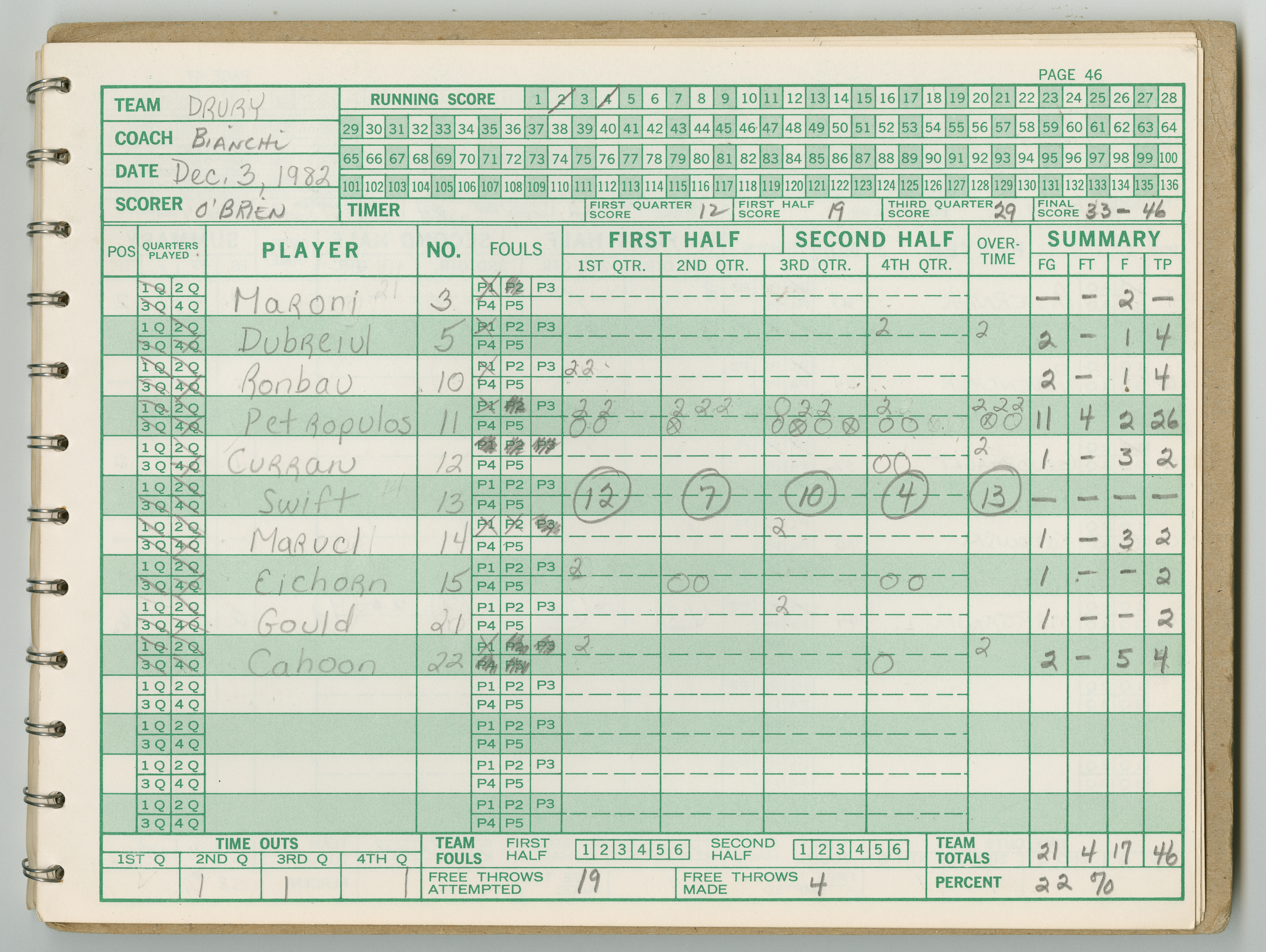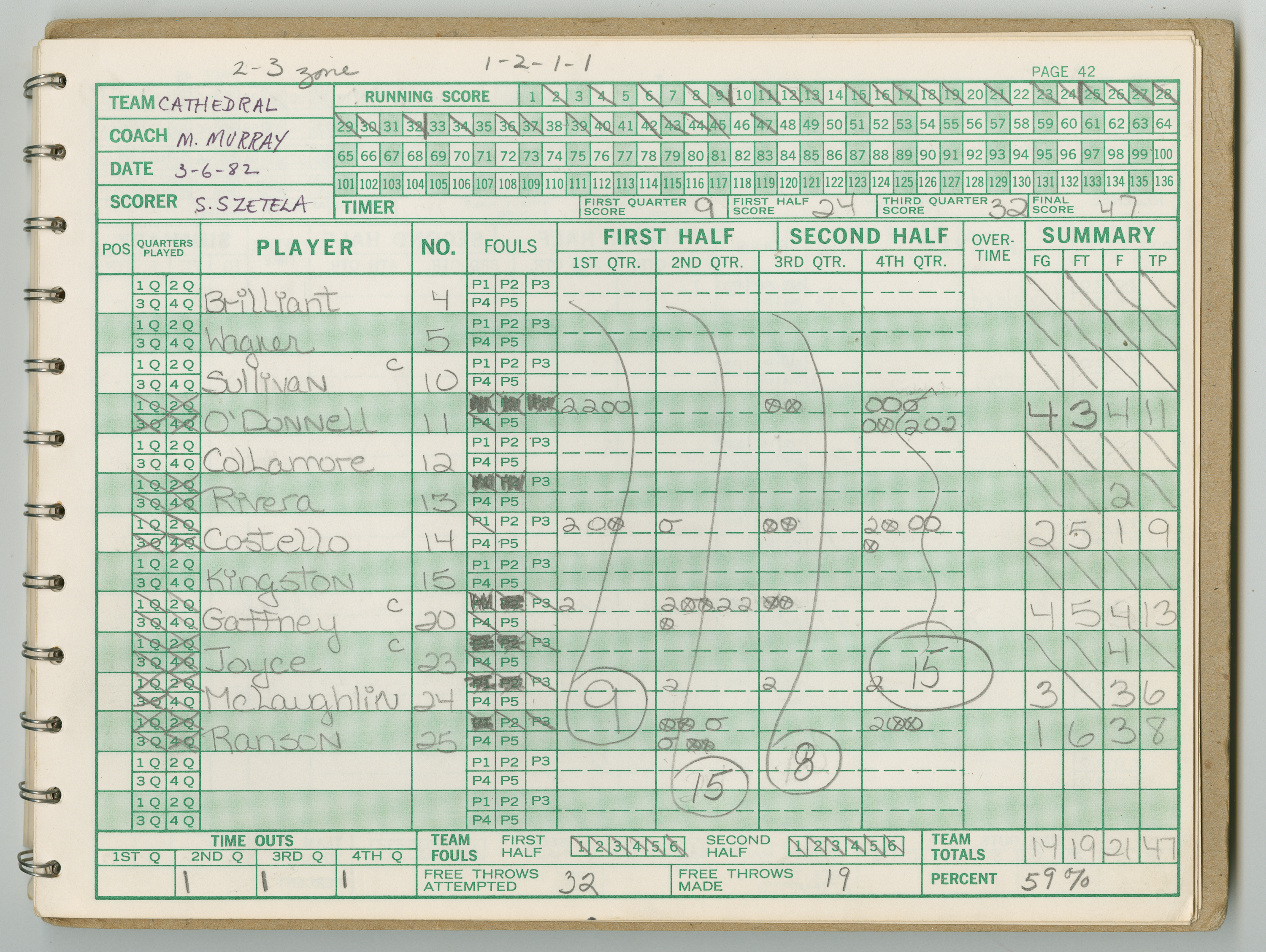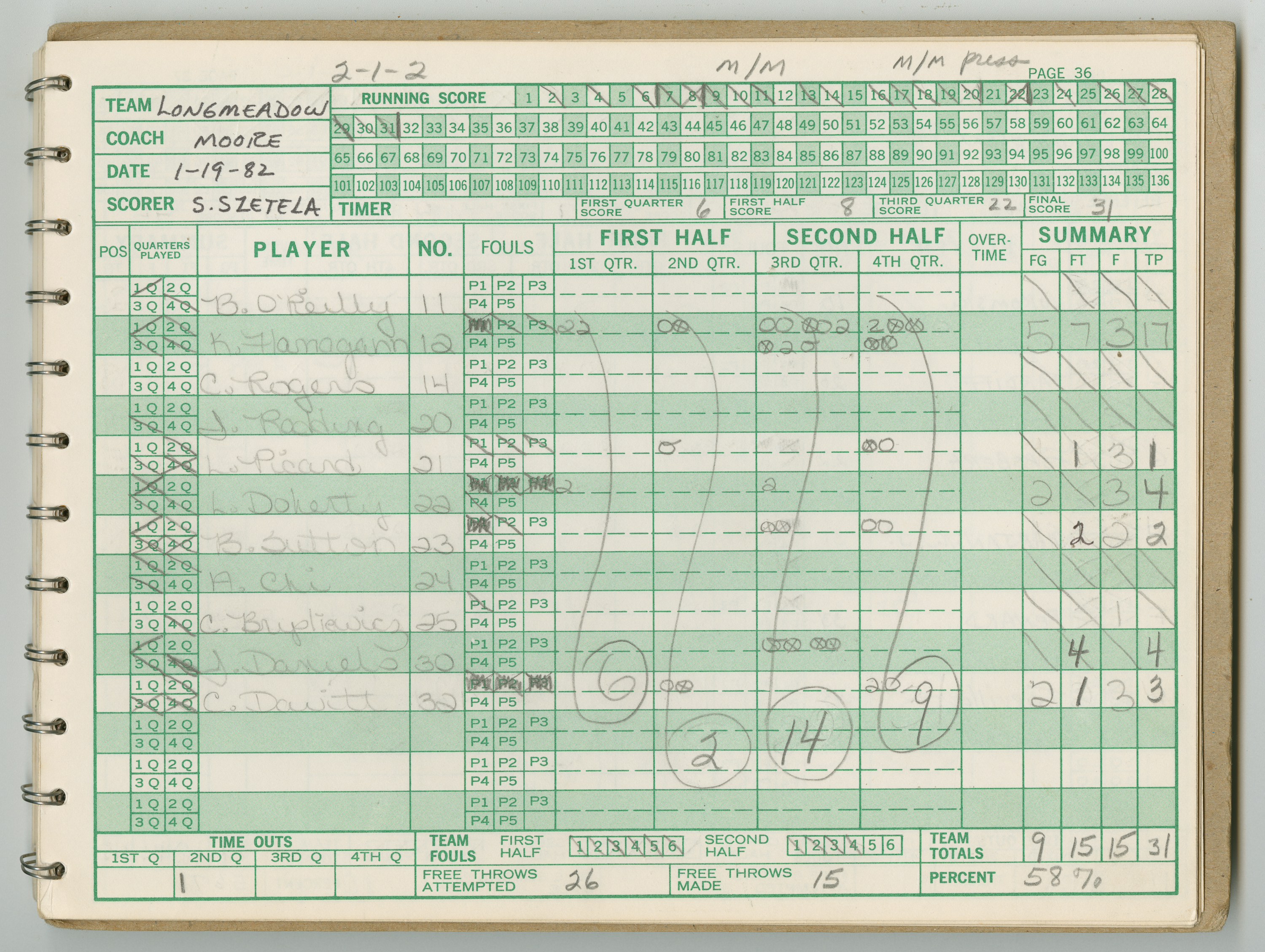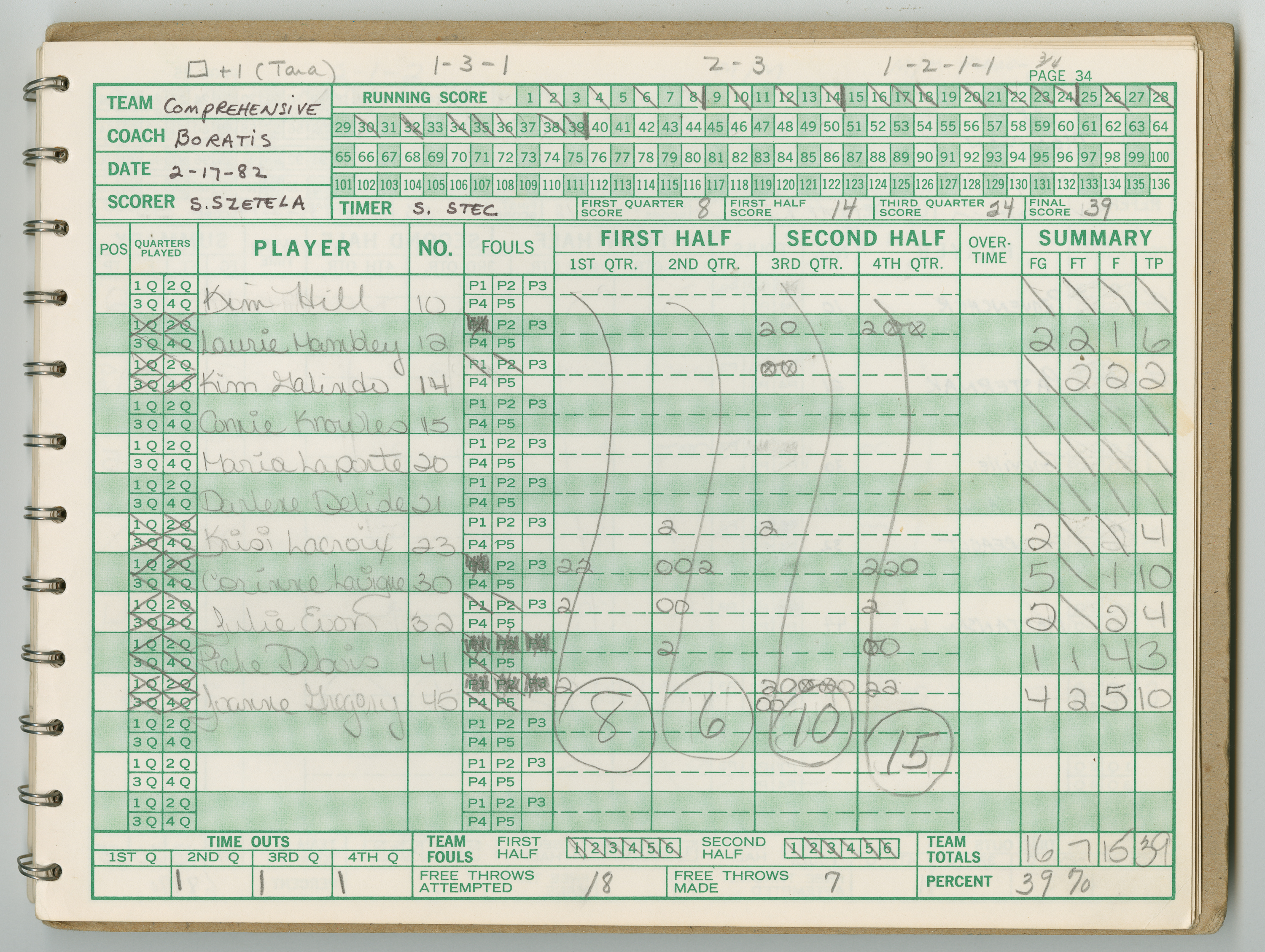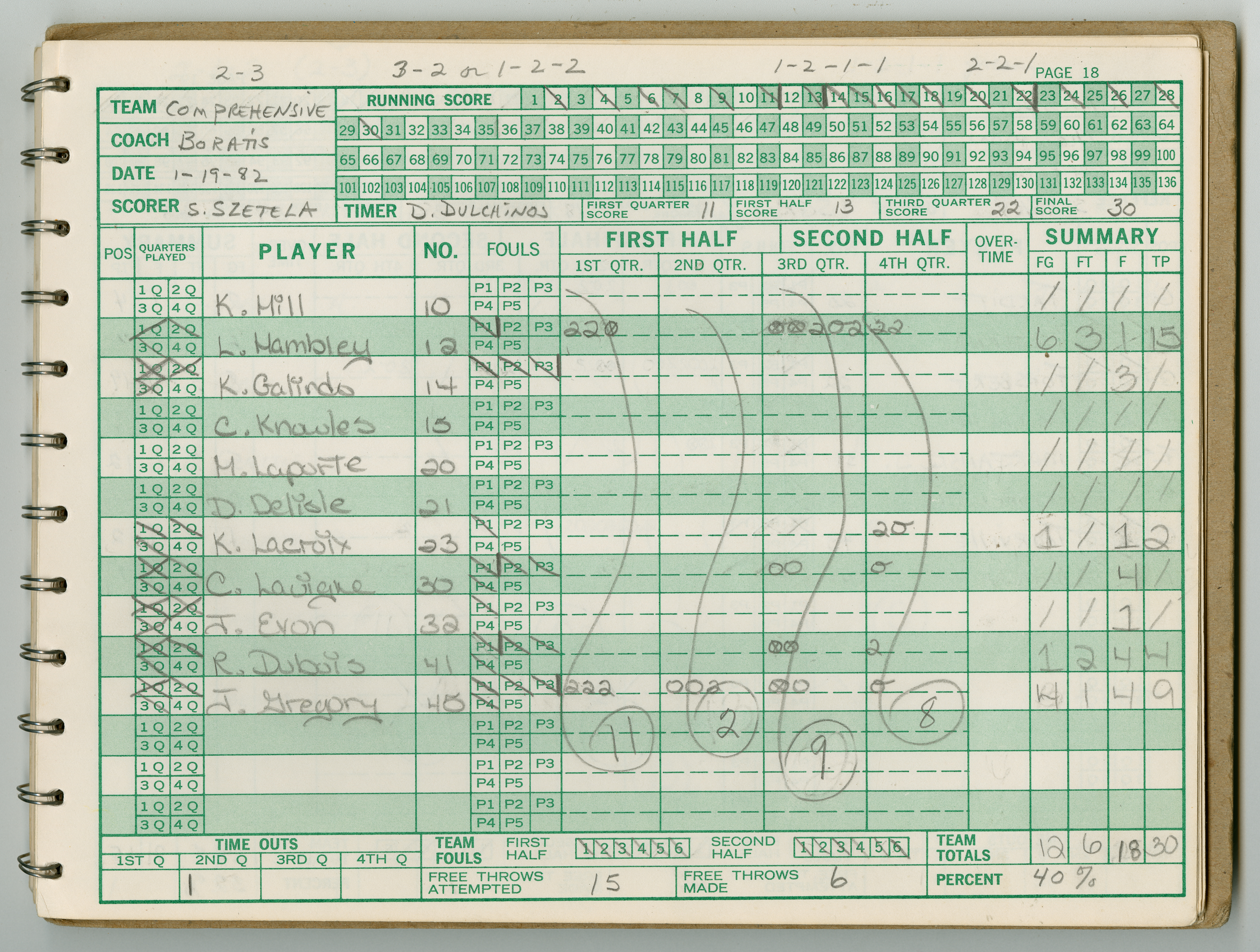 Official Scorebook of the 1981 - 1982 girl's basketball season. Each entry lists the names of the players and the complete scores and coaches notes of the game played between Chicopee and their opponent. The 1981 - 1982 season was a championship season for Chicopee and the third year coaching the girl's team for Coach Thompson.