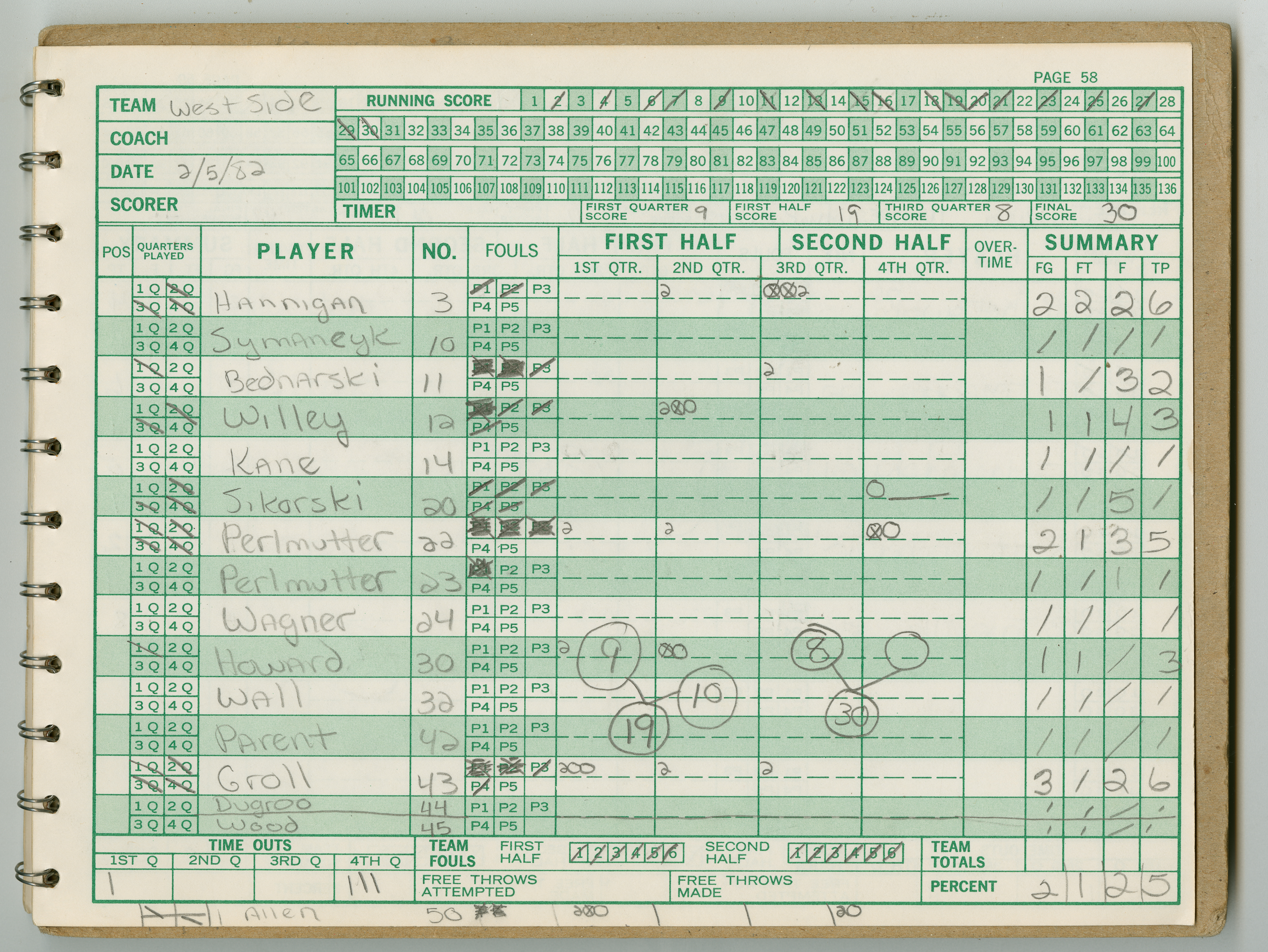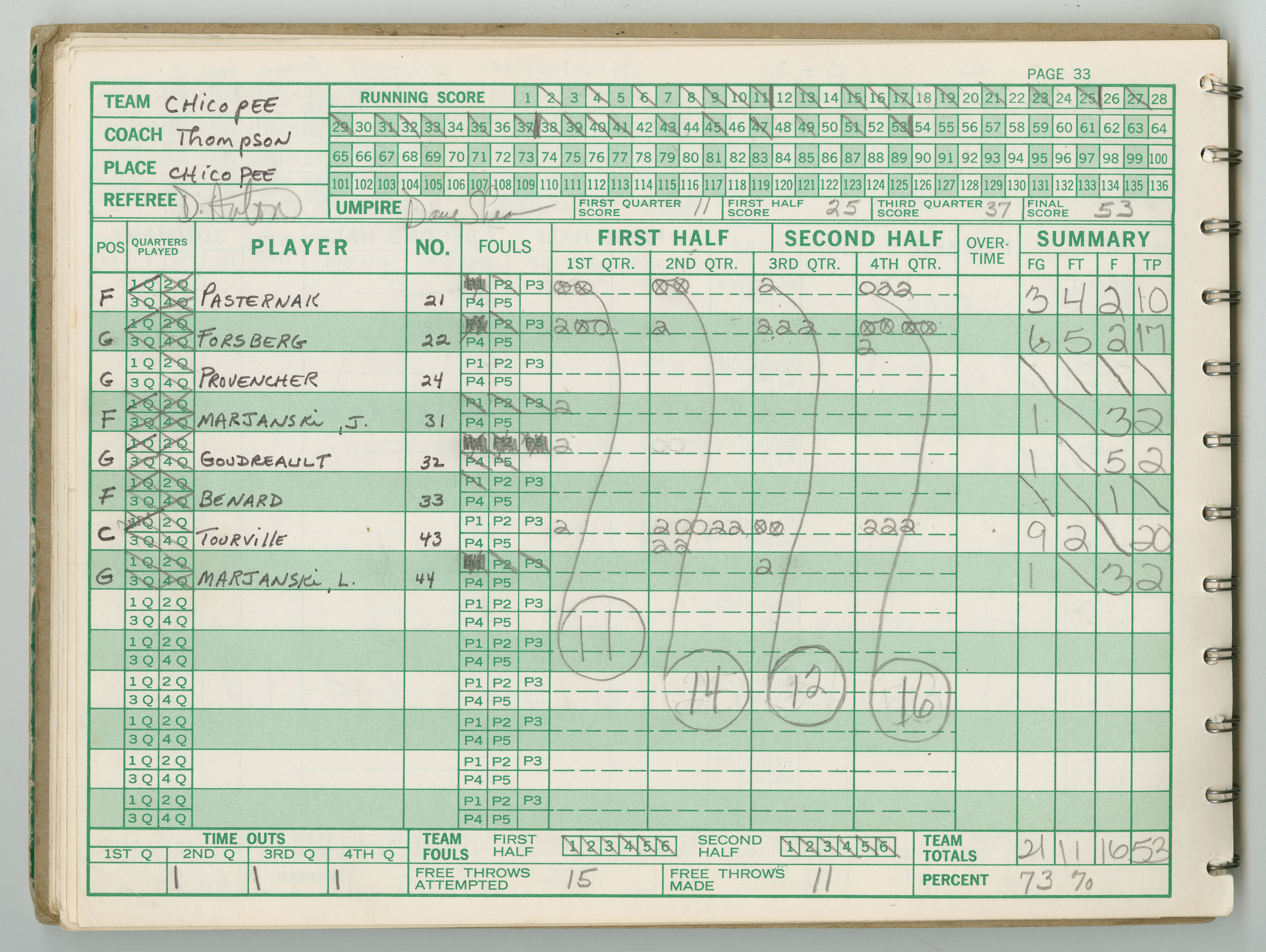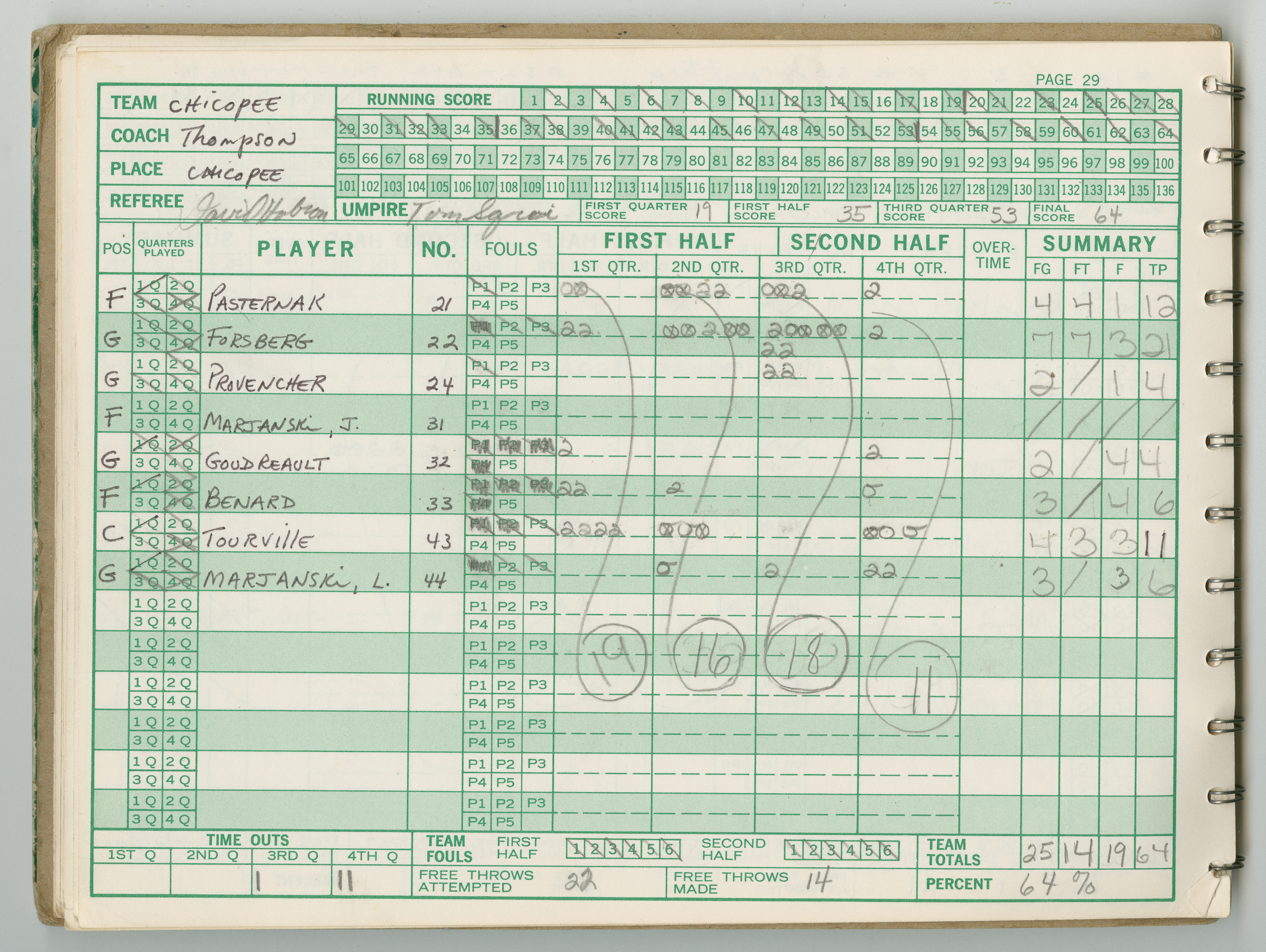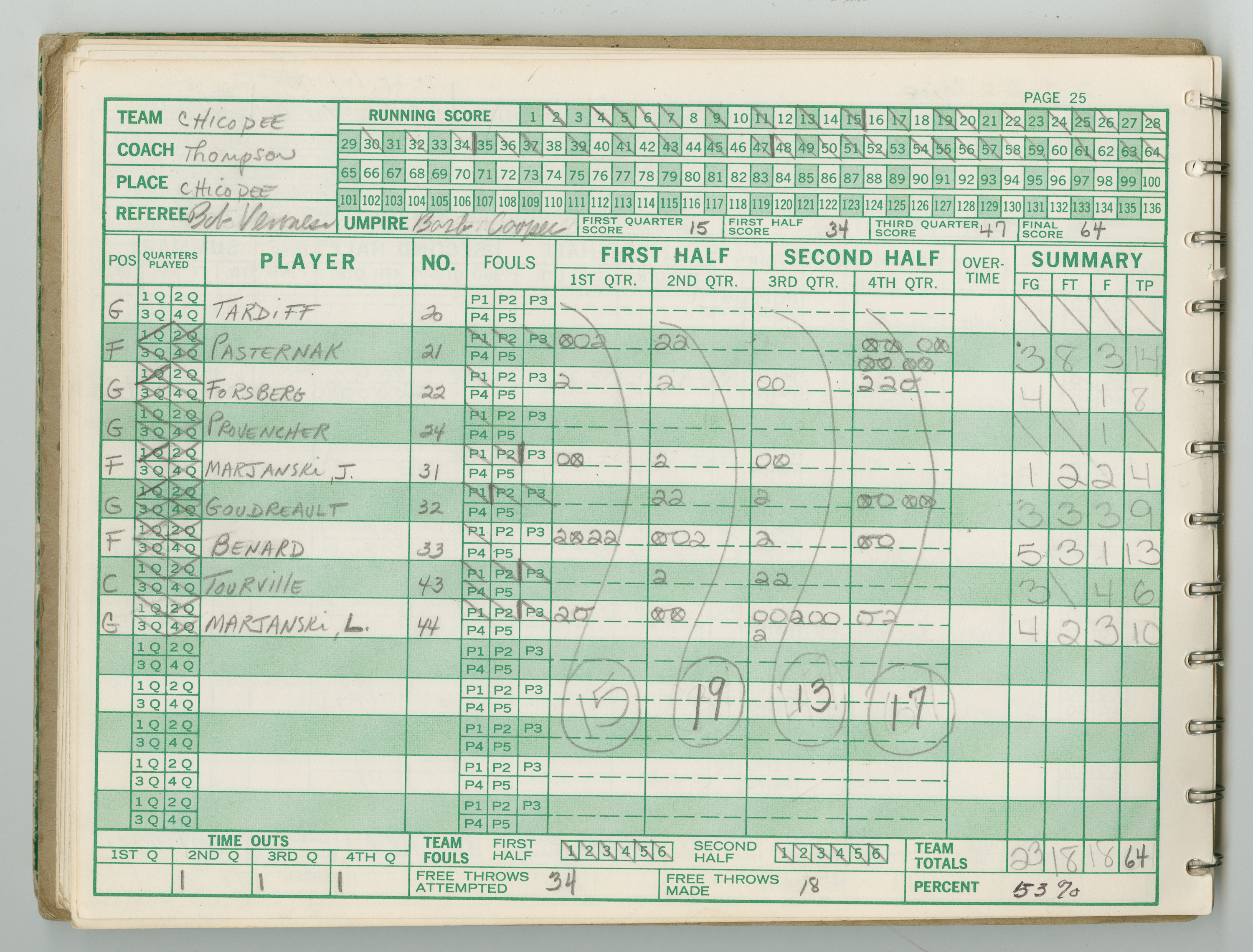 Official Scorebook of the 1981 - 1982 girl's basketball season. Each entry lists the names of the players and the complete scores and coaches notes of the game played between Chicopee and their opponent. The 1981 - 1982 season was a championship season for Chicopee and the third year coaching the girl's team for Coach Thompson.
