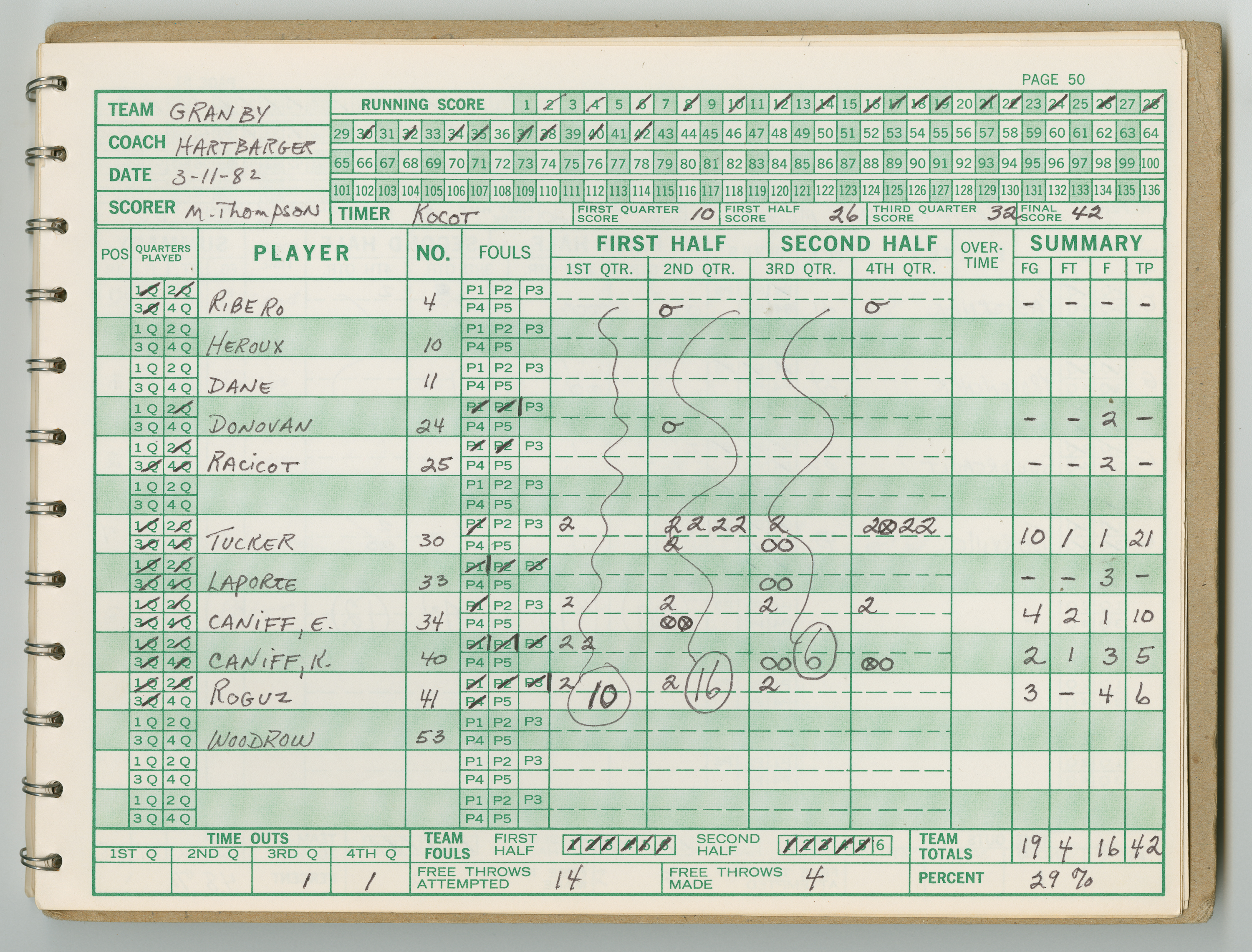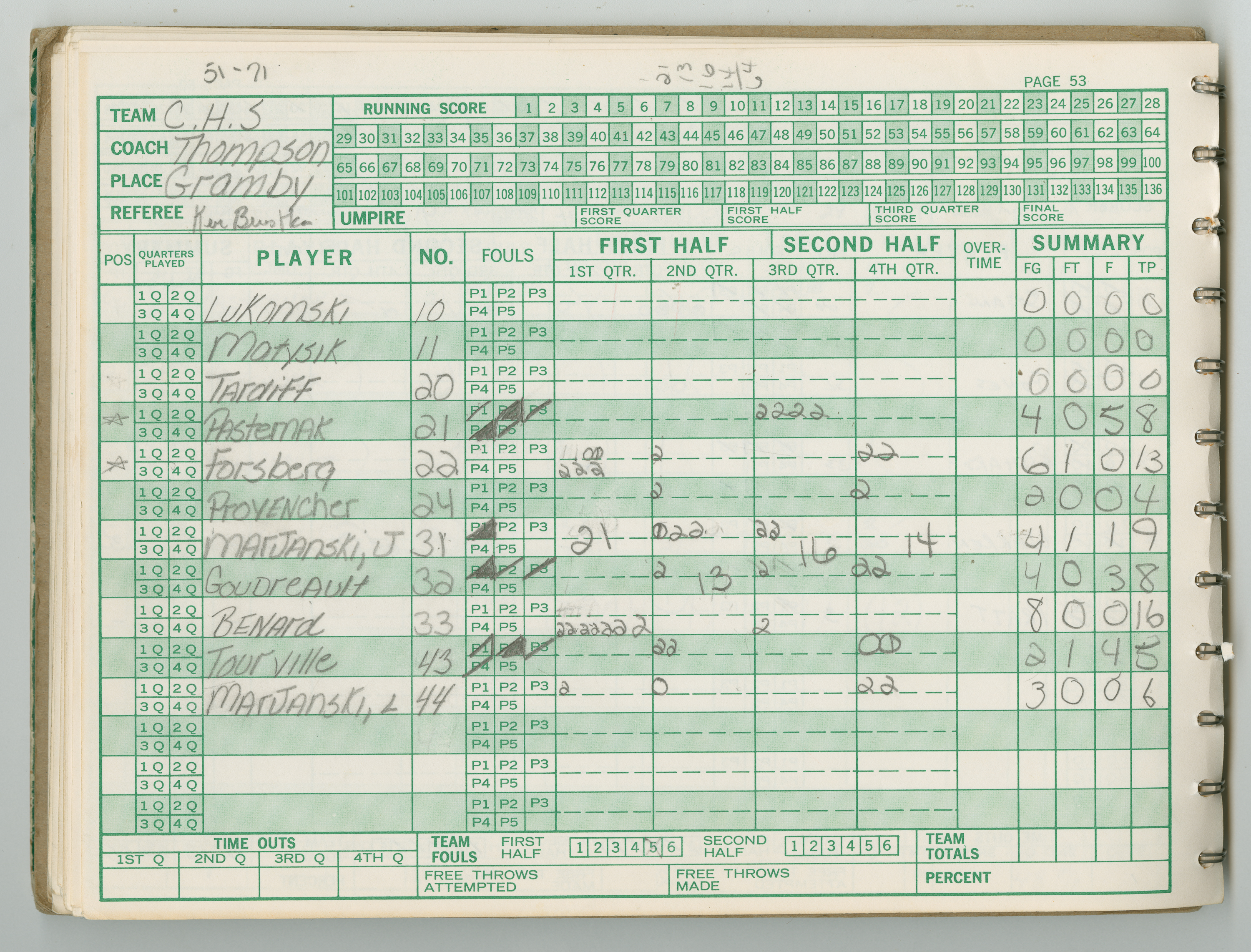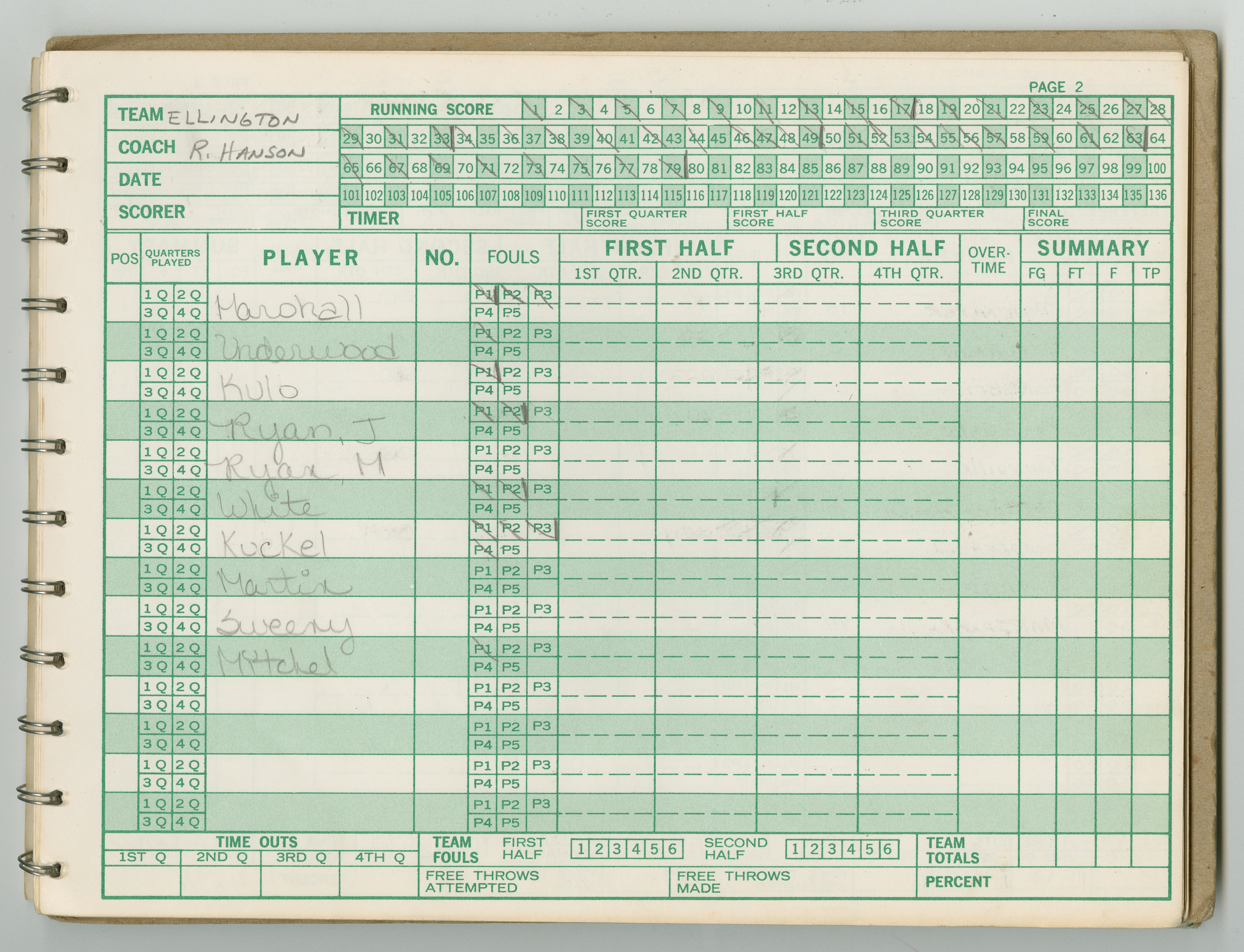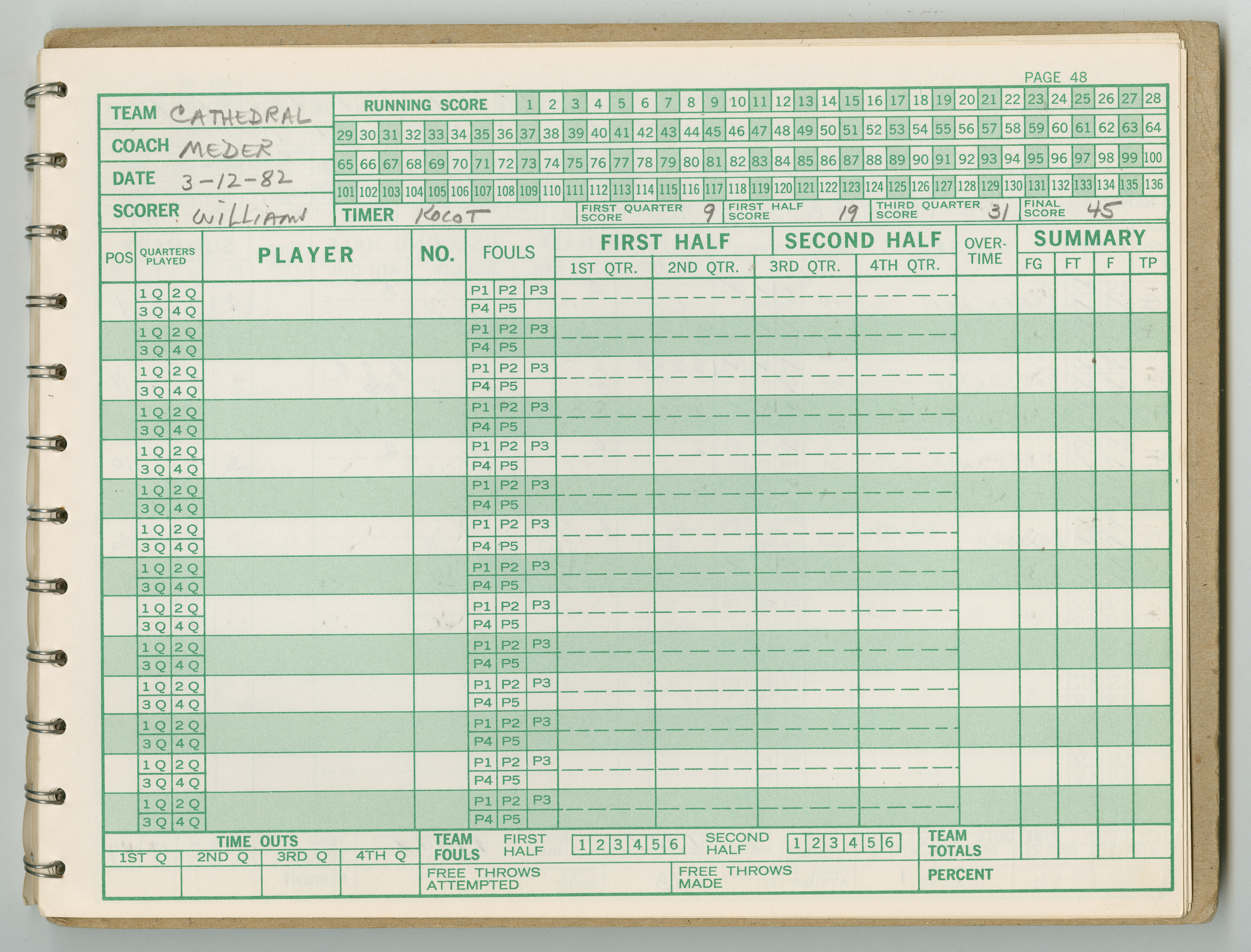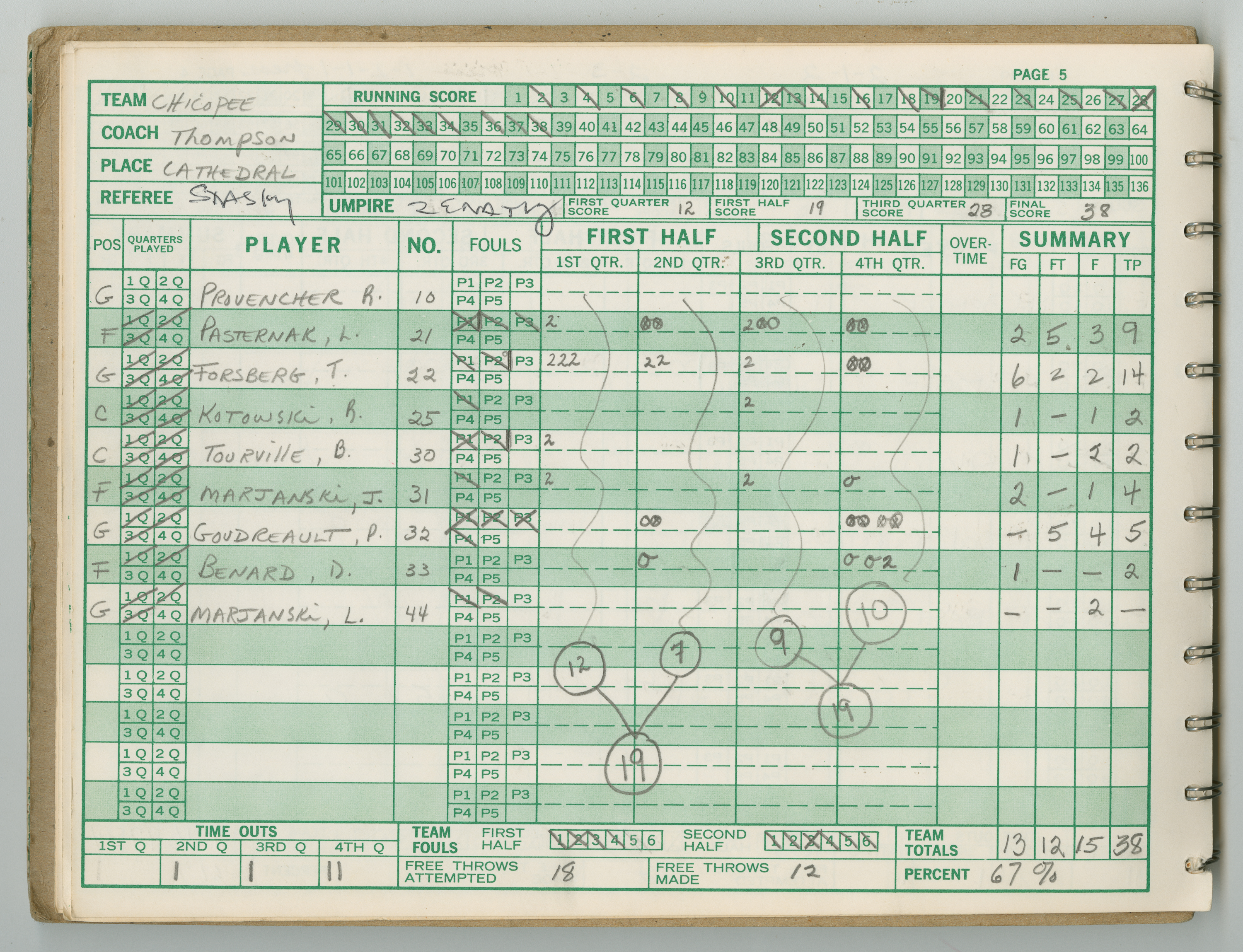 Official Scorebook of the 1981 - 1982 girl's basketball season. Each entry lists the names of the players and the complete scores and coaches notes of the game played between Chicopee and their opponent. The 1981 - 1982 season was a championship season for Chicopee and the third year coaching the girl's team for Coach Thompson.