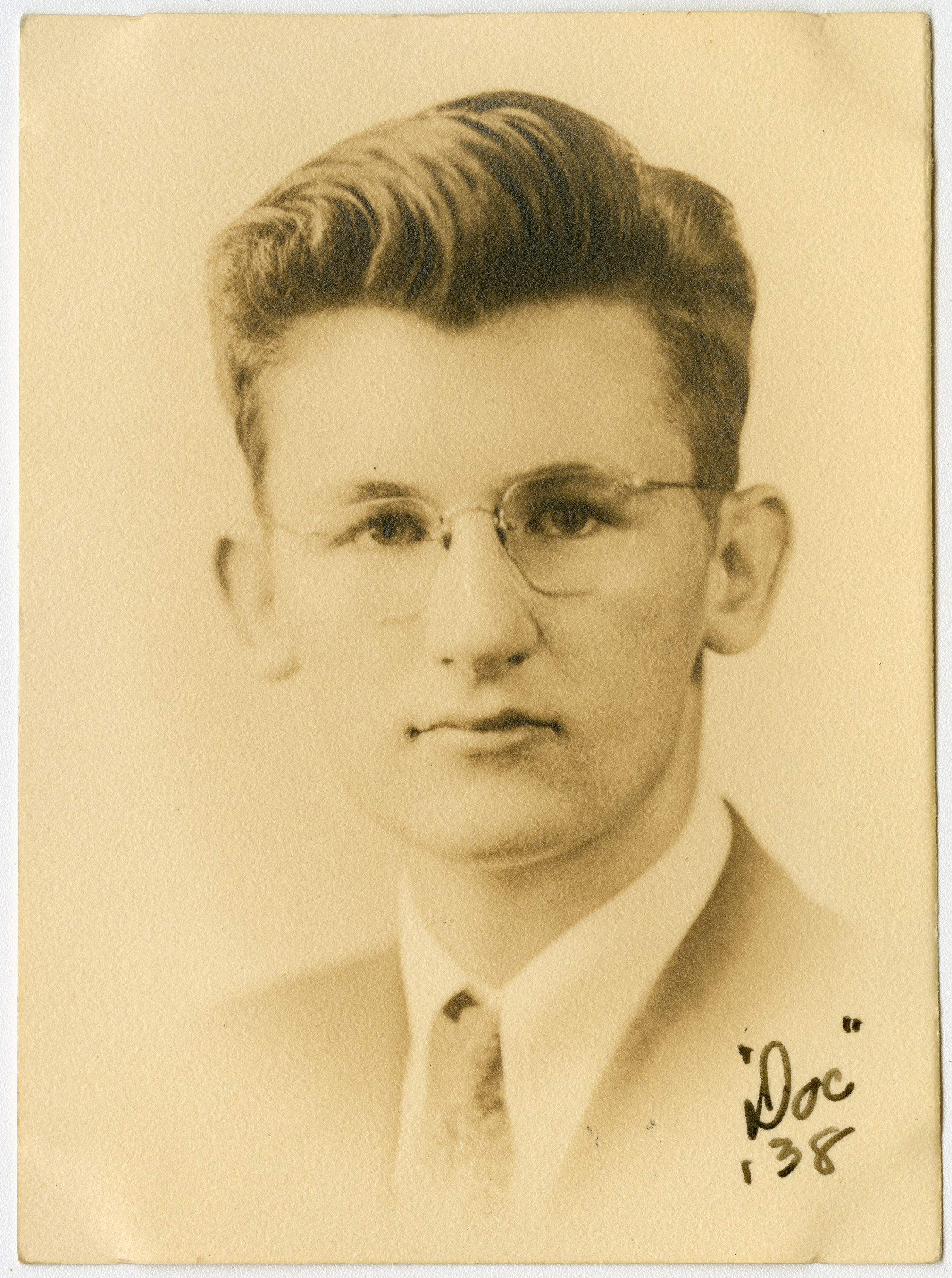 Senior portrait of a young man from the Chicopee High School Class of 1938 showing head, shoulders and face with the shoulders facing to the front. The subject is looking directly at the camera. Soft light illuminates the most of the face. The subject is wearing a dark suit with a white shirt and patterned tie. Writing on the bottom right of the print says "Doc ' 38."