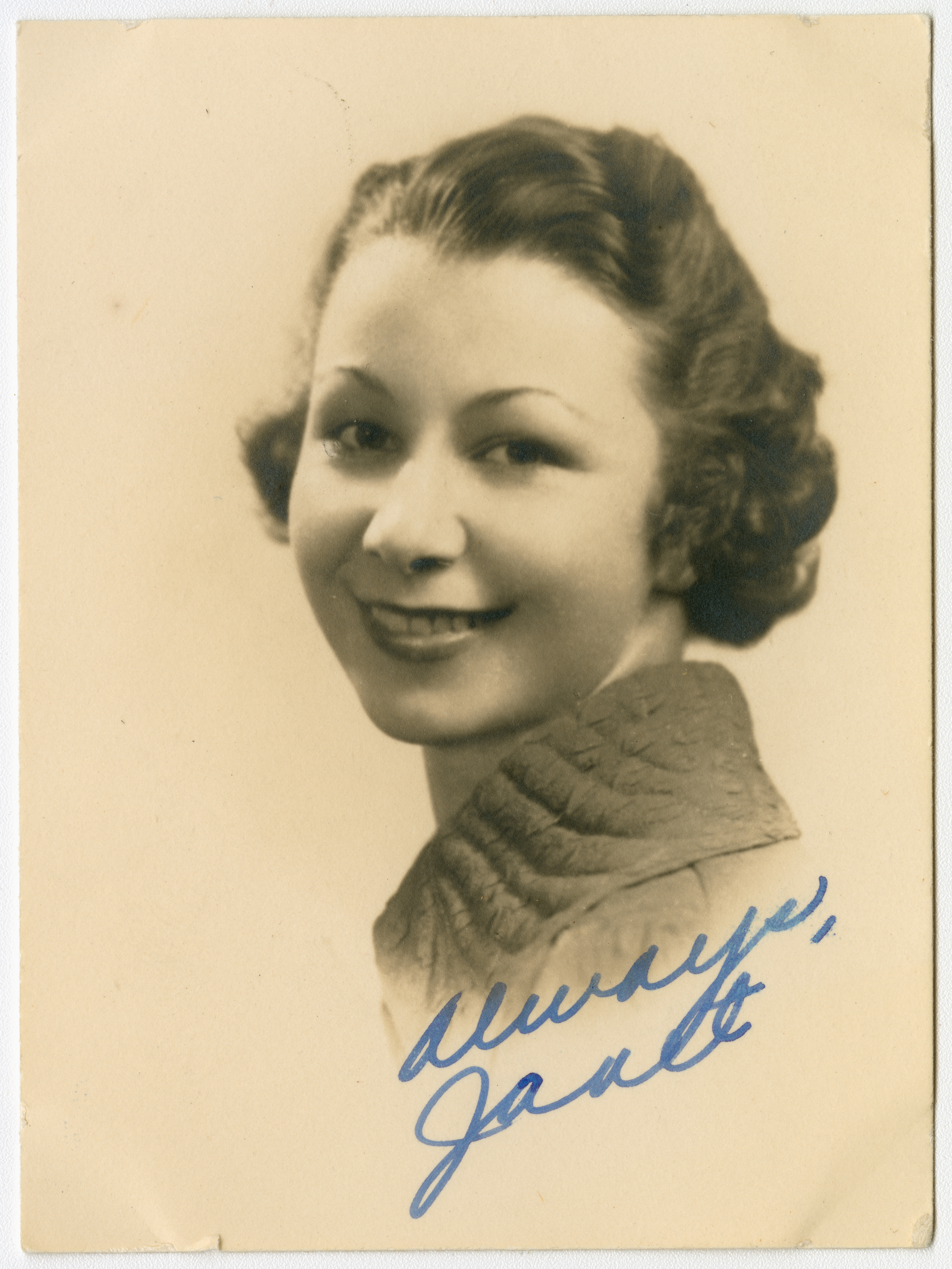 Senior portrait of a young woman from the Chicopee High School Class of 1938 showing head, shoulders and face with the shoulders and face turned to the left. She is looking back towards the camera. Strong light illuminates the right side of her face. The subject is wearing a dark quilted shirt in contrast to the background. A strong fade surrounds the subject. Writing on the bottom right of the print says "Always, Janet."