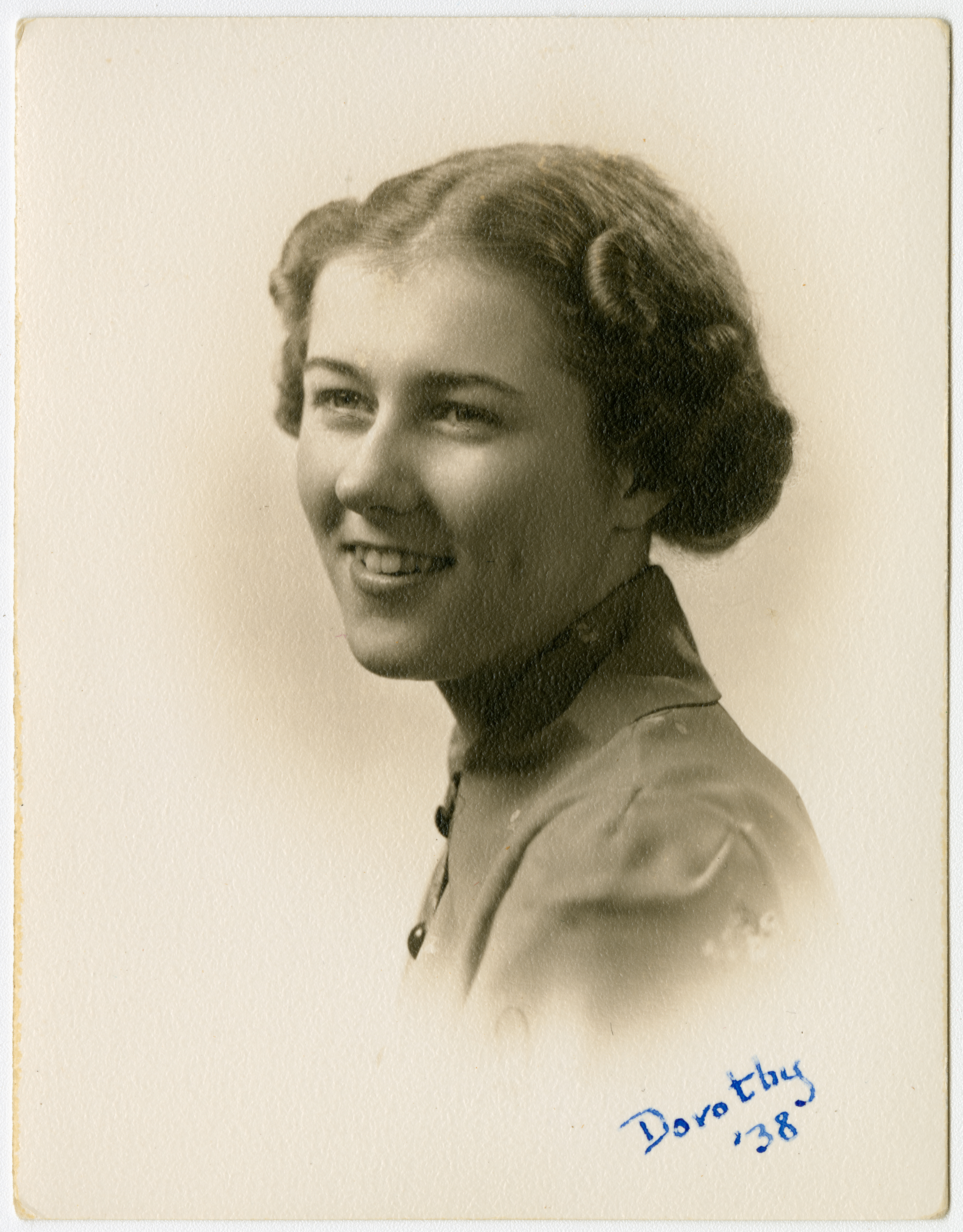 Senior portrait of a young woman from the Chicopee High School Class of 1938 showing head, shoulders and face with the shoulders and face turned to the left. She is looking away from the camera. Strong light illuminates her face. The subject is wearing a dark shirt in contrast to the background. A strong fade surrounds the subject. Writing on the bottom right of the print says "Dorothy '38."