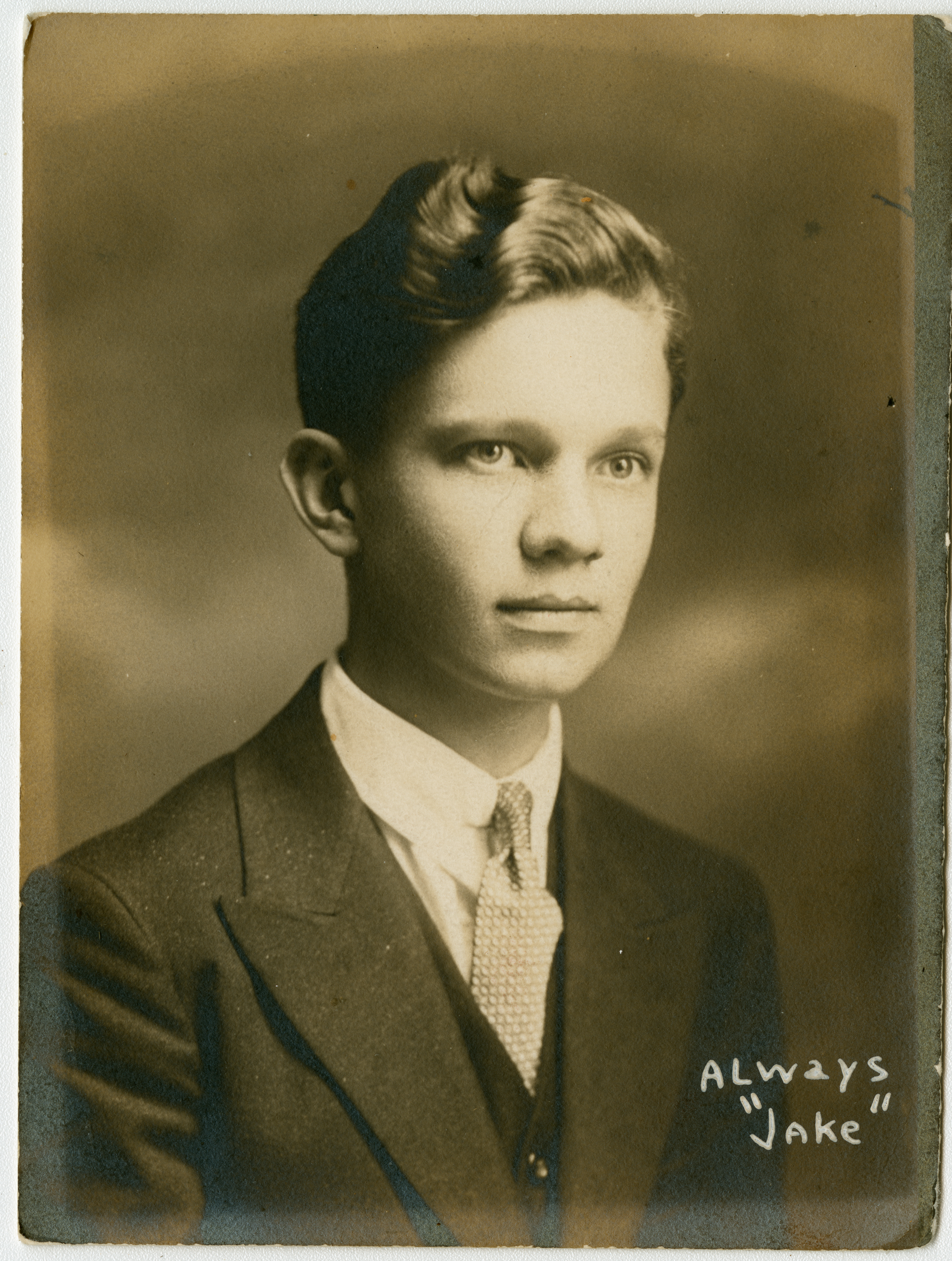 Senior portrait of a young man from the Chicopee High School Class of 1938 showing head, shoulders and face with the shoulders facing to the front. The subject is looking past the camera to the right. Soft light illuminates most of the face. The subject is wearing a dark suit with a white shirt and patterned tie. Writing on the bottom right of the print says "Always, "Jake"."