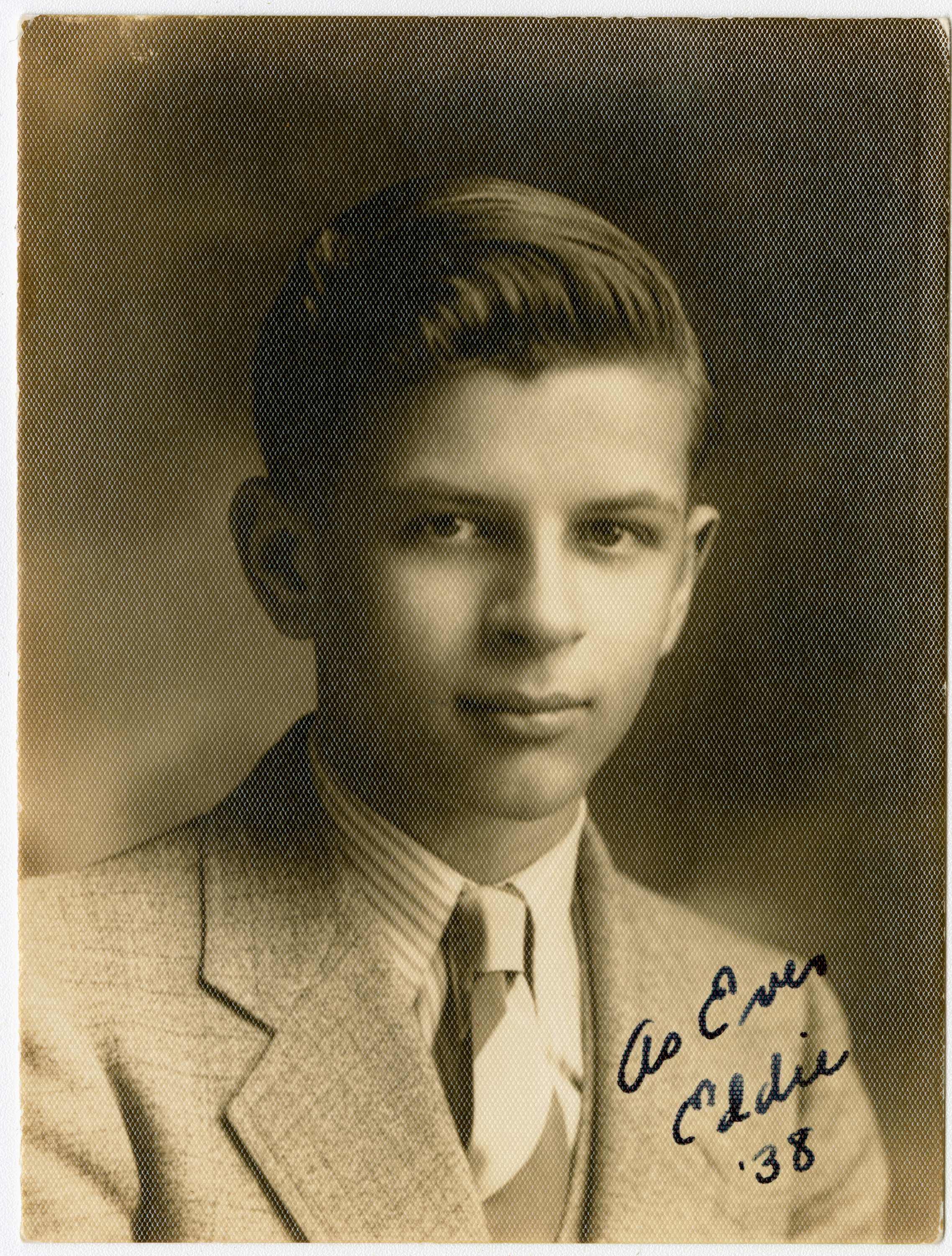 Senior portrait of a young man from the Chicopee High School Class of 1938 showing head, shoulders and face with the shoulders facing to the front. Soft light illuminates the most of the face. The subject is wearing a light jacket, a thin-striped shirt and wide-striped tie that contrast with the dark background. Writing on the bottom right of the print says "As Ever Eddie '38."