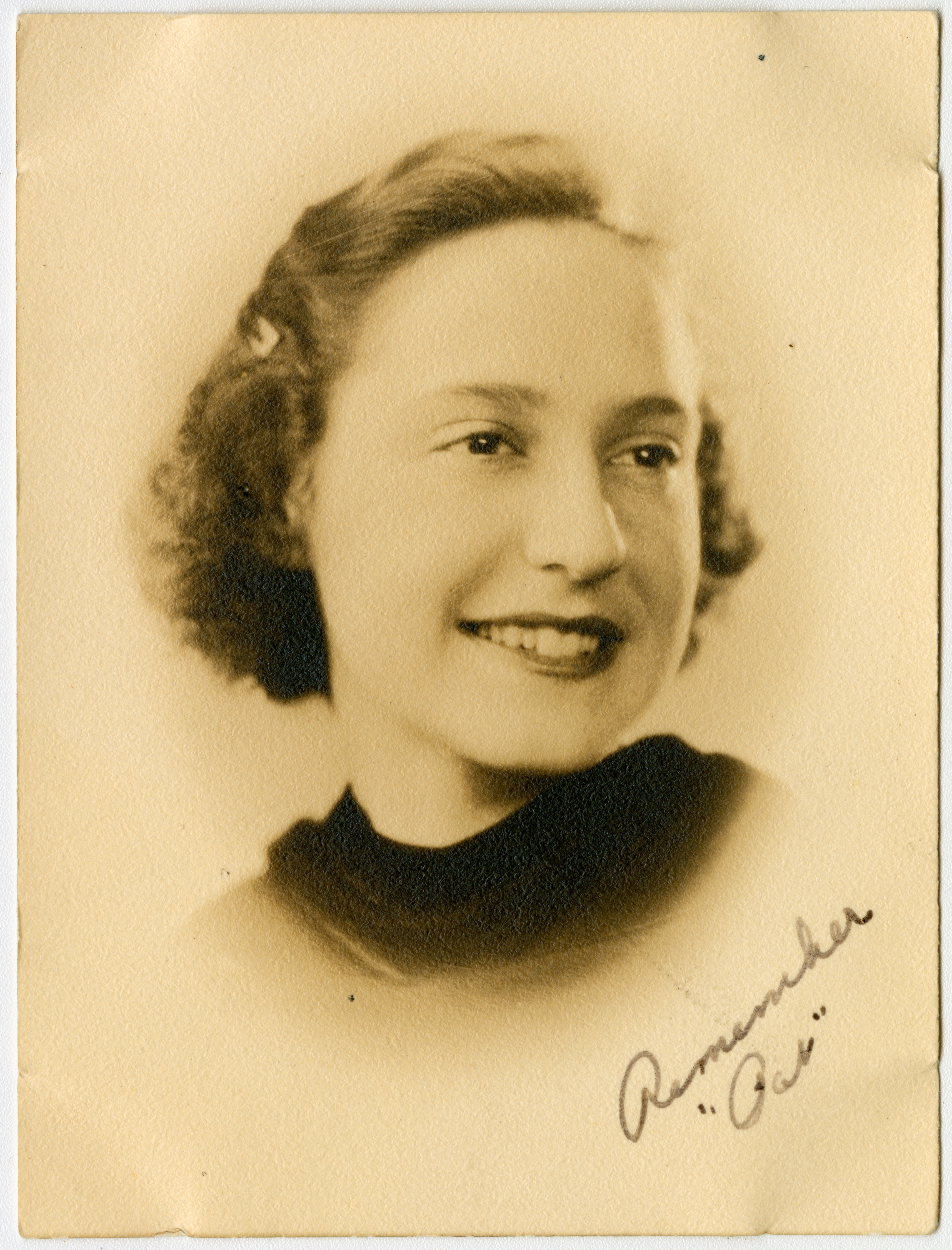 Senior portrait of a young woman from the Chicopee High School Class of 1938 showing head, shoulders and face . She is looking away from the camera to the right. Soft light illuminates her face and smile. The subject is wearing a dark shirt which contrasts with the background. Writing on the bottom right of the print says "Remember "Pat"."