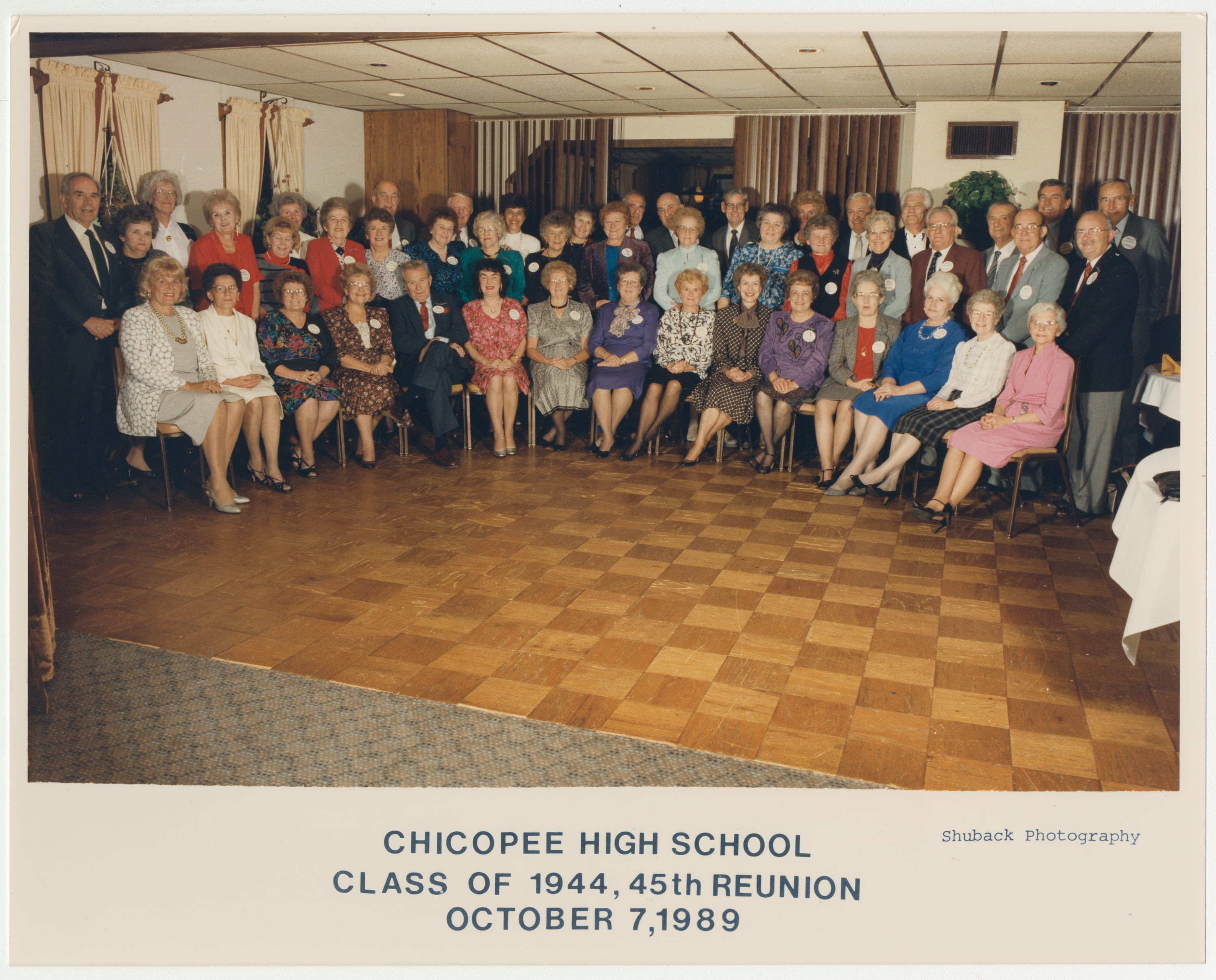 “Chicopee High School Class of 1944 45th Reunion Photo, 1989,” Chicopee Archives Online, accessed April 23, 2026, https://www.chicopeepubliclibrary.org/archives/items/show/9231.