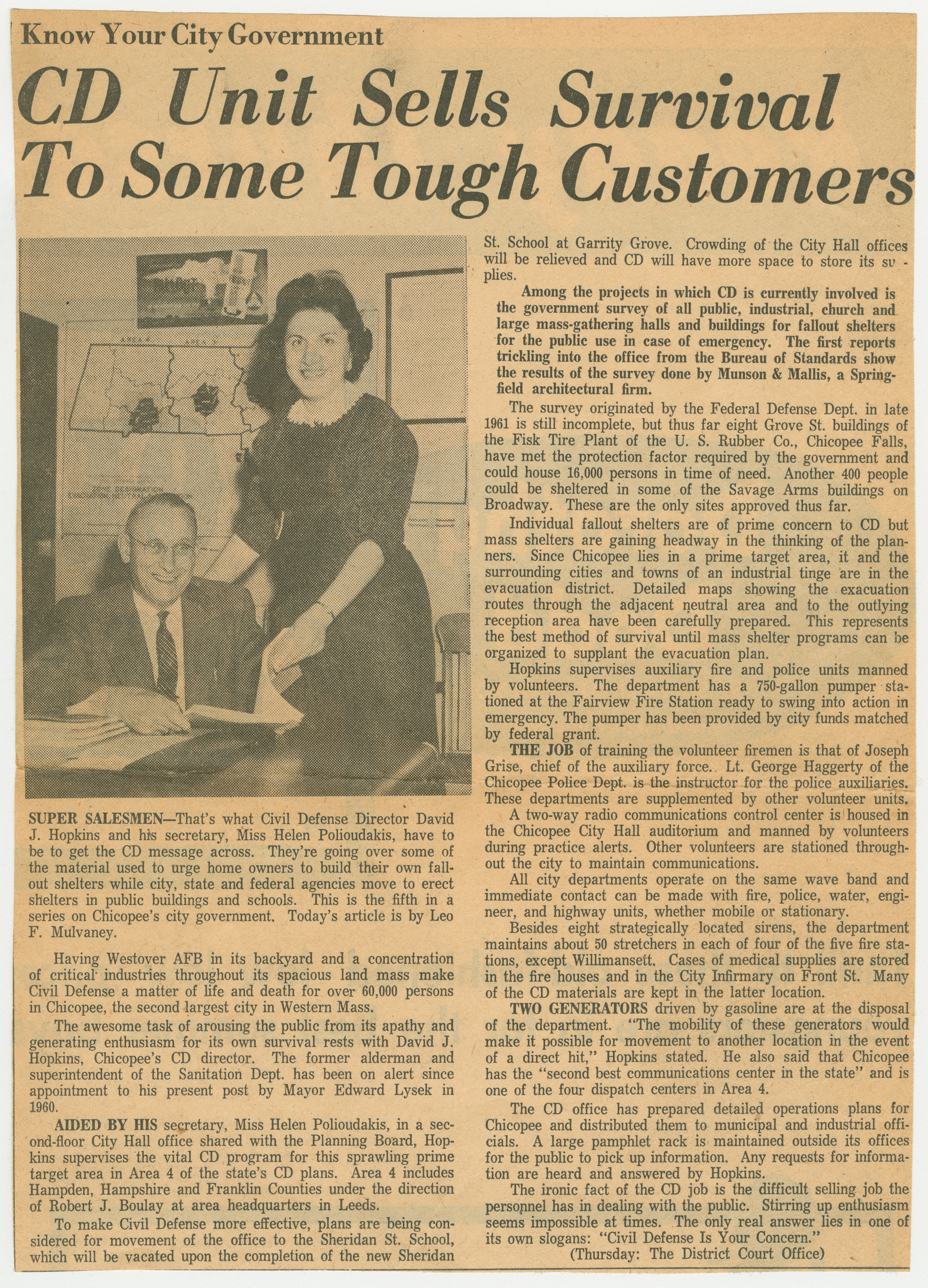“Newspaper Clipping about Chicopee Civil Defense including Helen Polioudakis,” Chicopee Archives Online, accessed April 23, 2026, https://www.chicopeepubliclibrary.org/archives/items/show/9234.