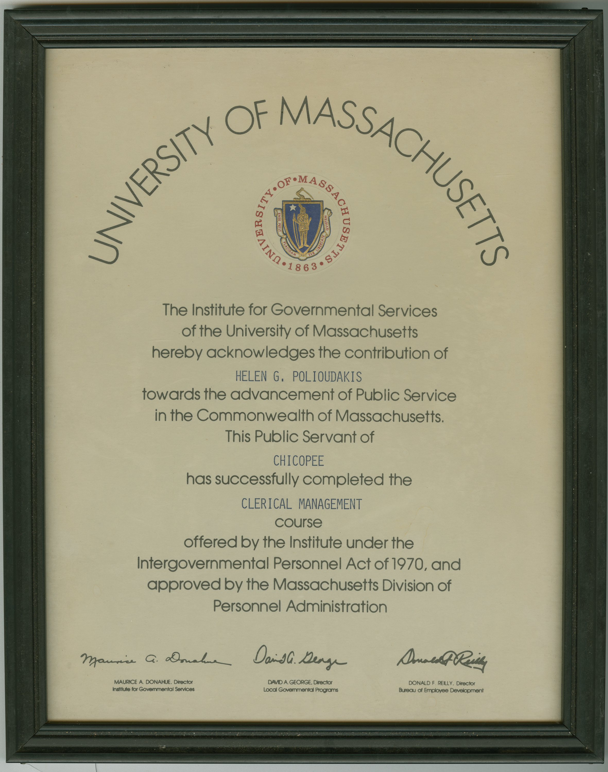 The Institute for Governmental Services of the University of Massachusetts hereby acknowledges the contribution of Helen G. Polioudakis toward teh advancement of Public Service in the Commonwealth of Massachusetts. This Public Servant of Chicopee has successfully completed the Clerical Management course.