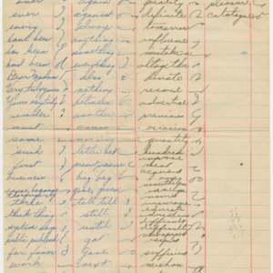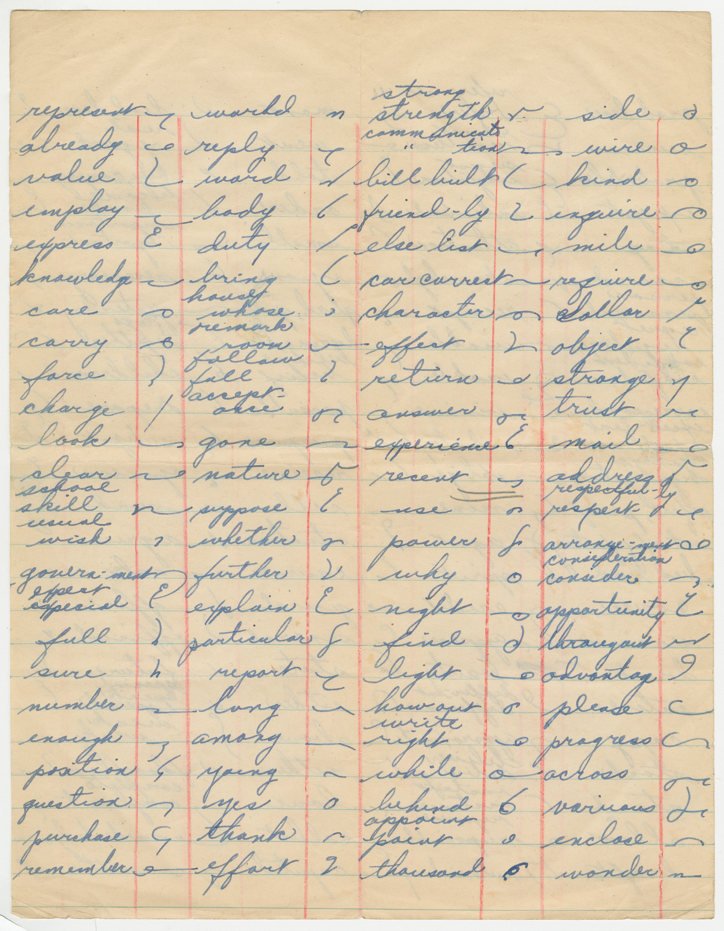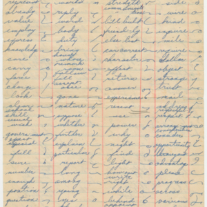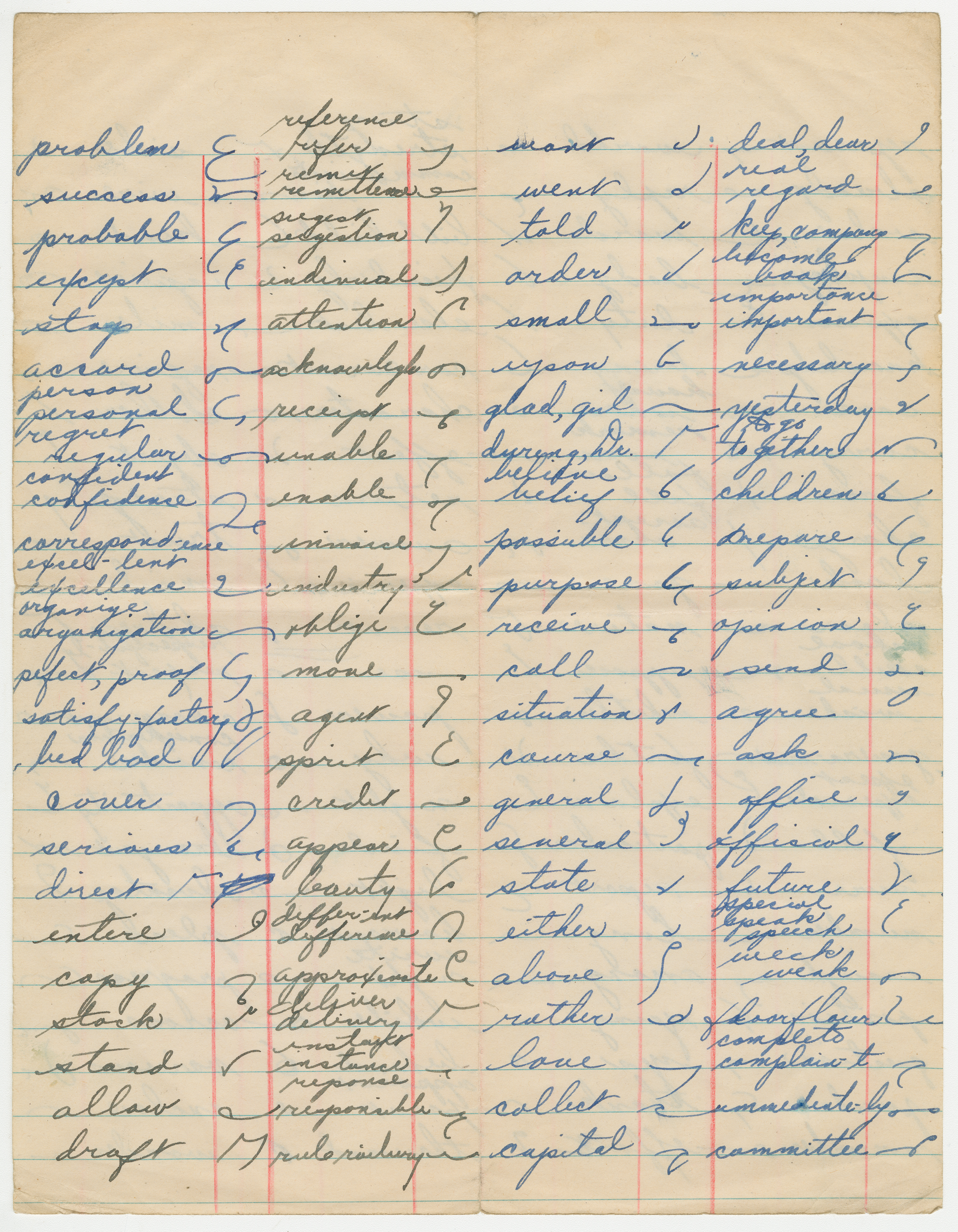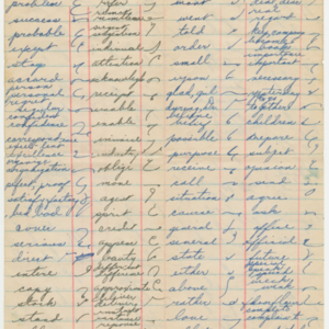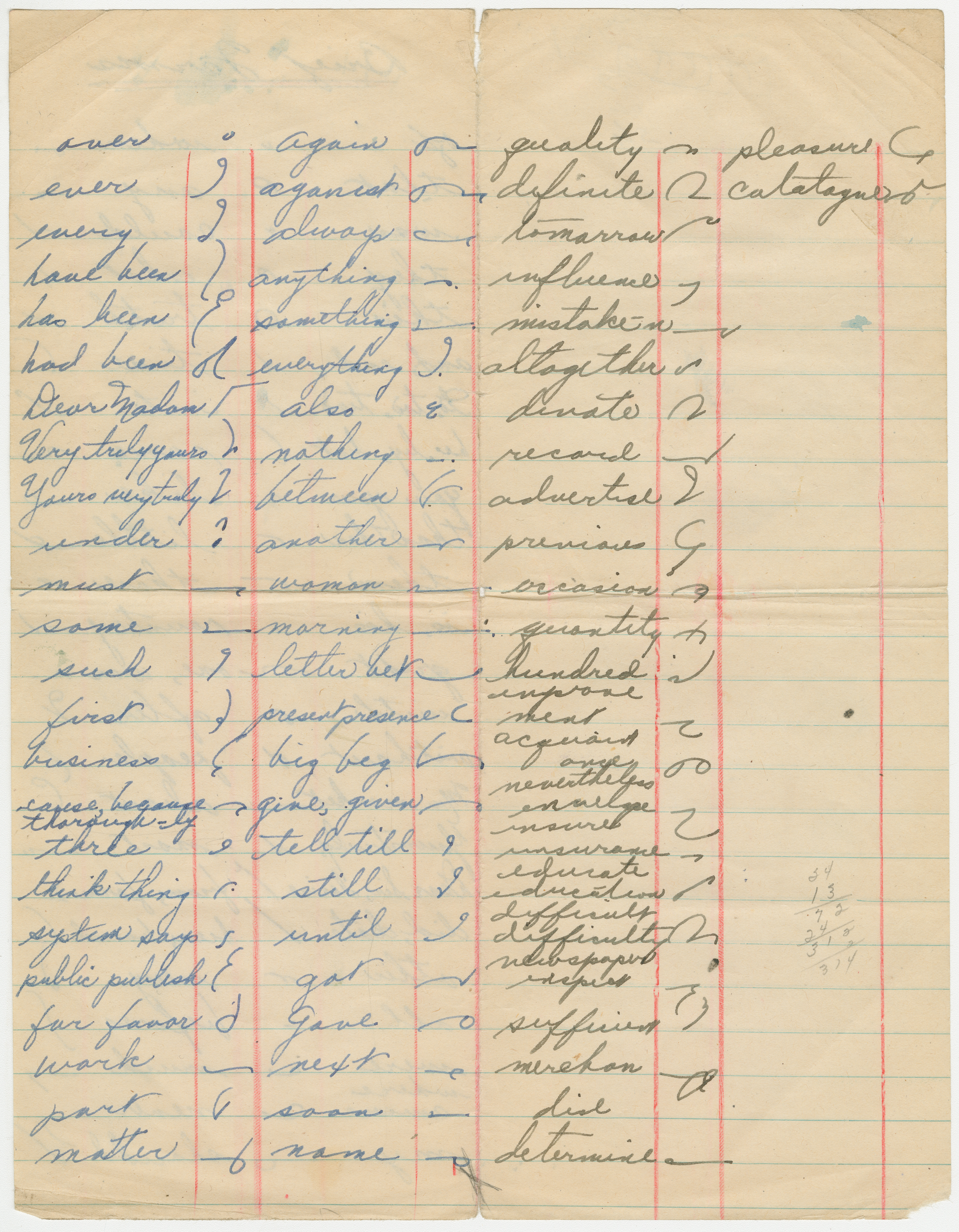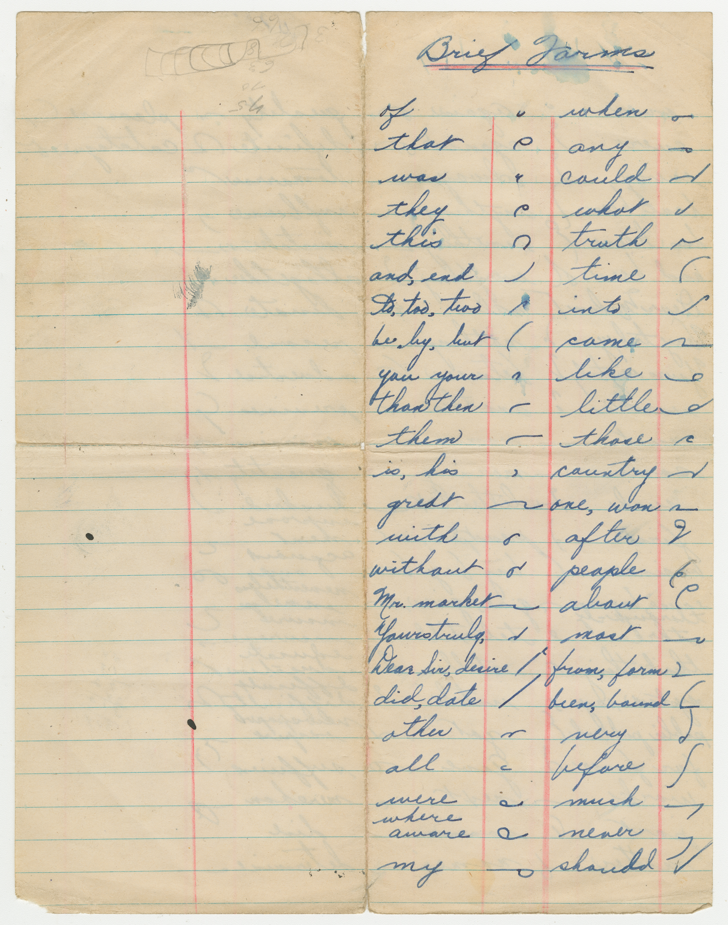 Four page document of "Brief notes" with shorthand information in column form showing English word and coresponding shorthand symbols. Found inside Gregg Shorthand book.
