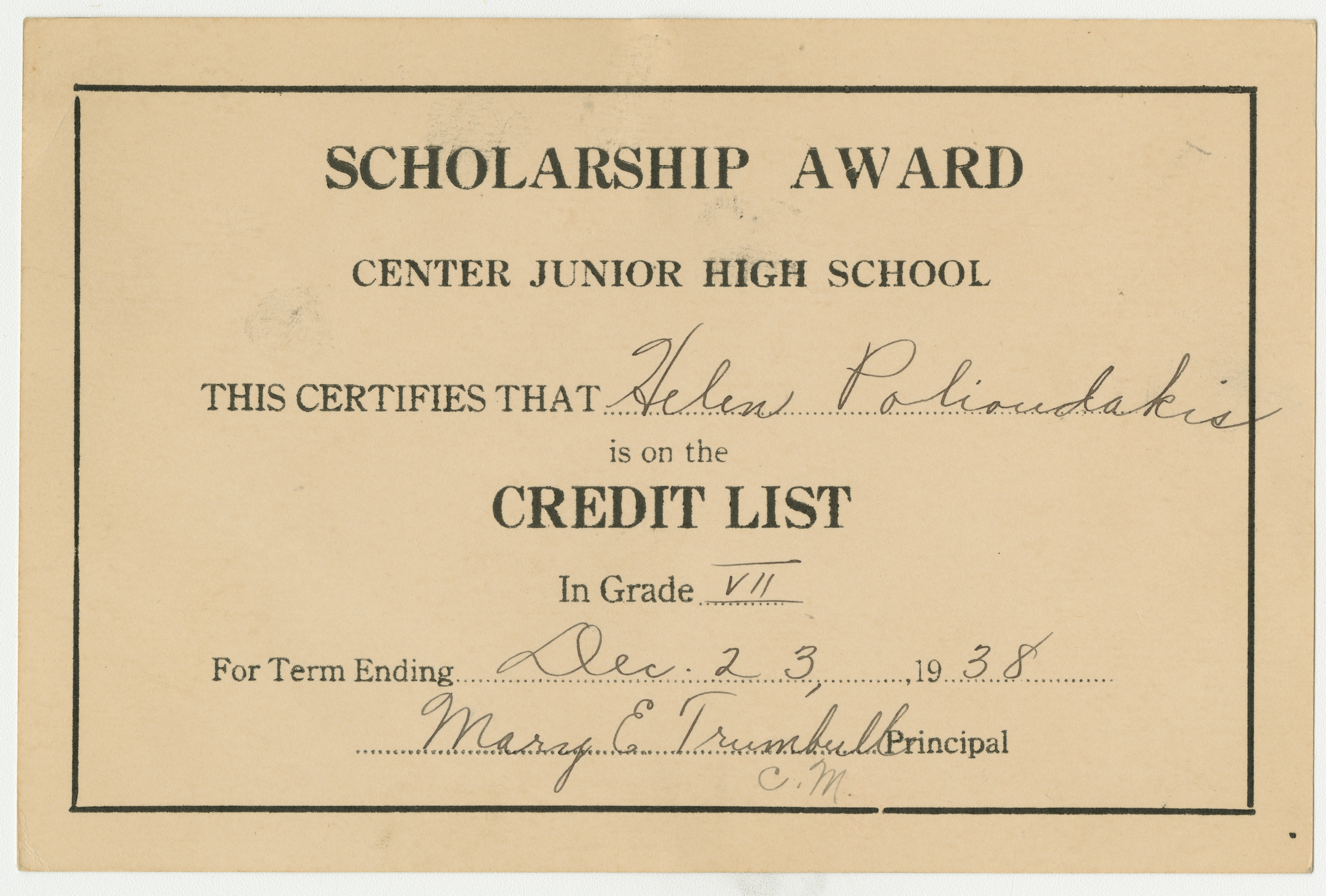 Center Junior High School Scholarship Award certifies that Helen Polioudakis is on the Credit List in Grade 7 for Term Ending December 23, 1938. Signed by Principal: Mary E. Trumbull C.M.