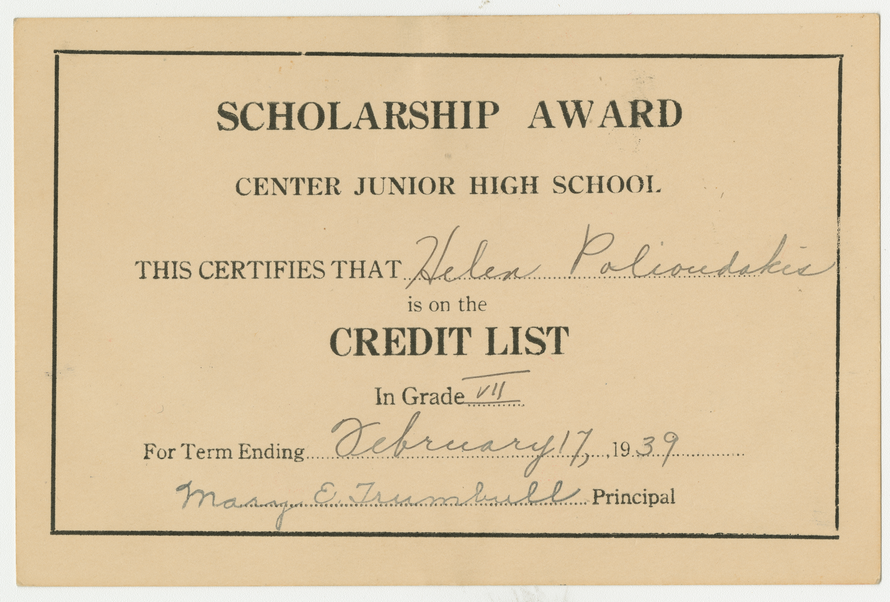 Center Junior High School Scholarship Award certifies that Helen Polioudakis is on the Credit List in Grade 7 for Term Ending February 17, 1938. Signed by Principal: Mary E. Trumbull