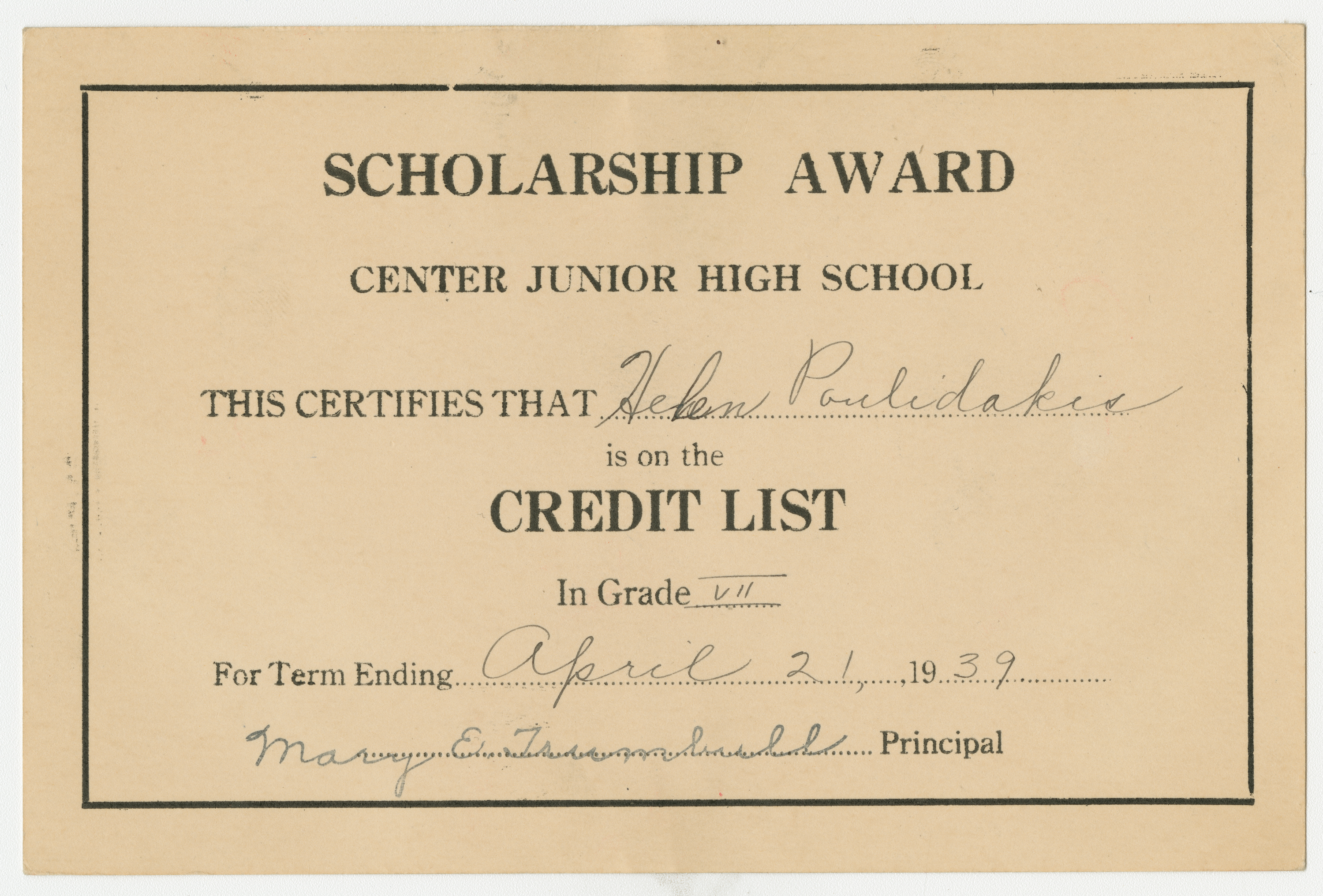 Center Junior High School Scholarship Award certifies that Helen Polioudakis is on the Credit List in Grade 7 for Term Ending April 21, 1939. Signed by Principal: Mary E. Trumbull