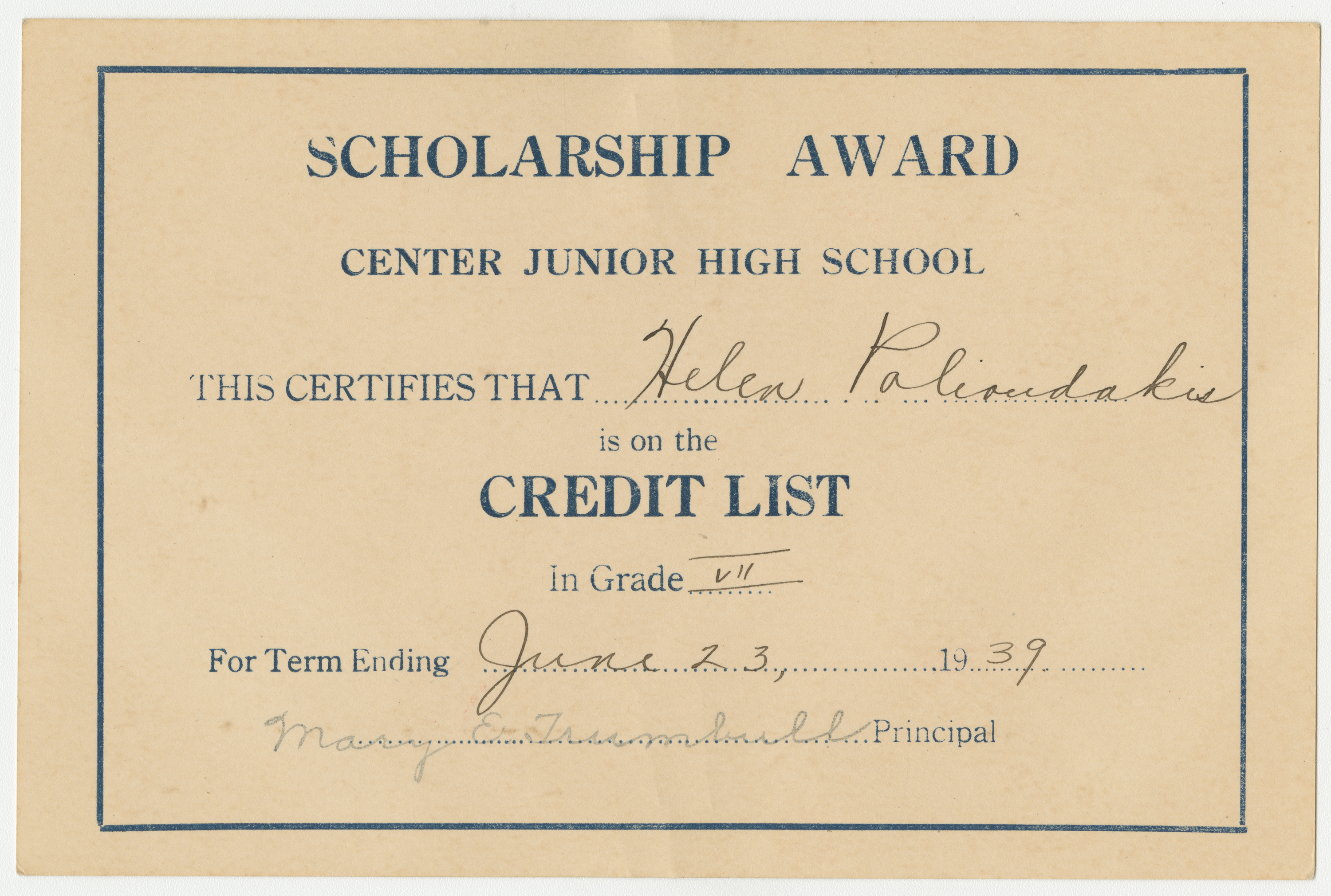 Center Junior High School Scholarship Award certifies that Helen Polioudakis is on the Credit List in Grade 7 for Term Ending June 23, 1938. Signed by Principal: Mary E. Trumbull
